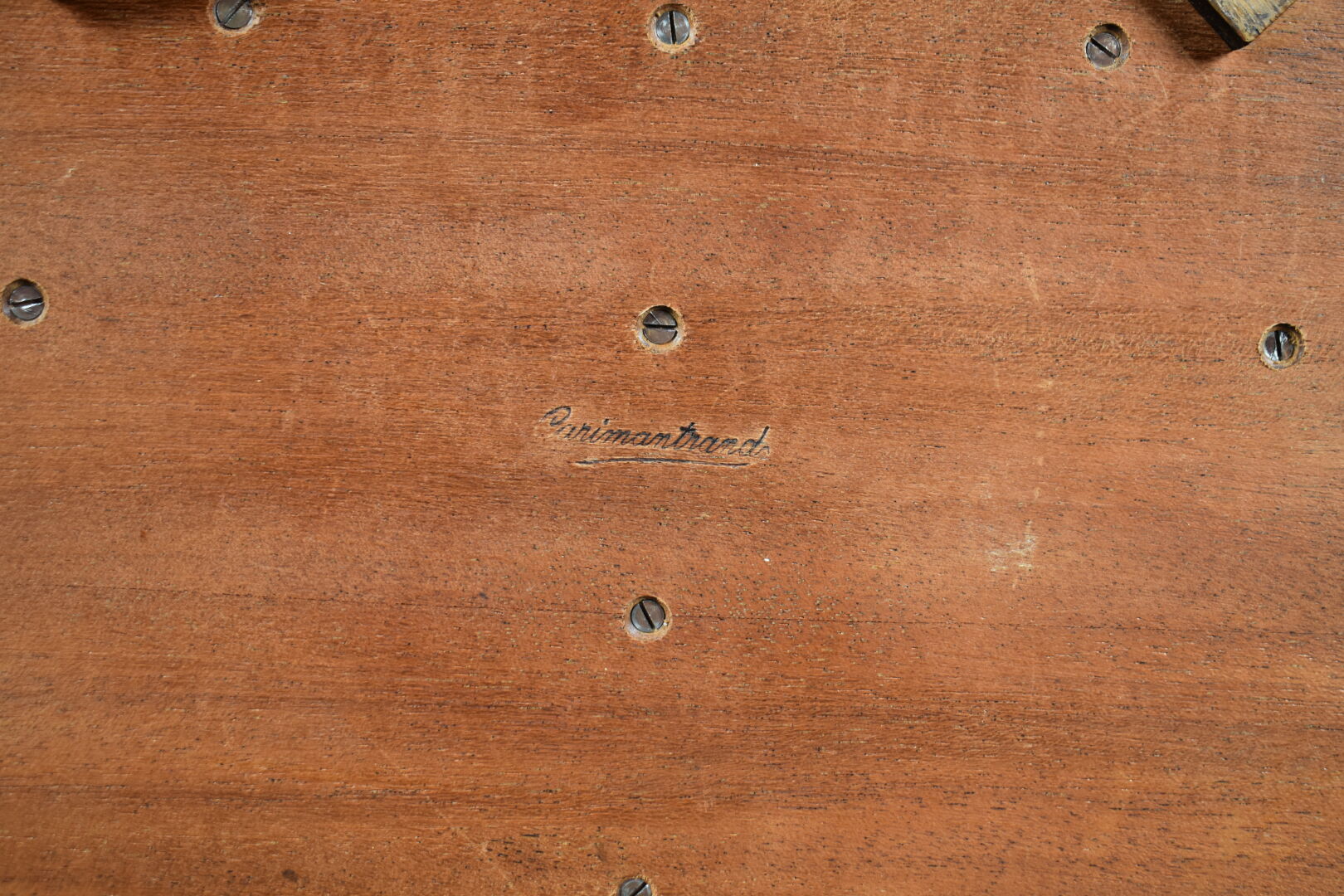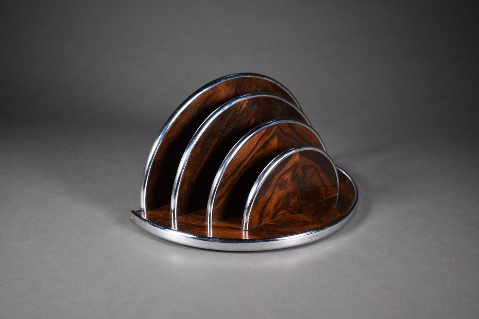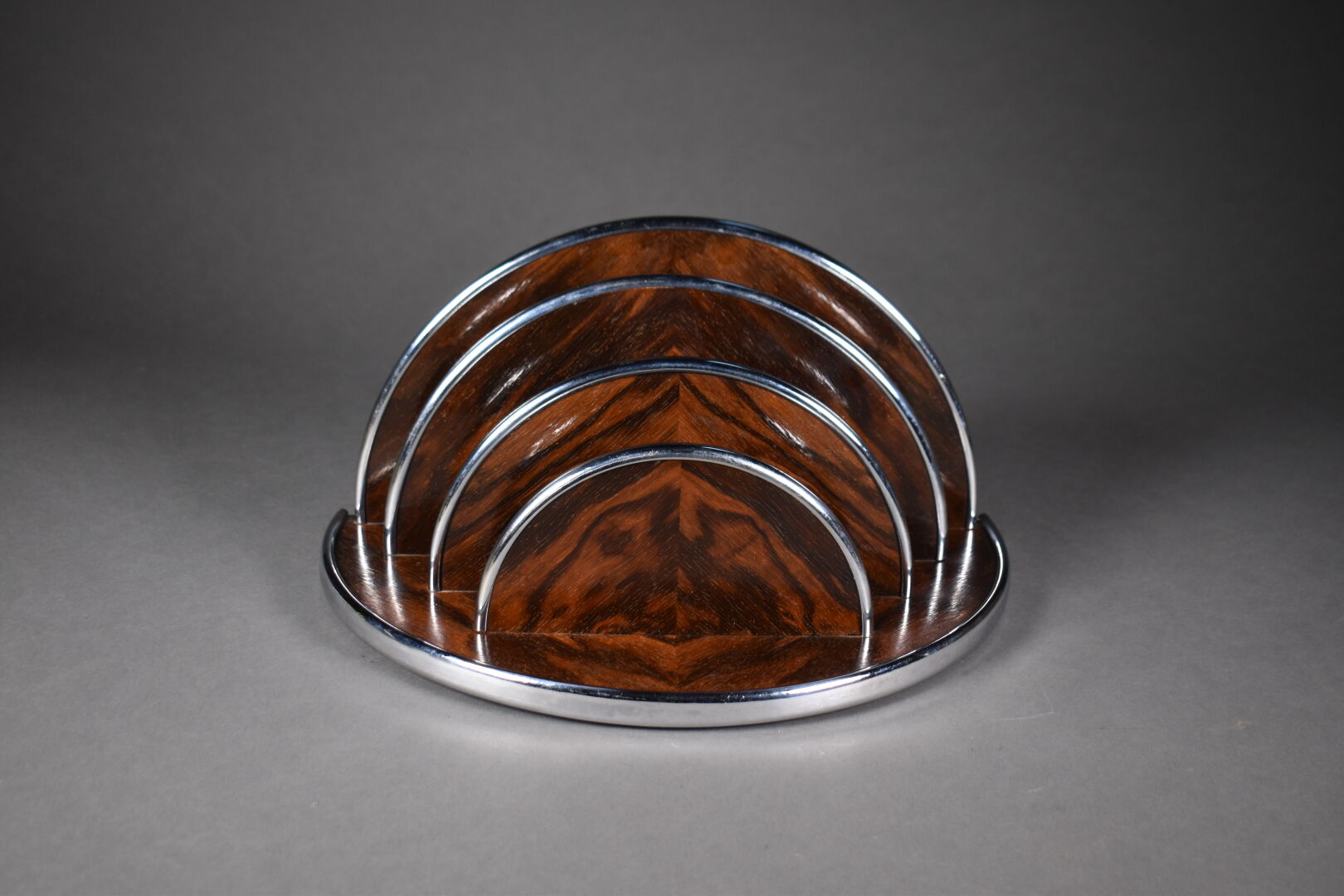 Maison CARIMANTRAND. Porte-courrier demi-lune en palissandre cerclé de métal argenté. Signée au dos. Vers 1930. Haut. : 19,5 cm – Larg. : 37 cm – Prof. : 20,5 cm.