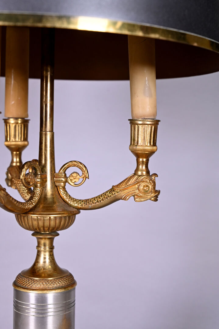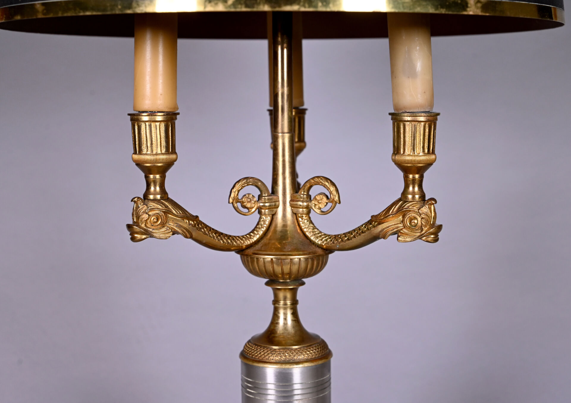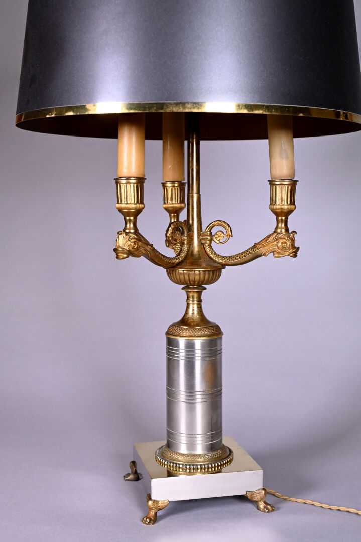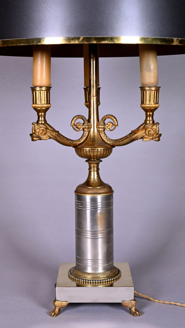 MAISON CHARLES. Lampe à poser en bronze doré et argenté à trois bras de lumière en forme de dauphins. Le fût cylindrique, la base carrée à piétement griffe. Abat-jour en laiton partiellement patiné brun. Signée. Haut. : 68 cm.