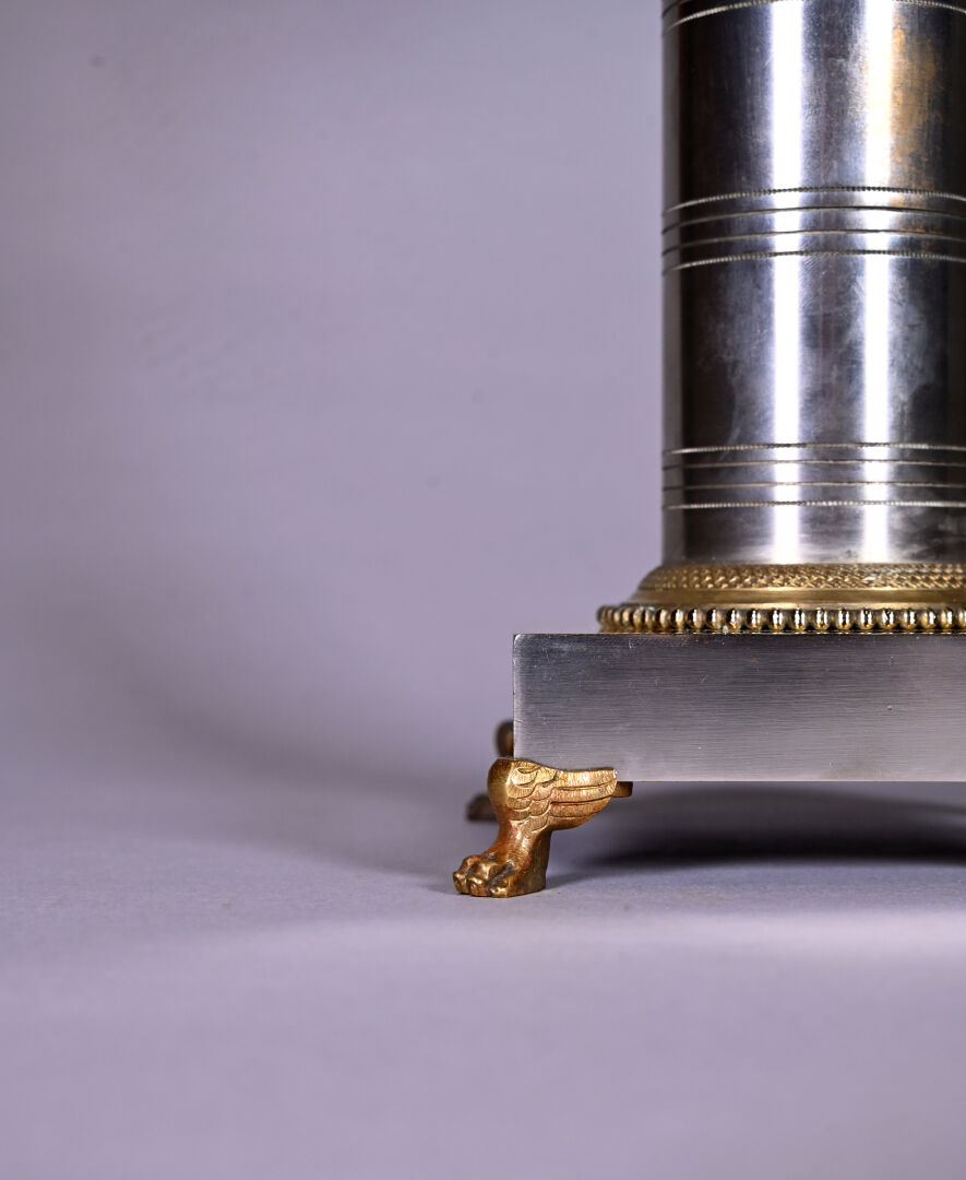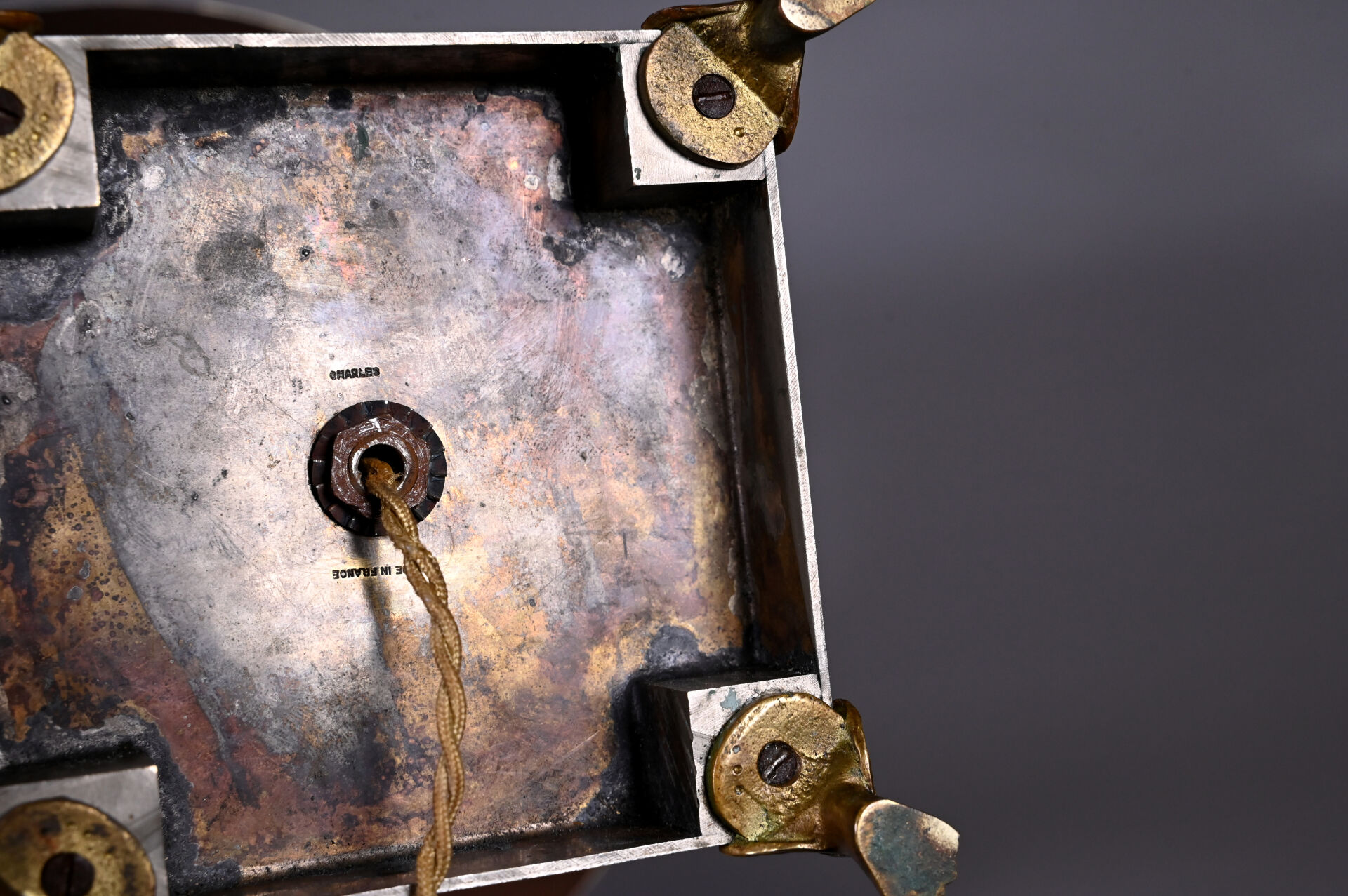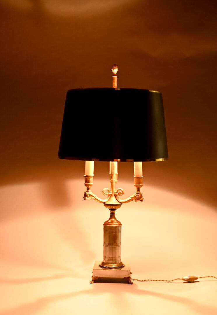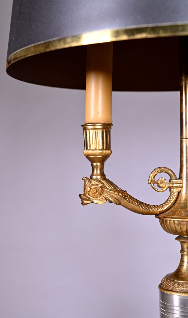MAISON CHARLES. Lampe à poser en bronze doré et argenté à trois bras de lumière en forme de dauphins. Le fût cylindrique, la base carrée à piétement griffe. Abat-jour en laiton partiellement patiné brun. Signée. Haut. : 68 cm.