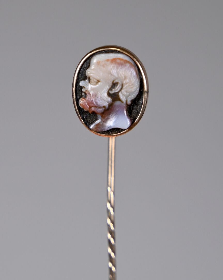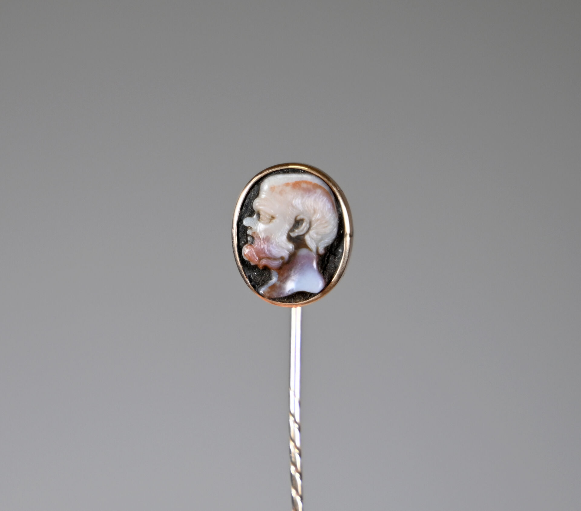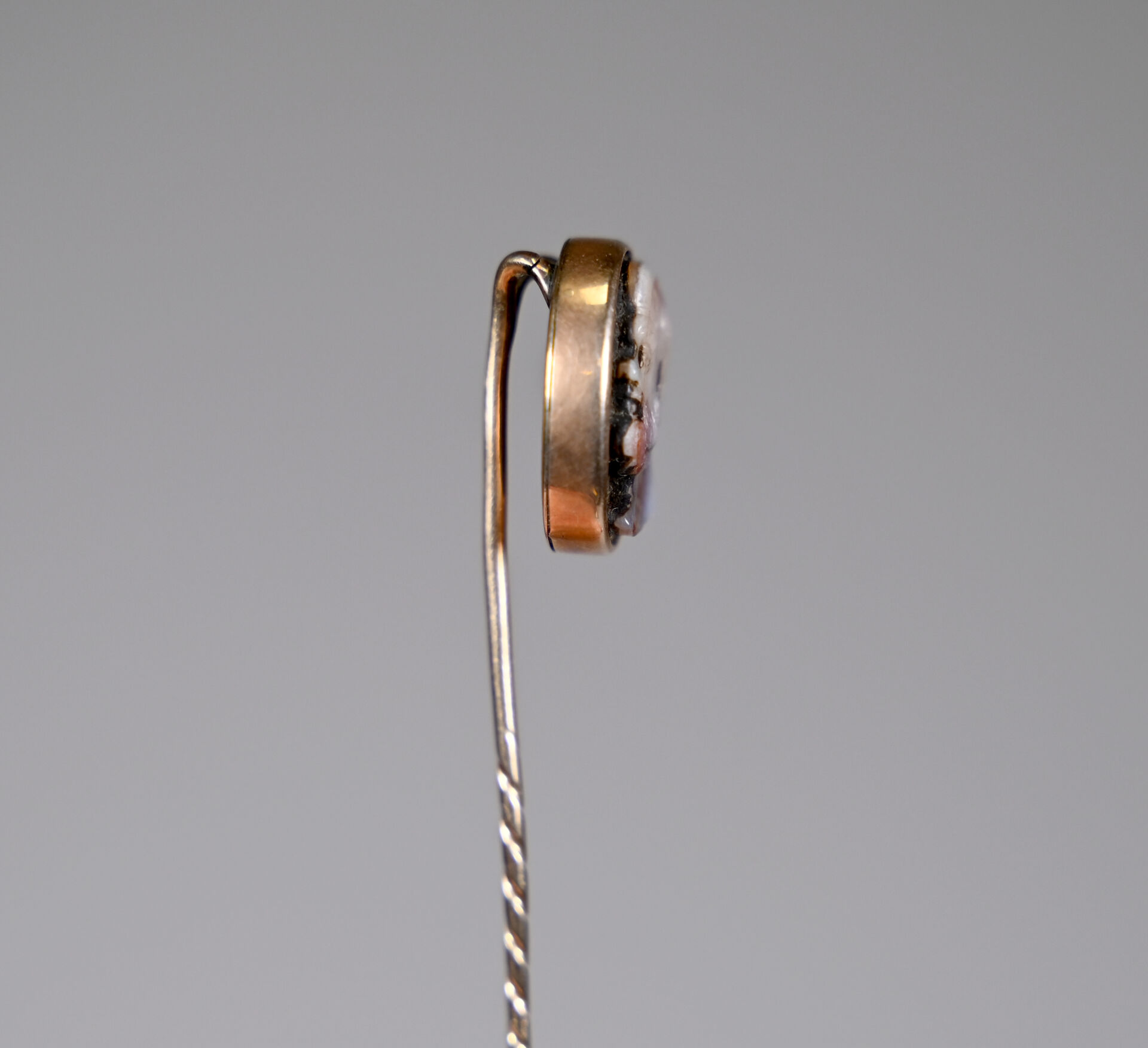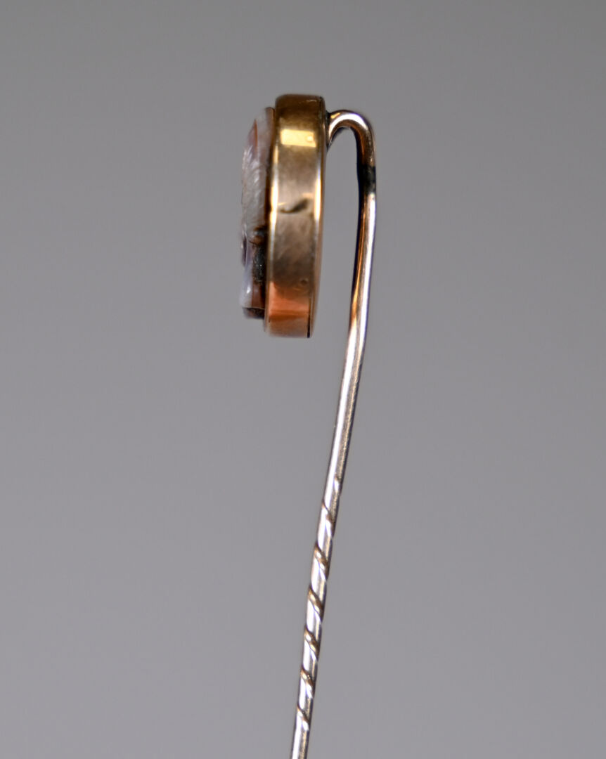 Maison HOWELL, JAMES AND CO LONDRS. Epingle à cravate en or bas titre (375/1000e ? ) présentant un profil d’homme en camée agate bicolore . Epingle légèrement tordue. Epoque Victorienne. Long. : 8 cm Poids brut. : 5,05 g. Ecrin d’origine de la maison.
