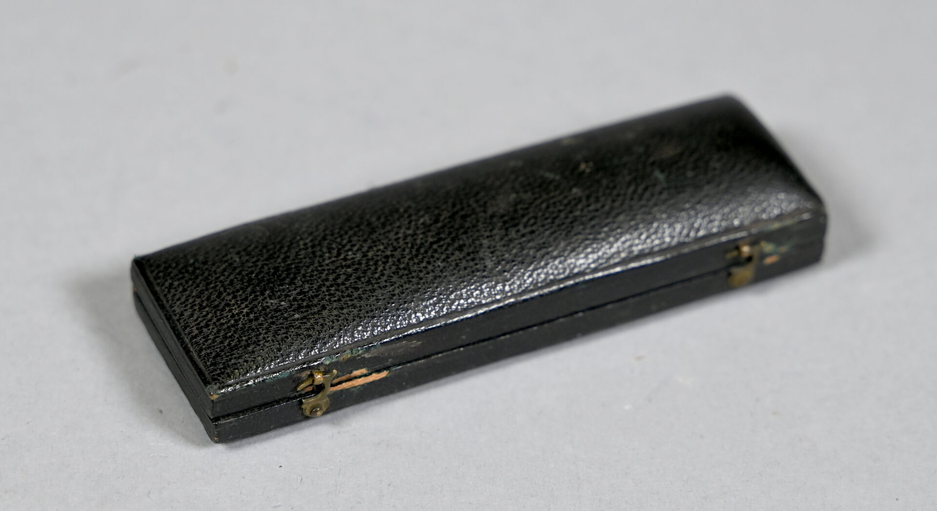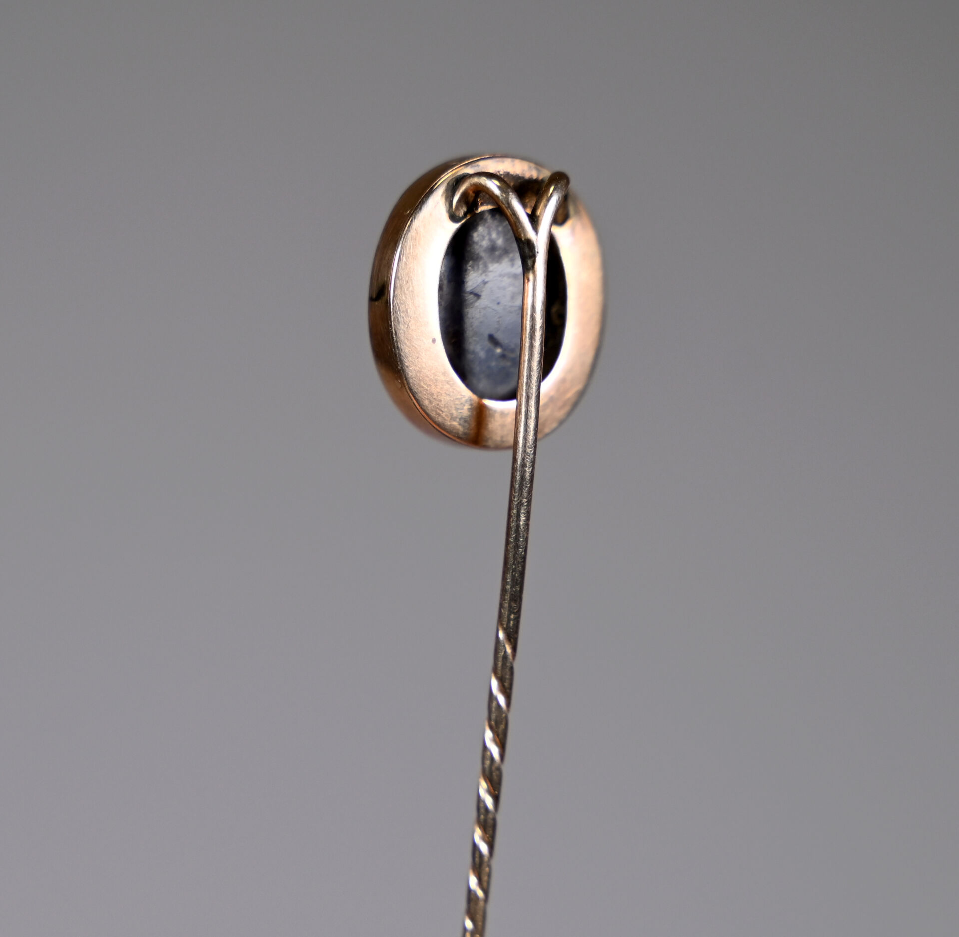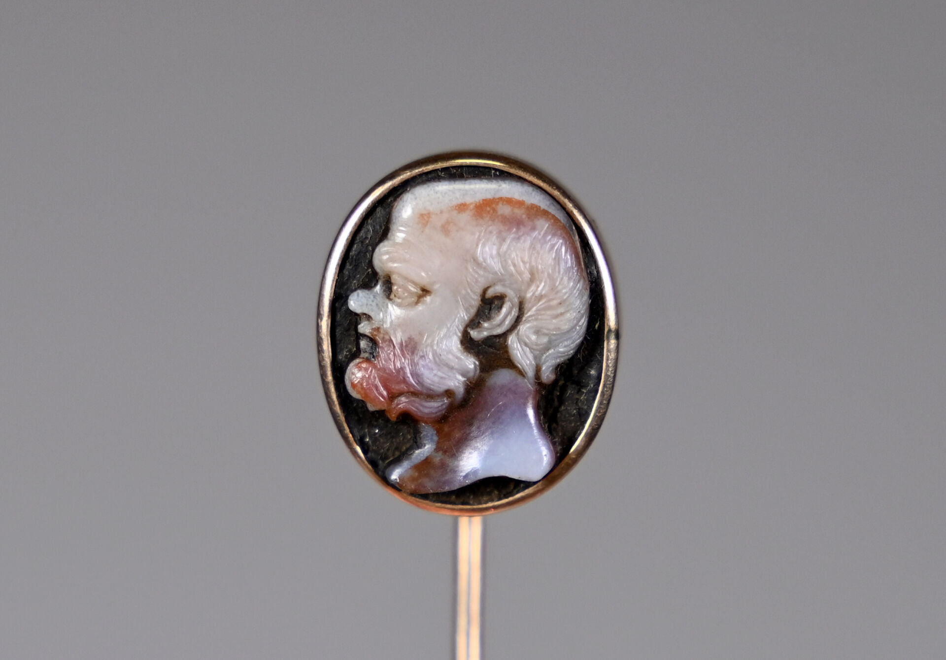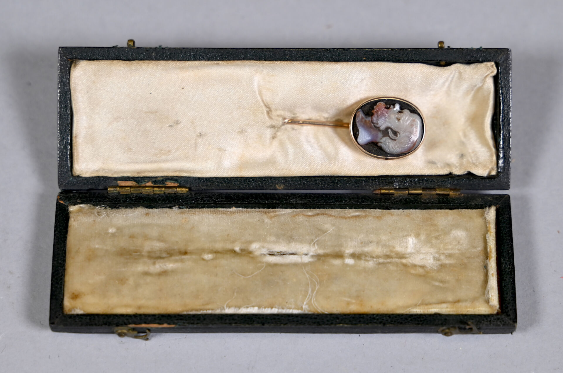 Maison HOWELL, JAMES AND CO LONDRS. Epingle à cravate en or bas titre (375/1000e ? ) présentant un profil d’homme en camée agate bicolore . Epingle légèrement tordue. Epoque Victorienne. Long. : 8 cm Poids brut. : 5,05 g. Ecrin d’origine de la maison.