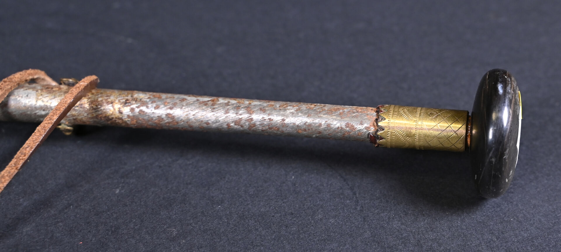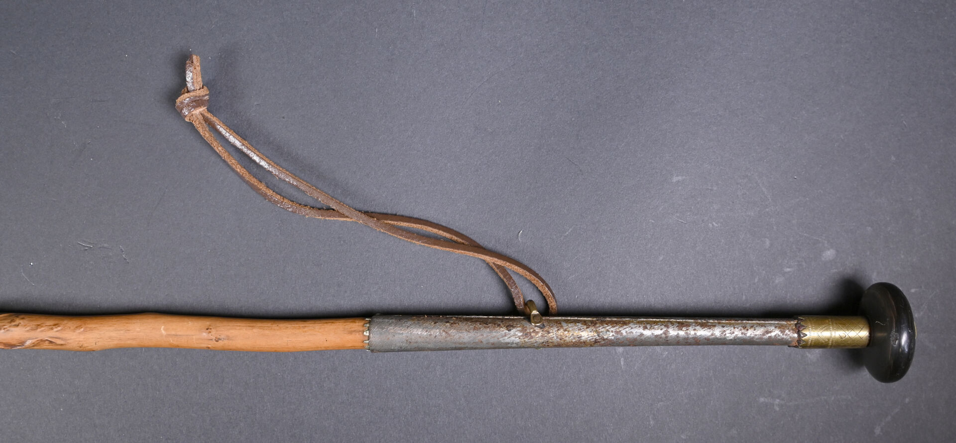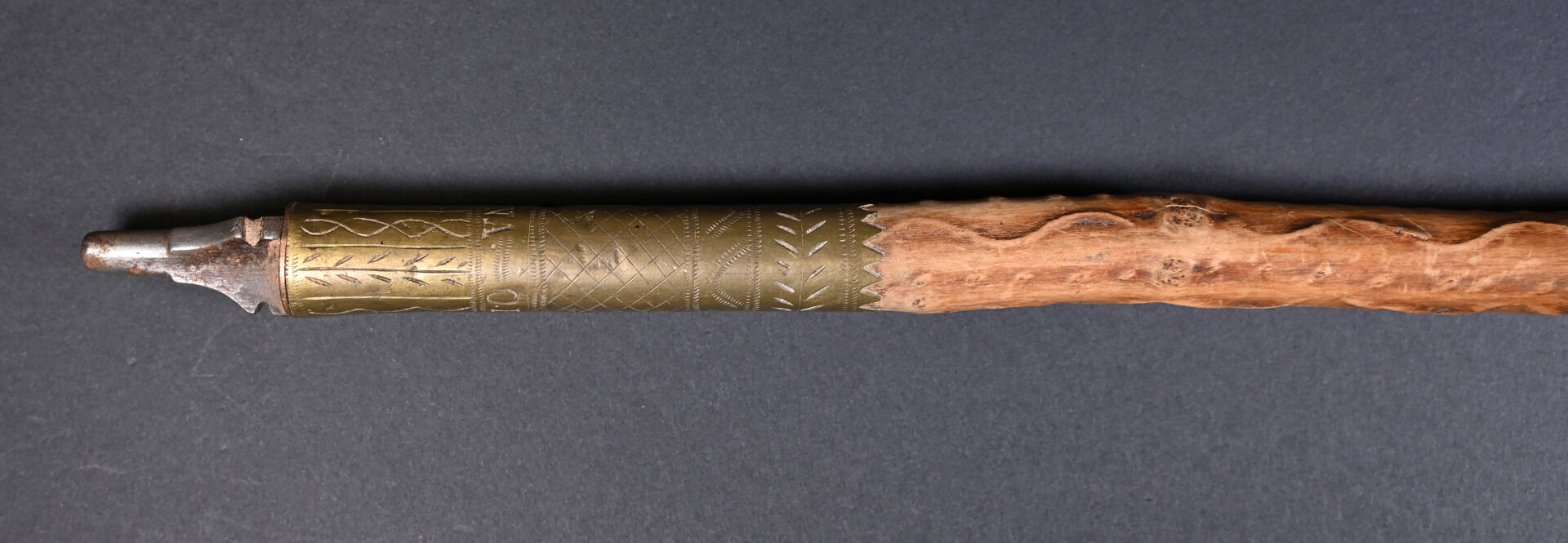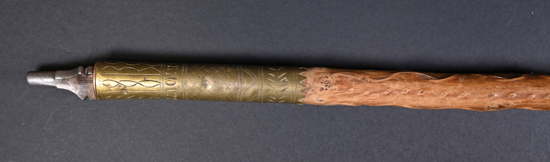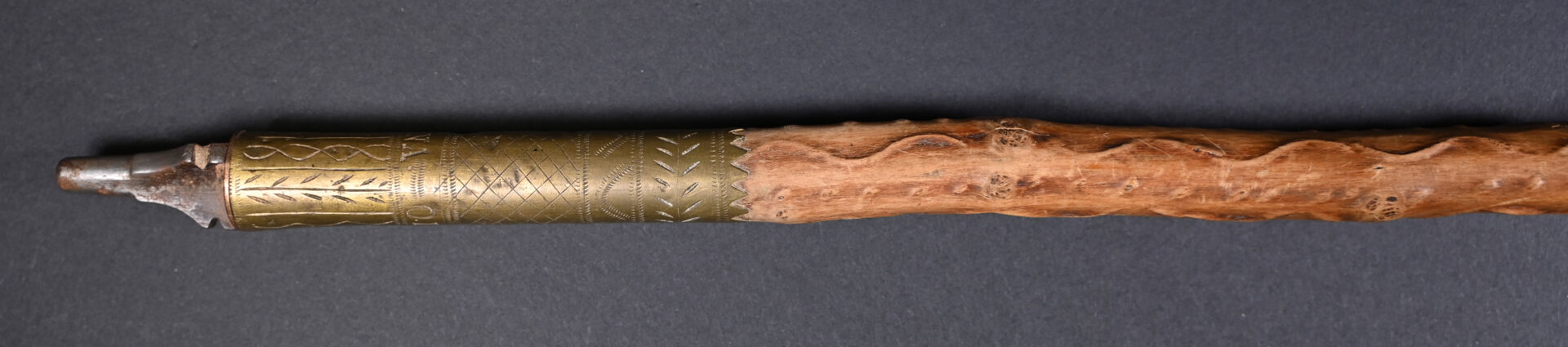 Makila Franc-Maçonnique en laiton, étain et pommeau en corne. Long. : 91,5 cm.
