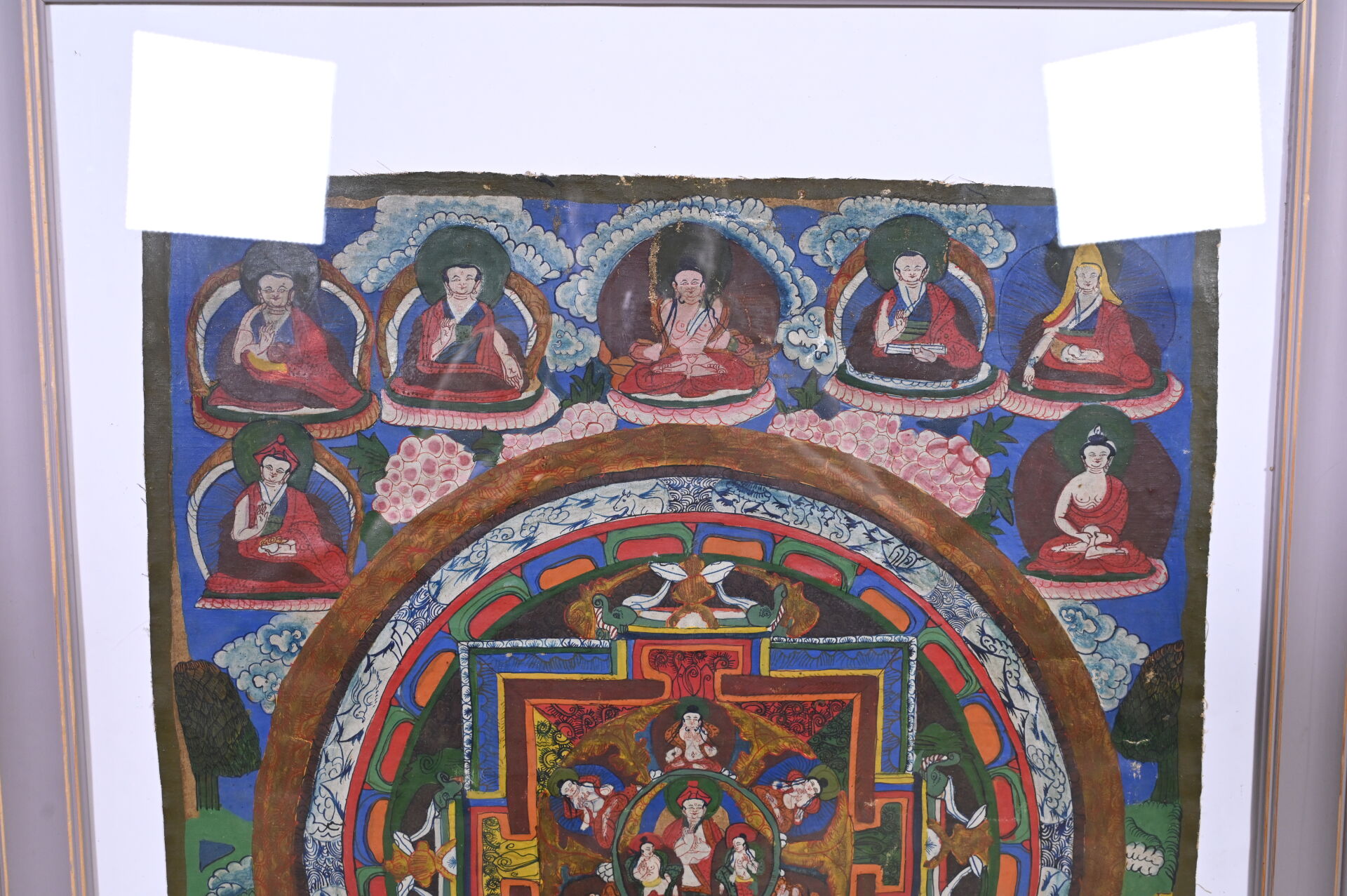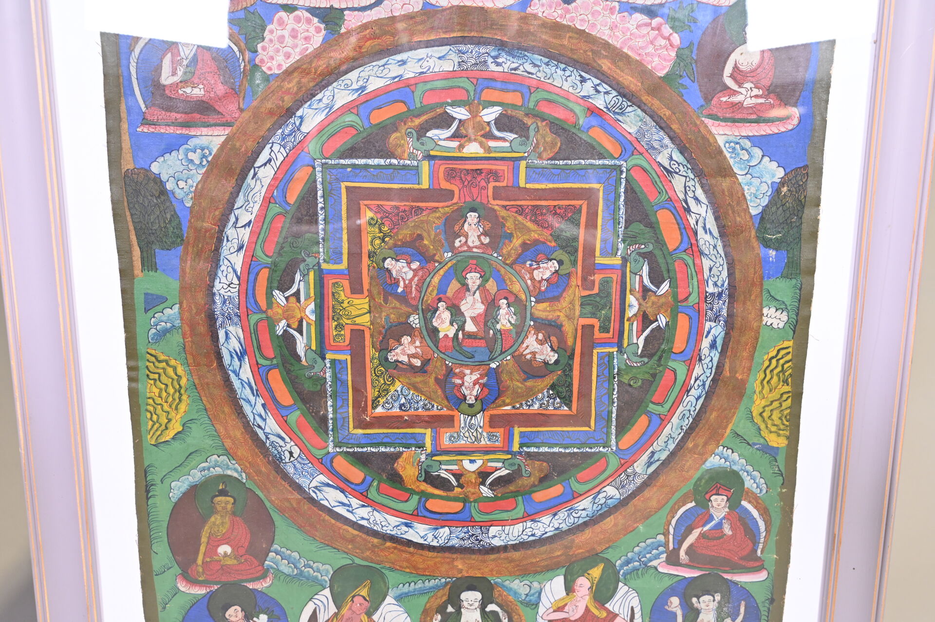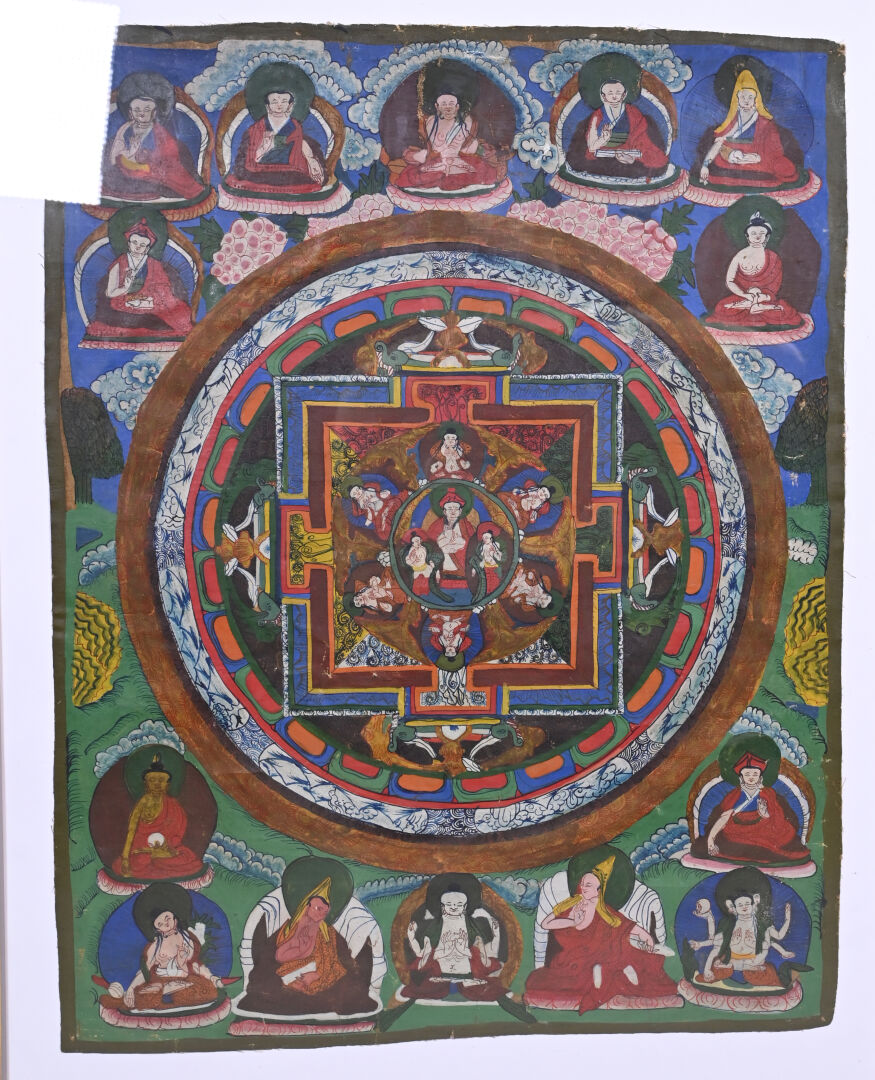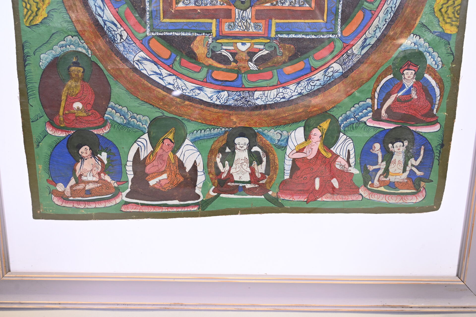 Mandala représentant en son centre Padmasambhava entouré de bouddhas et boddhisattvas. Tibet, XXe siècle. 55 x42 cm.