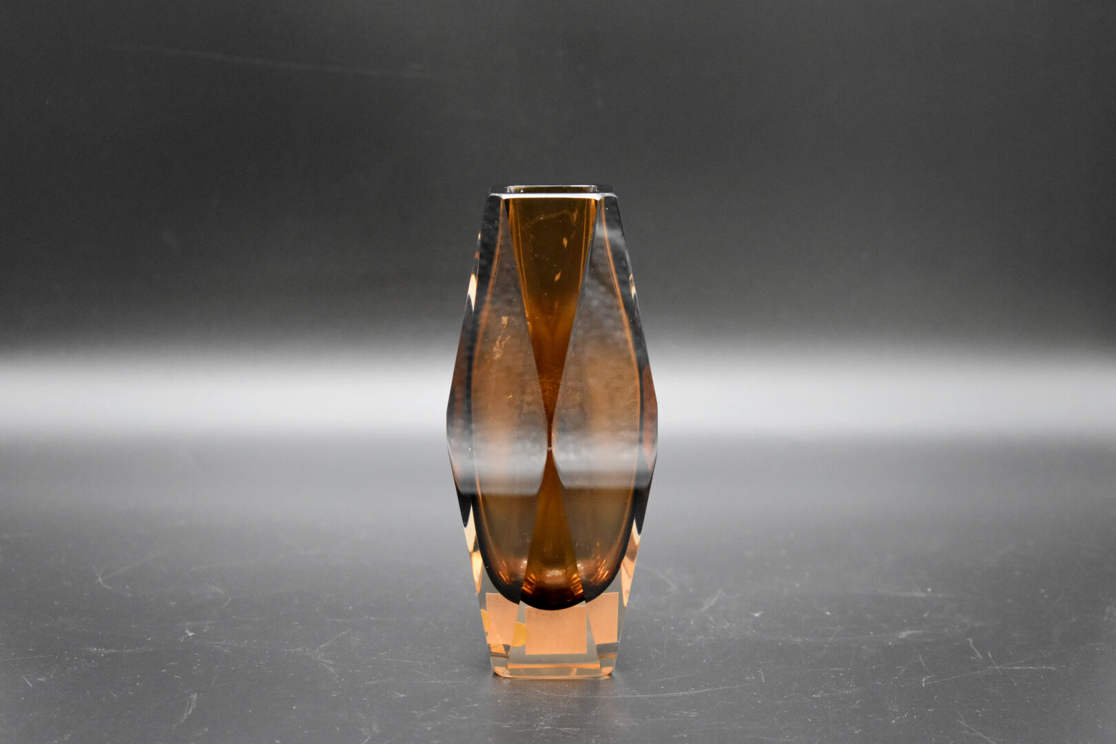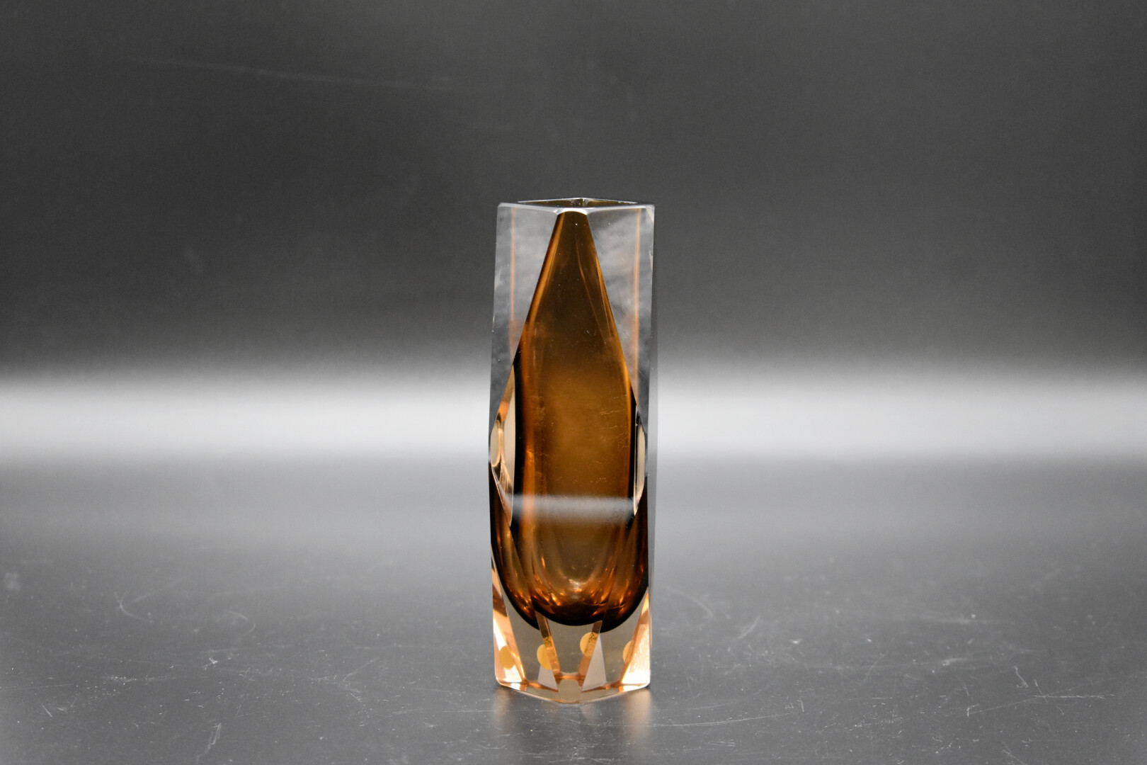 MANDRUZZATO à Murano. Vase sommerso modèle « gotham » en verre clair et chocolat (un éclat à la base). Haut. : 15,5 cm.