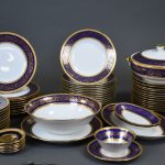 Manufacture LANTERNIER & Cie à Limoges. Partie de service de table d’apparat en porcelaine à bordure bleue de Sèvres et or. L’aile ornée de rinceaux et liseré or. Il comprend 22 assiettes plates, 12 assiettes creuses, 12 assiettes à entremets, 2 plats de service, un circulaire, un ovale, un saladier, deux raviers, une coupe à fonds solidaire, un légumier, 6 tasses et 6 sous-tasses. Marqué.