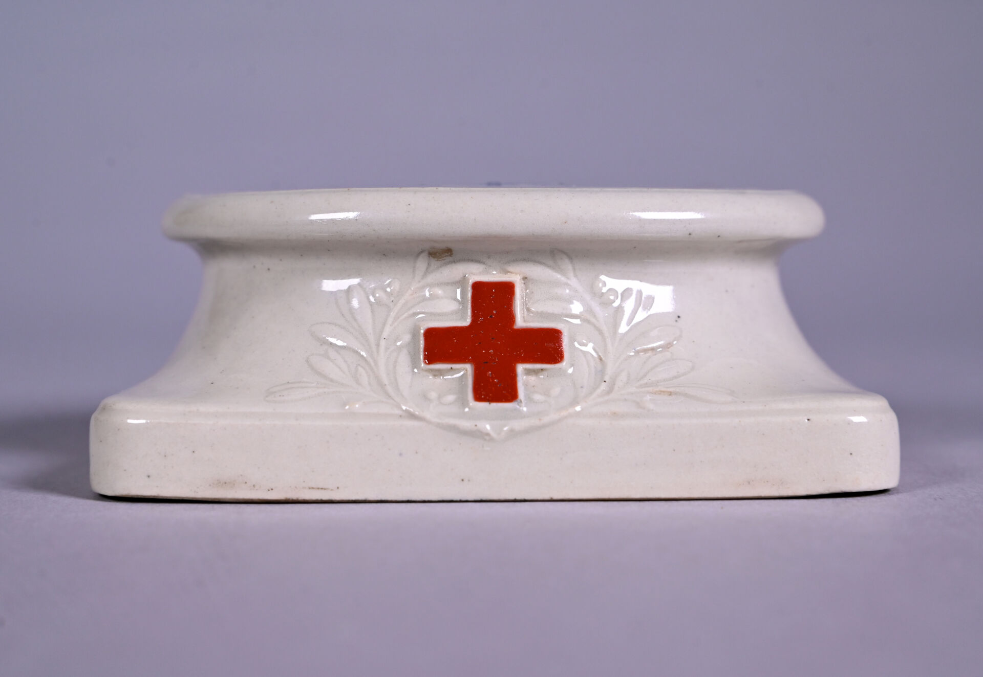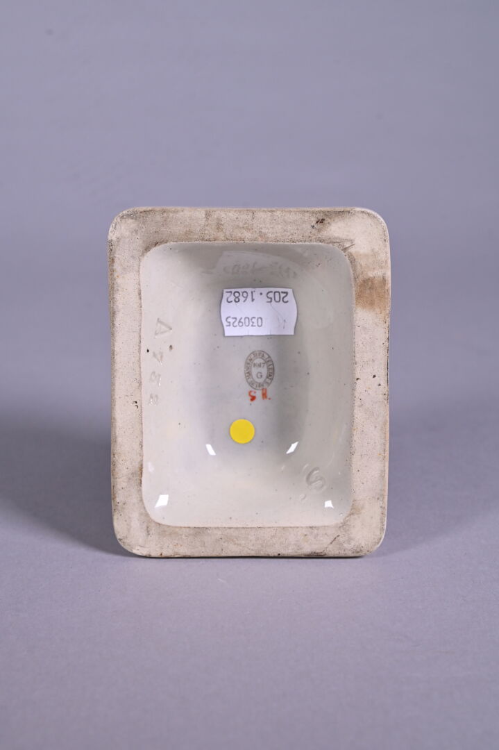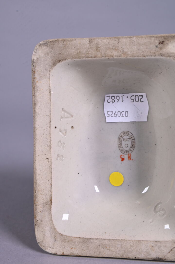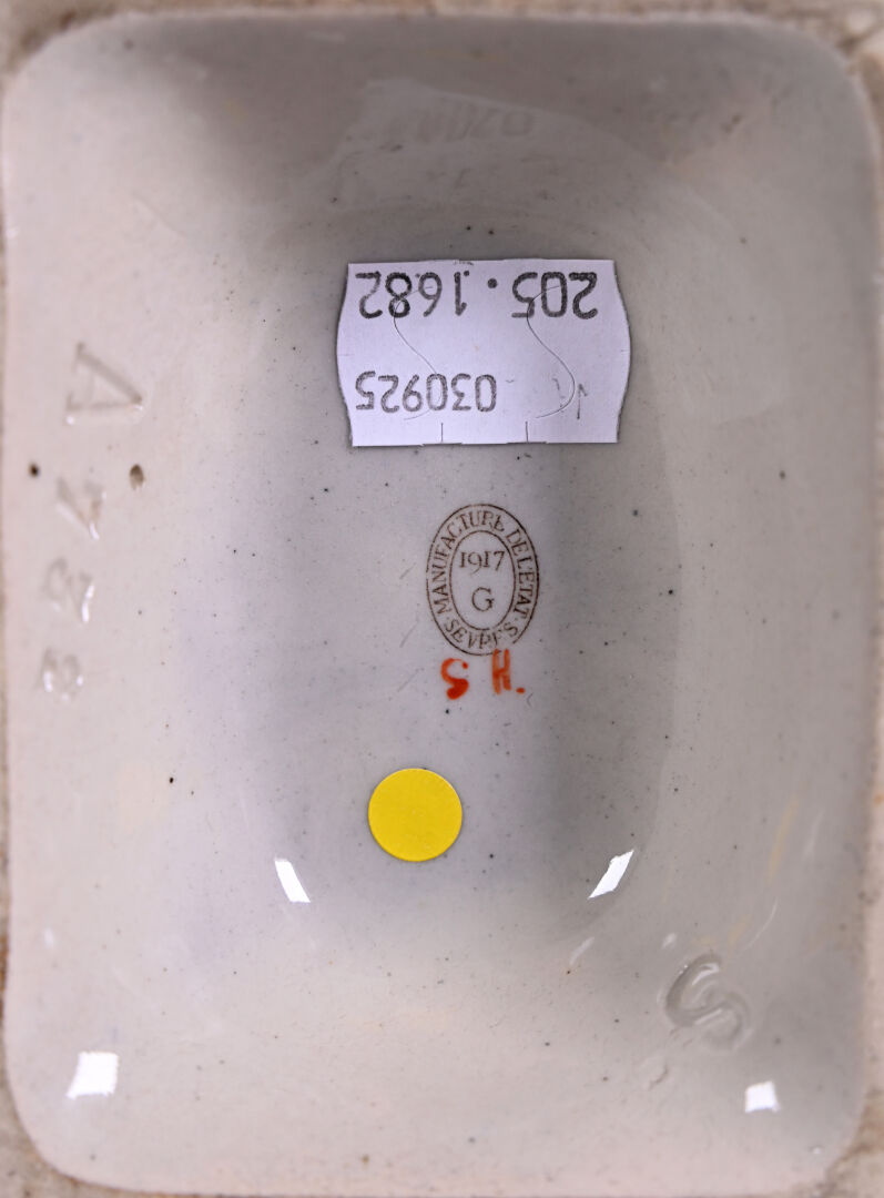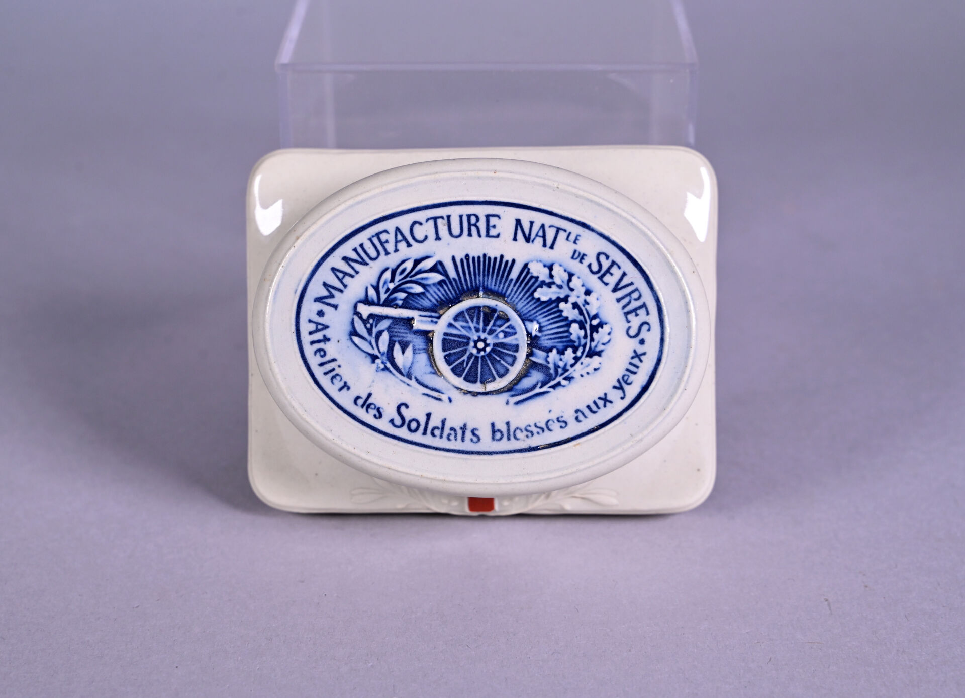 Manufacture Nationale de Sevres. Presse-papier « Atelier des soldats blessés aux yeux ». Avec une croix rouge devant. Au dessous, cachet avec date 1917. Haut. : 4,5 cm.