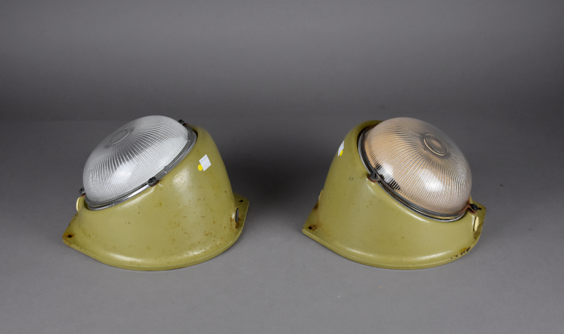 MAPELEC AMIENS. Paire de lampes de coursive en fonte d’acier beige et verre moulé. Milieu du XXe siècle. Marqués.
