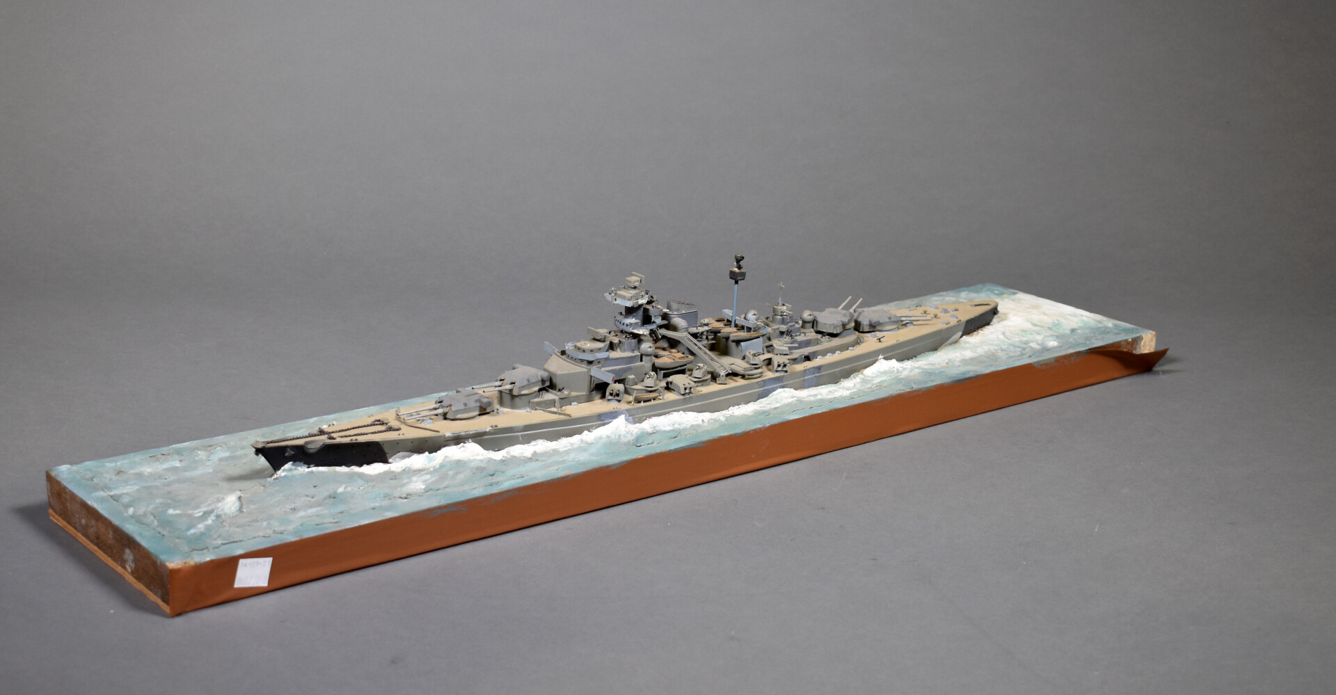 Maquette du Titanic en plastique sur socle à décors marin. Long. : 780 mm (hors socle). On joint une maquette du Bismark de 620 mm de long. Etat 2