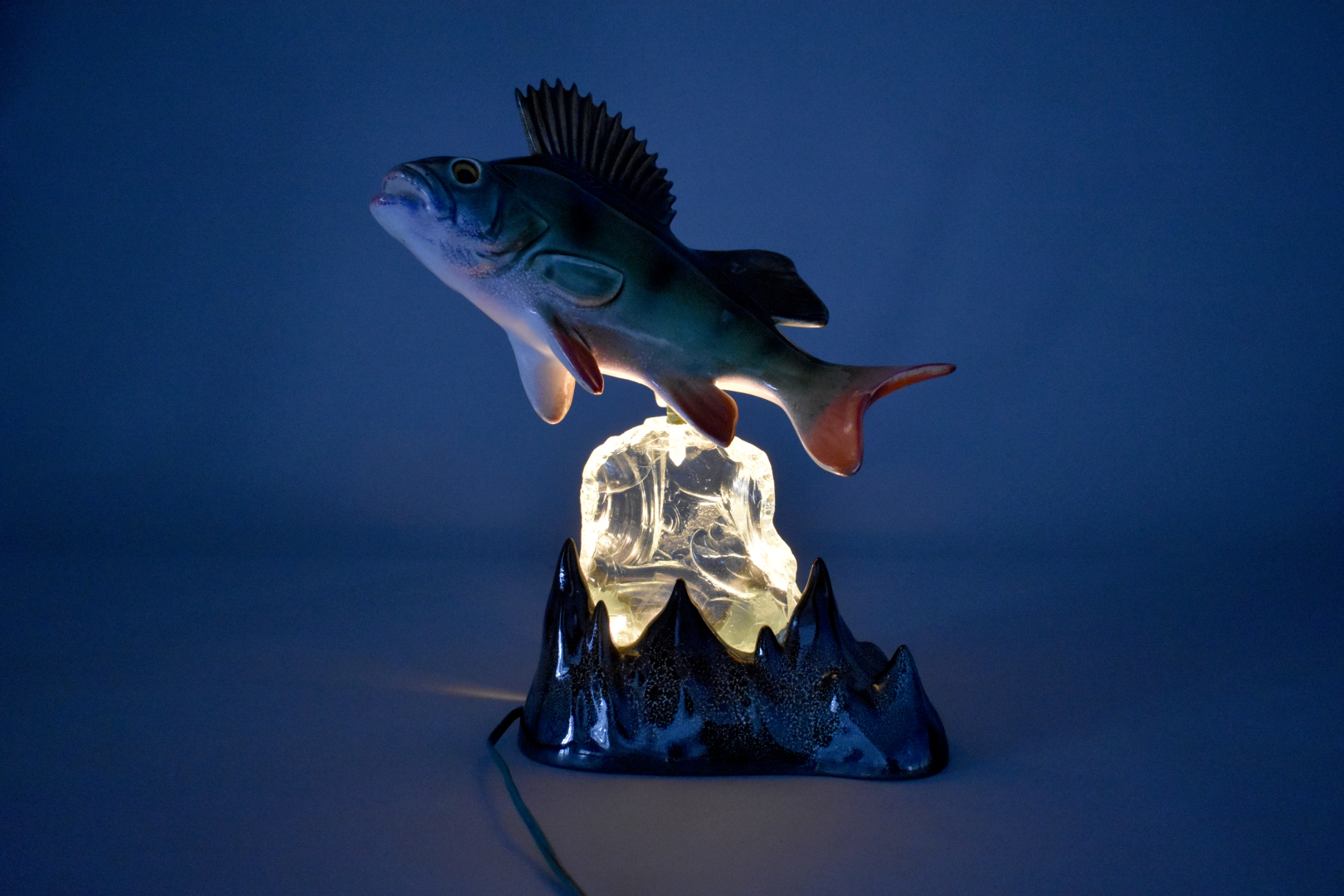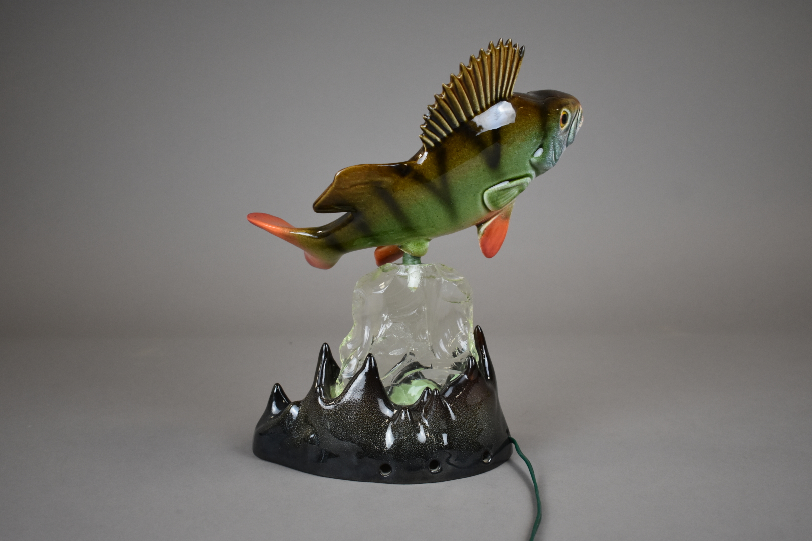 Marceau BERNERON (XXe siècle). Lampe en céramique et verre représentant une perche sortant des flots. Dans le goût de Vallauris. Haut. : 32 cm.