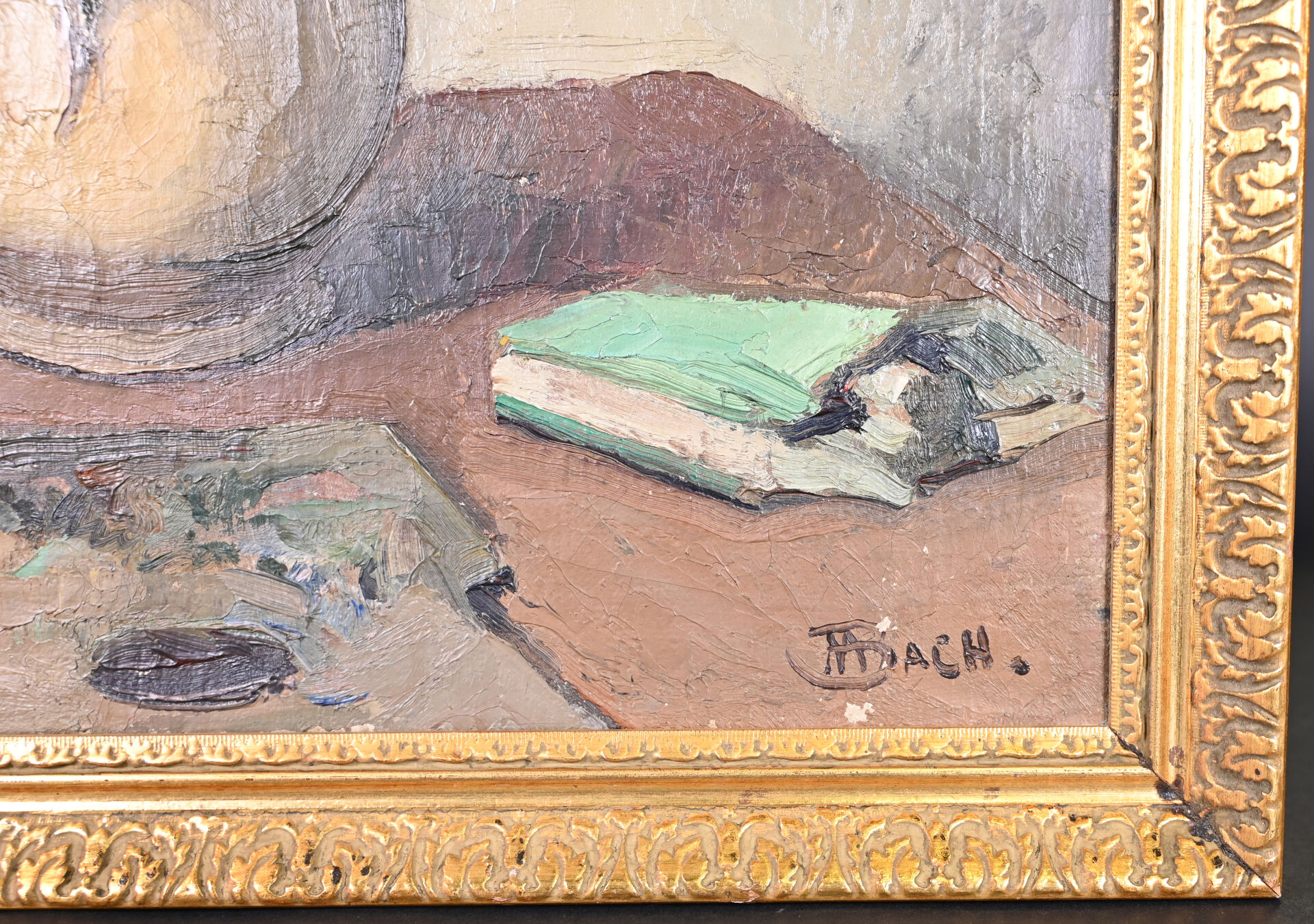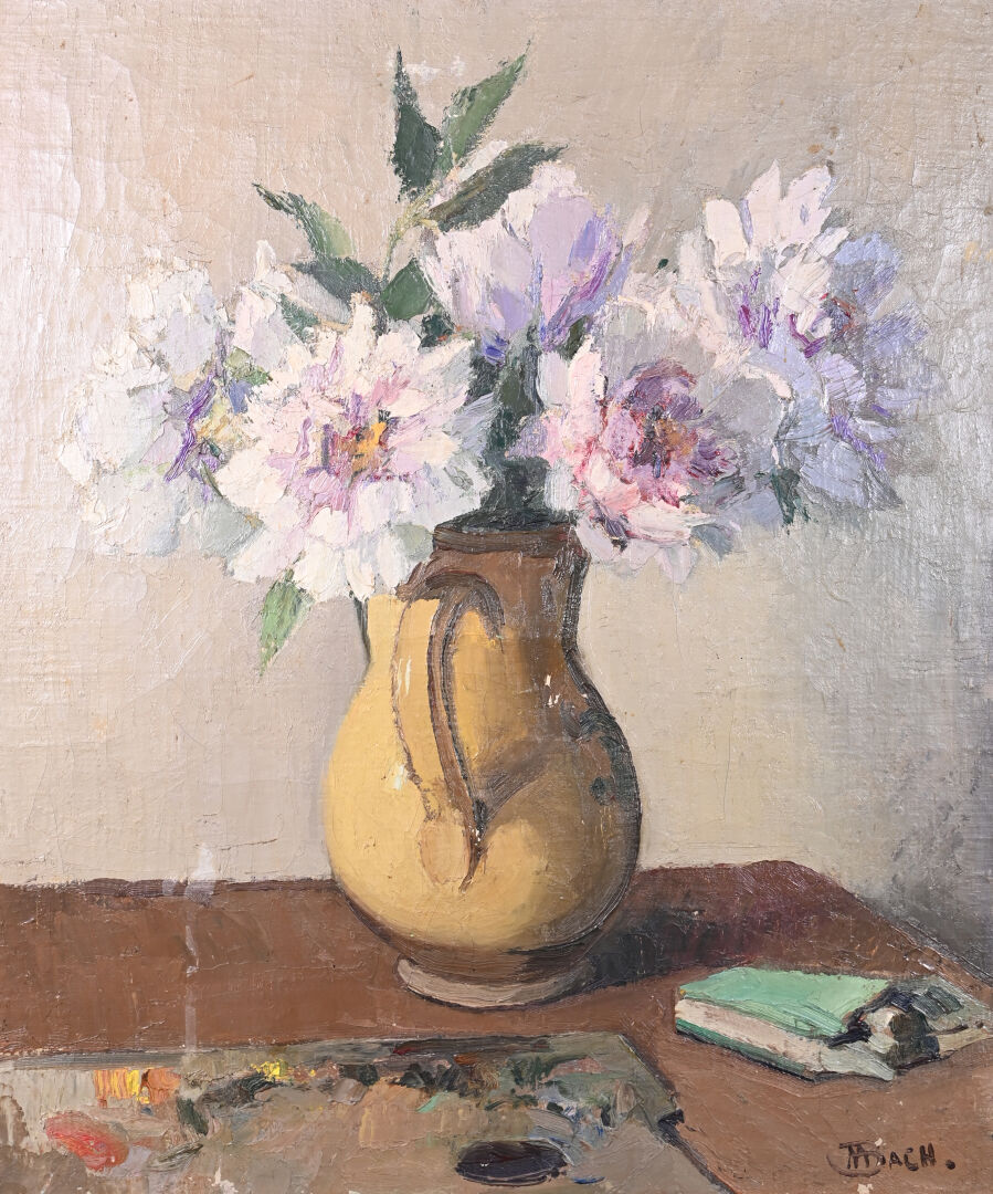 Marcel BACH (1879-1950). Bouquet de fleurs dans une cruche. Huile sur toile signée en bas à droite, située et datée Février 1926 au dos (enfoncement et éclats). 55 x 46 cm.