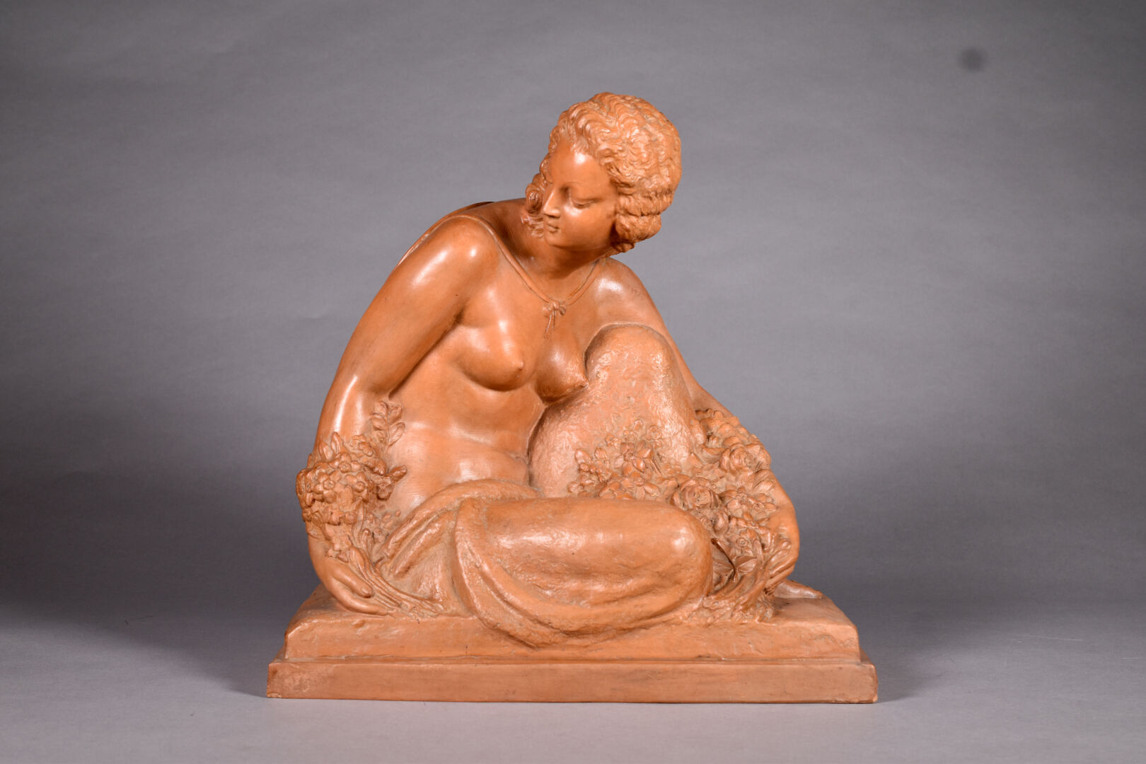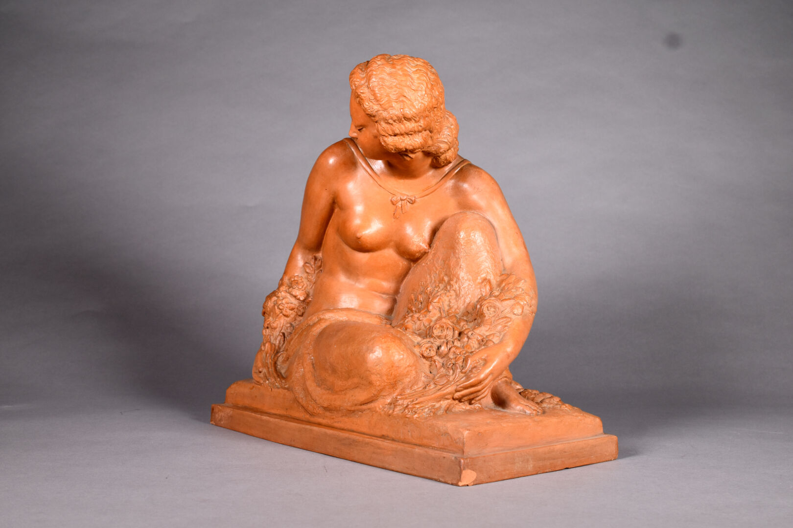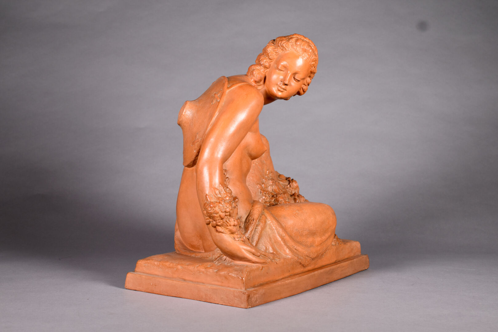 Marcel BOURAINE (1886-1948). Femme aux fleurs. Terre cuite signée en bas à l’arrière (un éclat). Haut. : 38,5 cm – Larg. : 37 cm – Prof. : 20,5 cm.