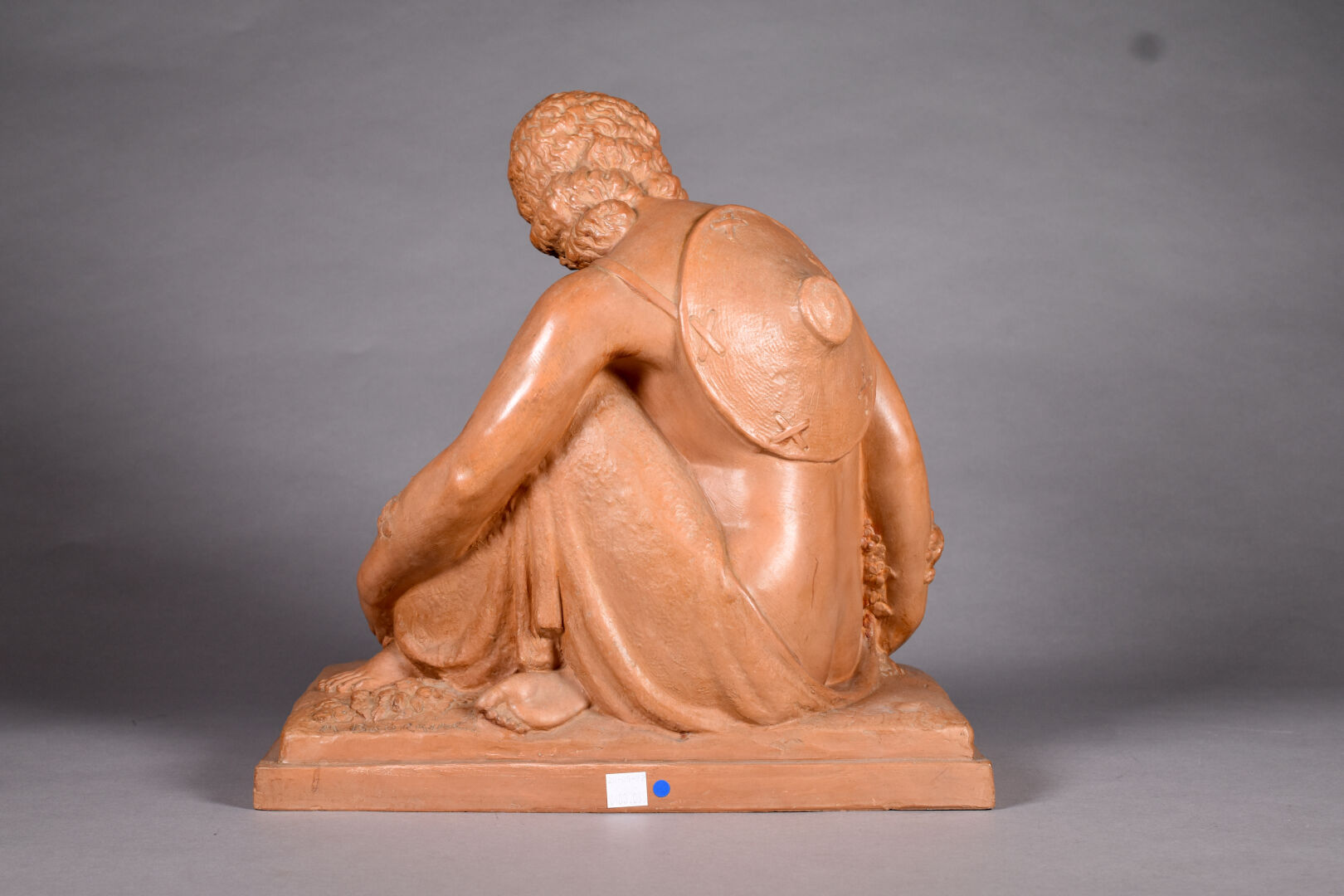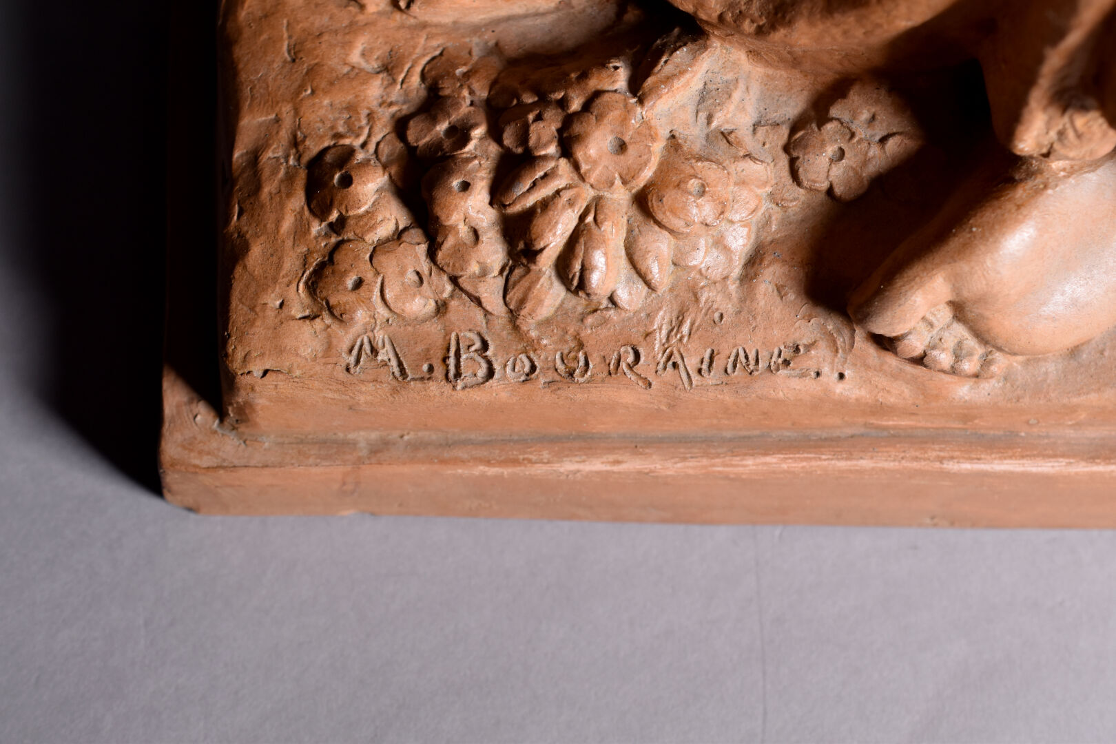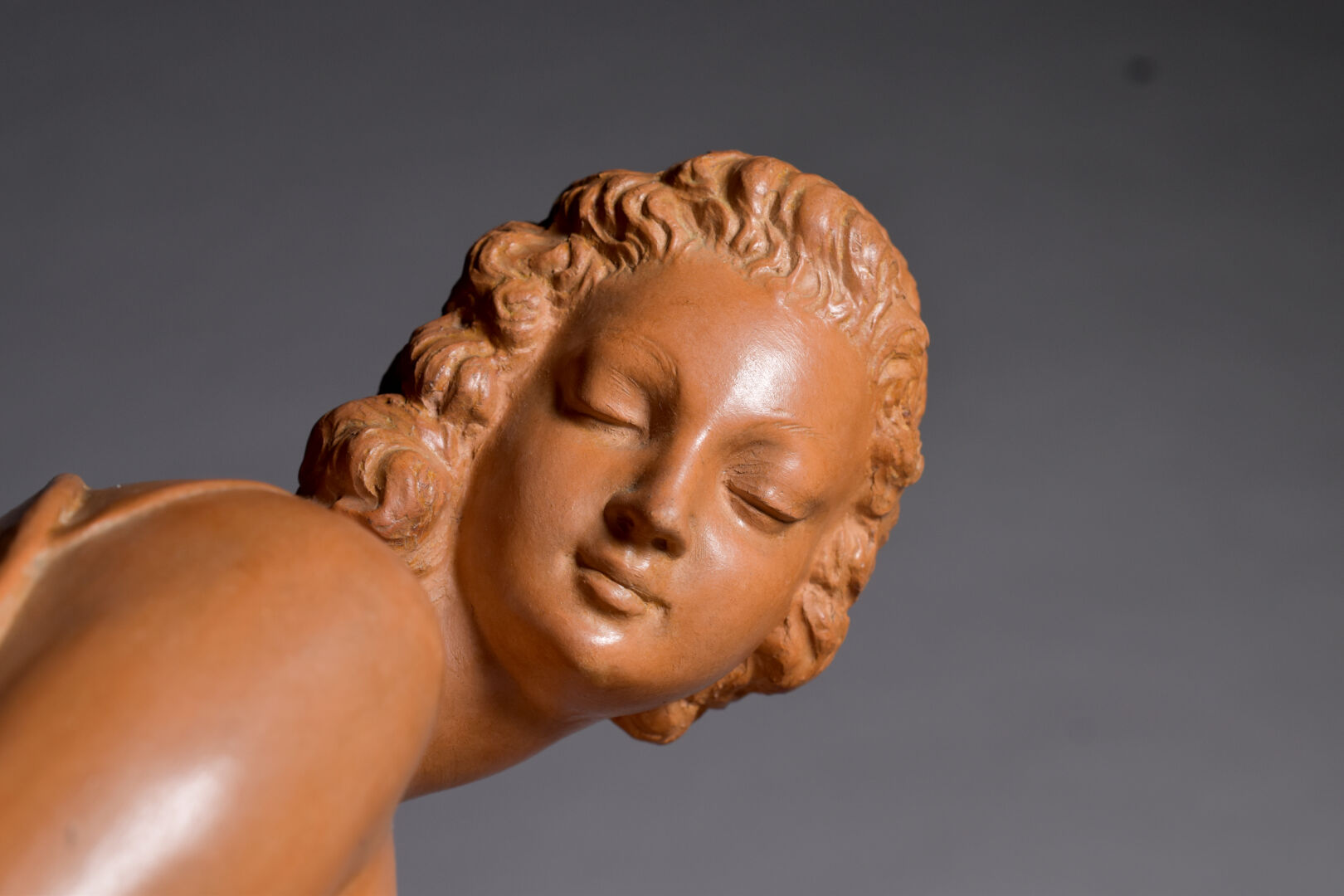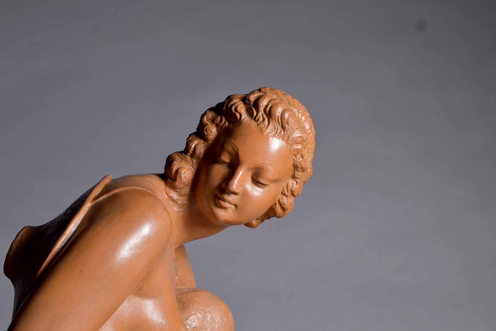 Marcel BOURAINE (1886-1948). Femme aux fleurs. Terre cuite signée en bas à l’arrière (un éclat). Haut. : 38,5 cm – Larg. : 37 cm – Prof. : 20,5 cm.