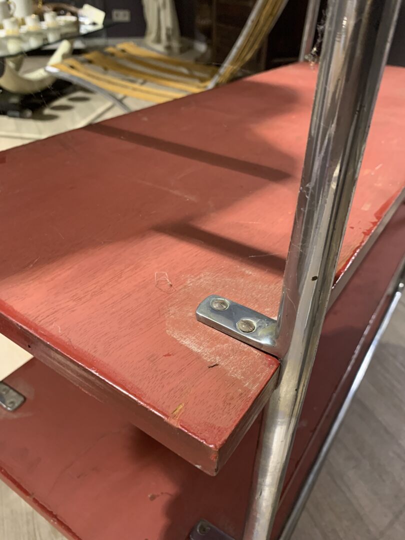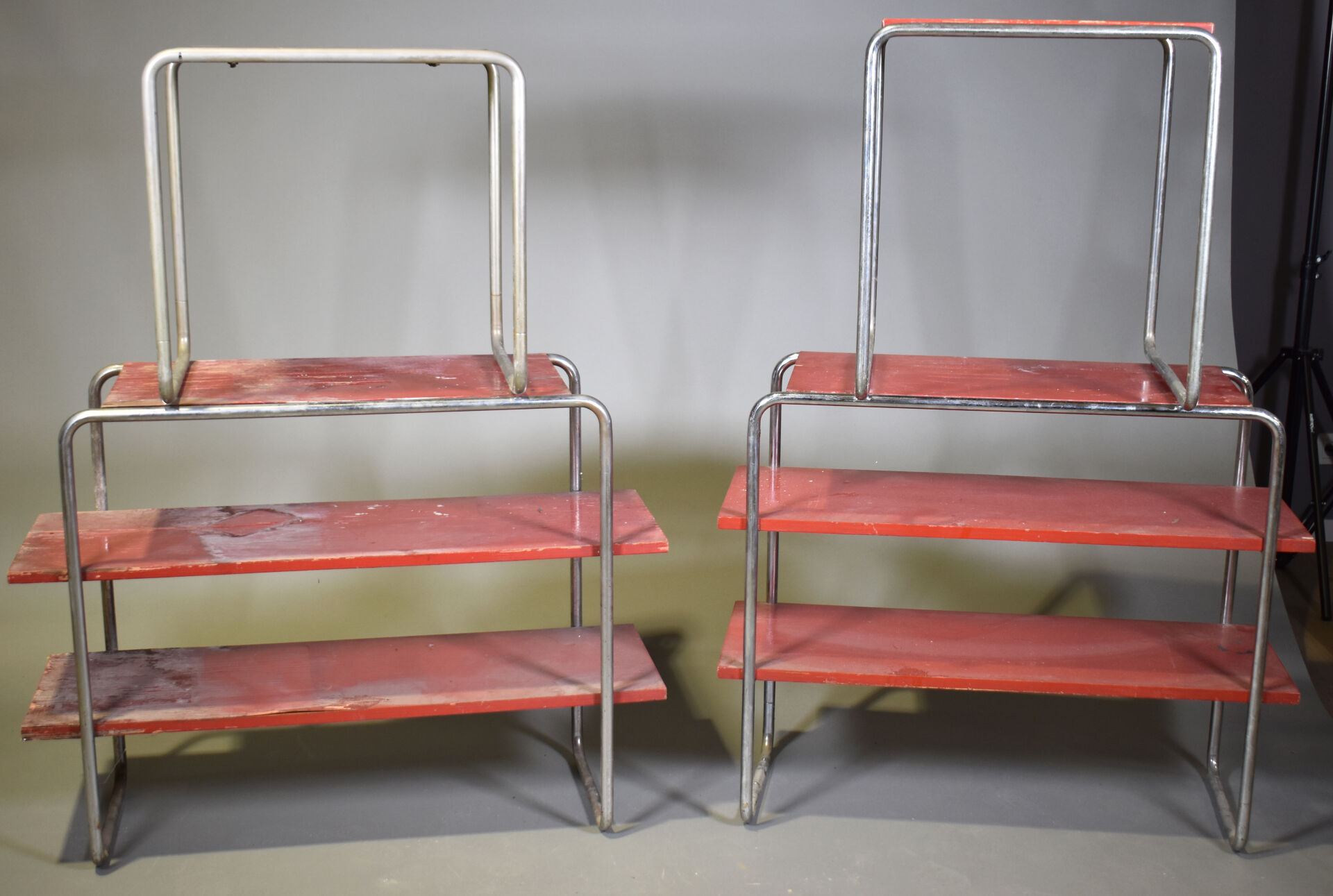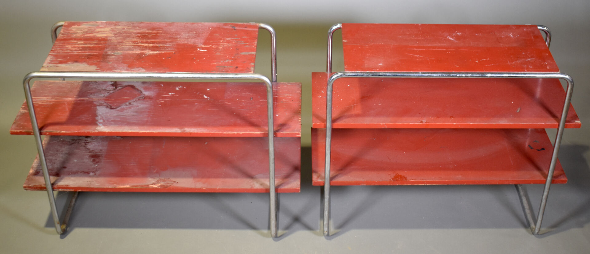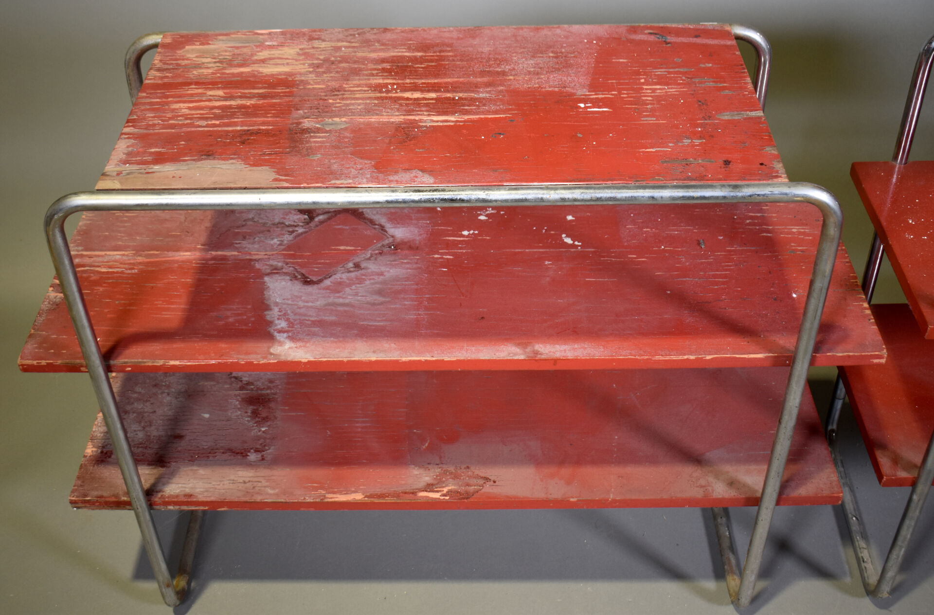 Deux tables d’appoint modèle » B12 » à deux plateaux décalés en bois laqué ou peint rouge et structure en métal tubulaire chromé (éclats, usures, piqures). Marquées avec pastilles THONET. Haut. : 74 cm – Larg. : 90 cm – Prof. : 35 cm.