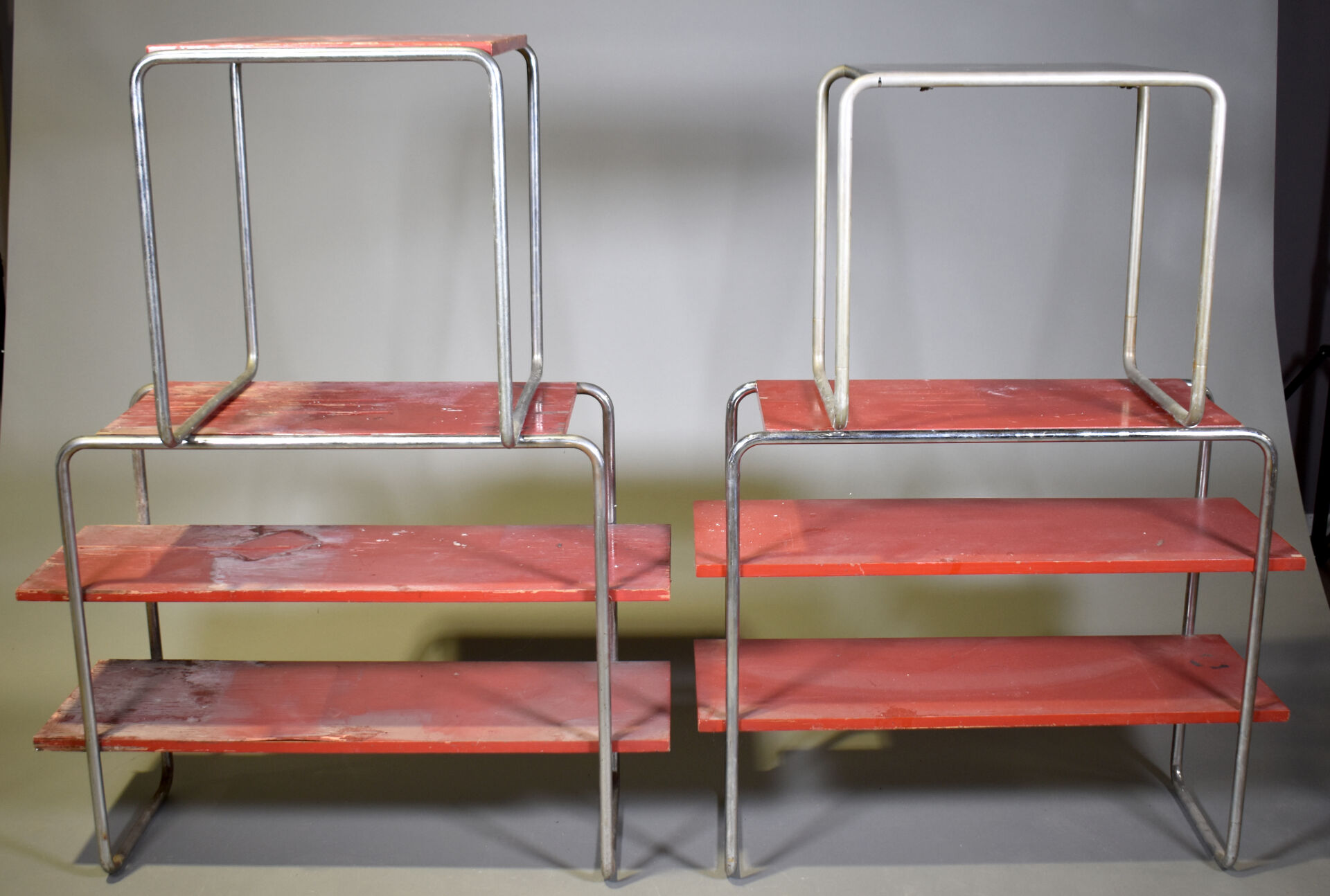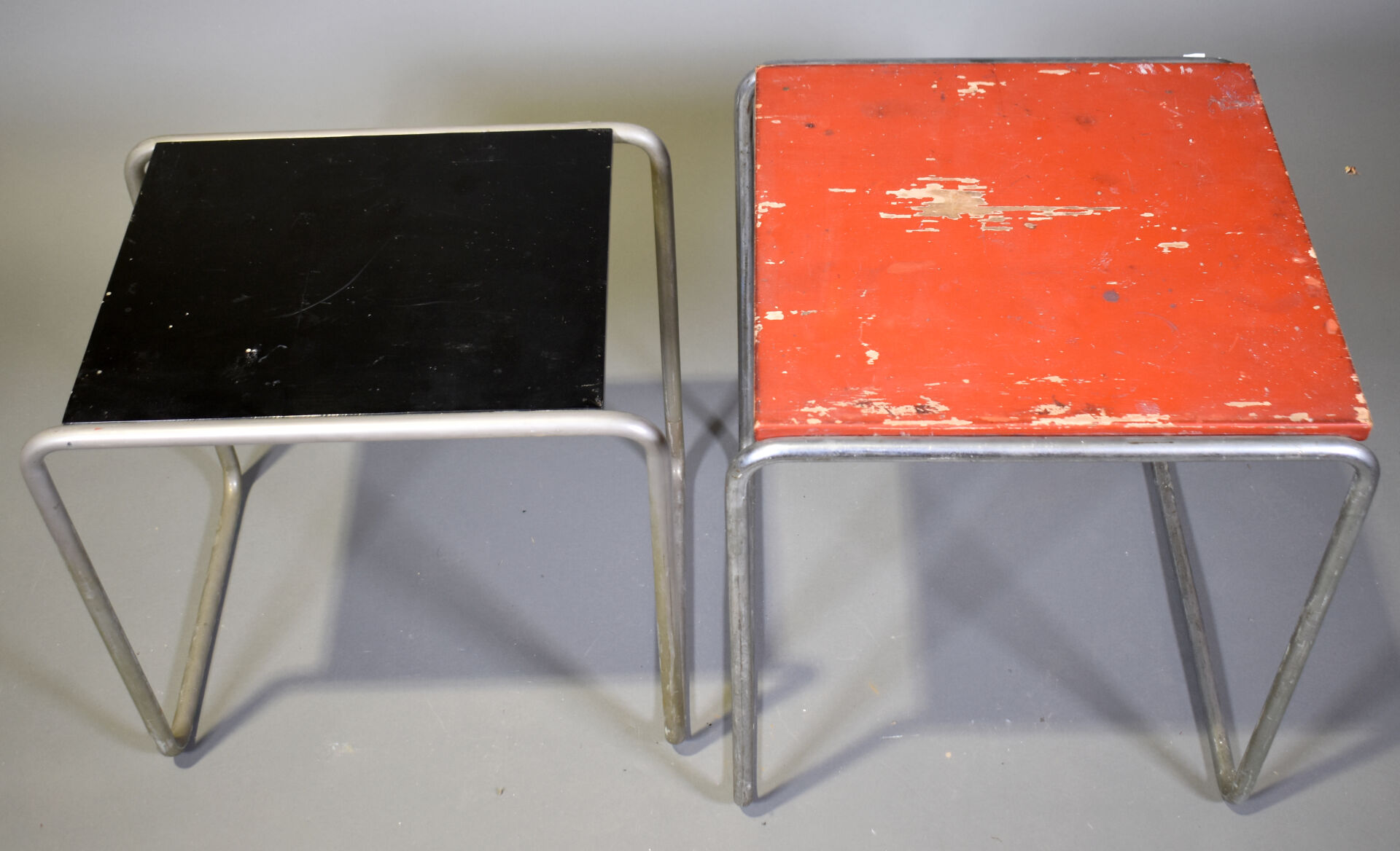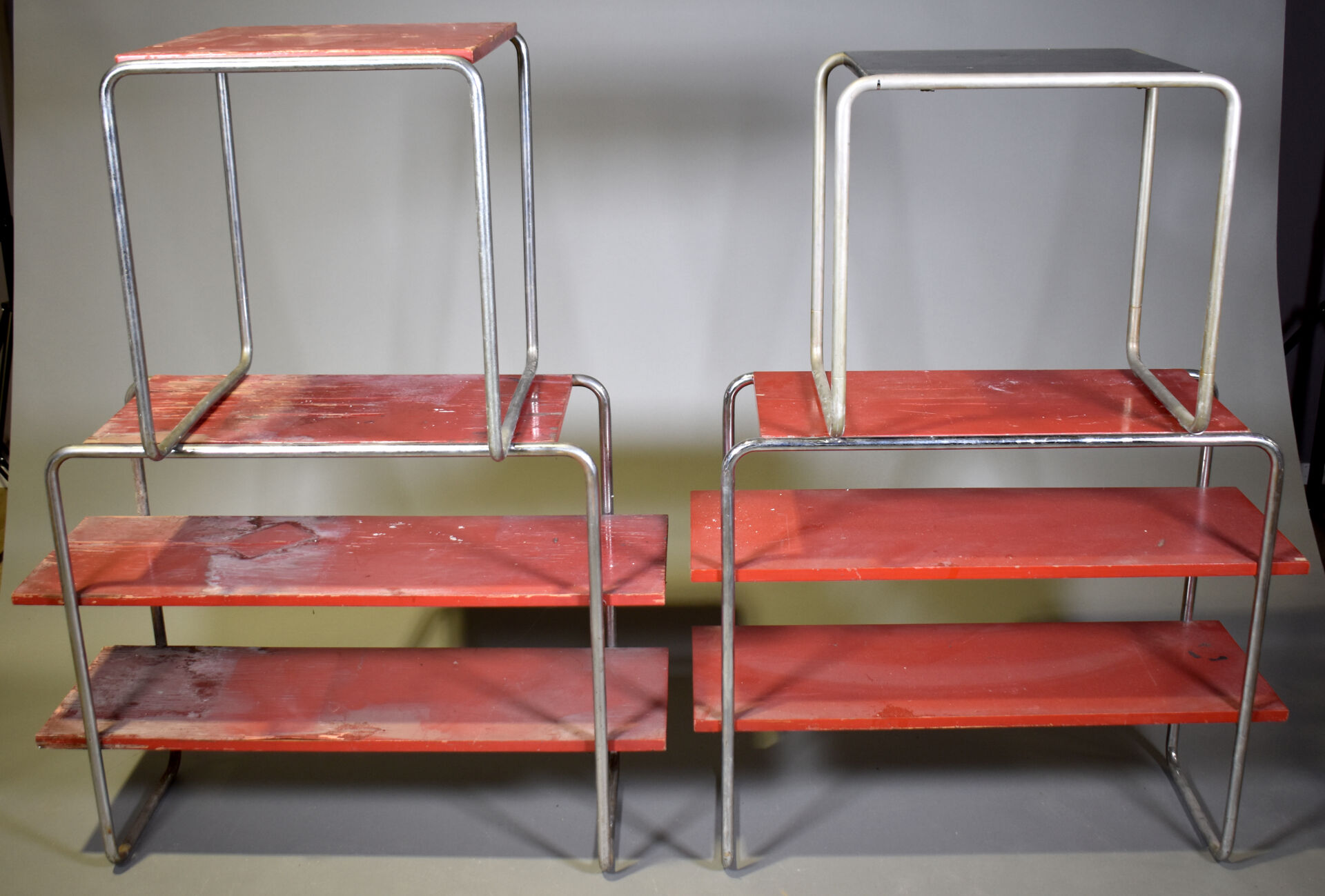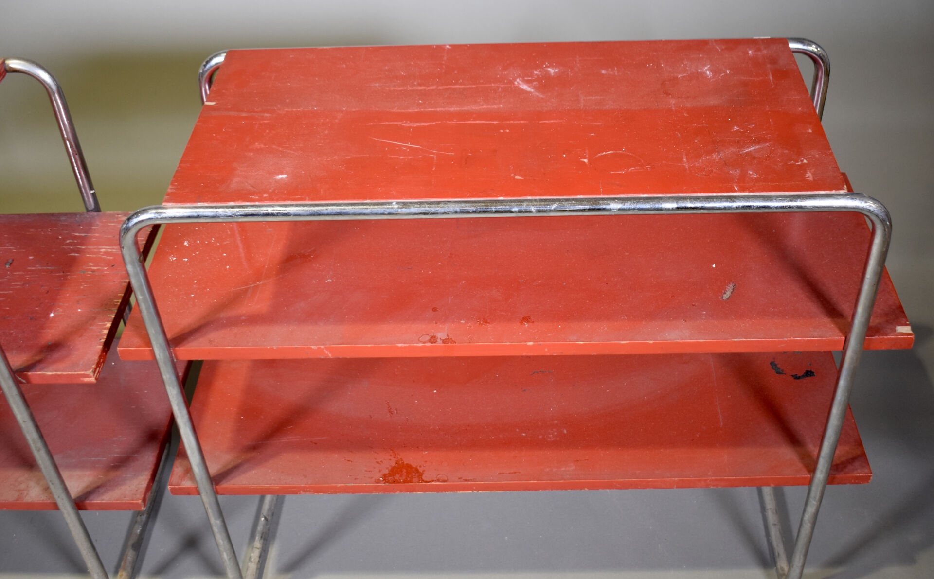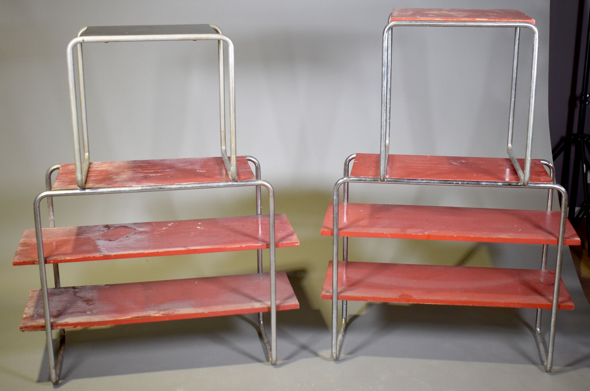 MARCEL BREUER (1902-1981) – Edition THONET. Deux tables d’appoint modèle » B12 » à deux plateaux décalés en bois laqué ou peint rouge et structure en métal tubulaire chromé (éclats, usures, piqures). Marquées avec pastilles THONET. Haut. : 74 cm – Larg. : 90 cm – Prof. : 35 cm. On joint deux autres tables dans le goût de BREUER (usures, éclats). Dim. de la plus grande : Haut. : 55 cm – Larg. : 48 cm – Prof. : 49 cm.