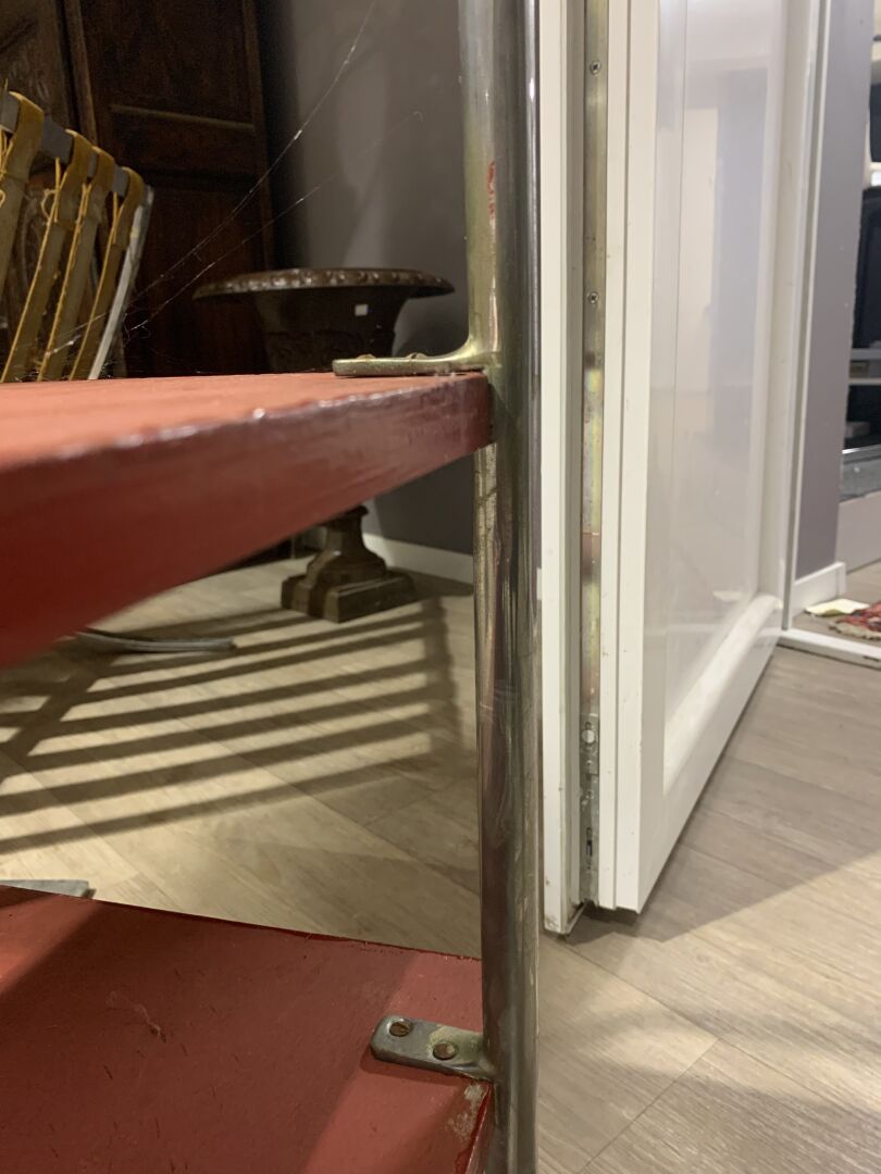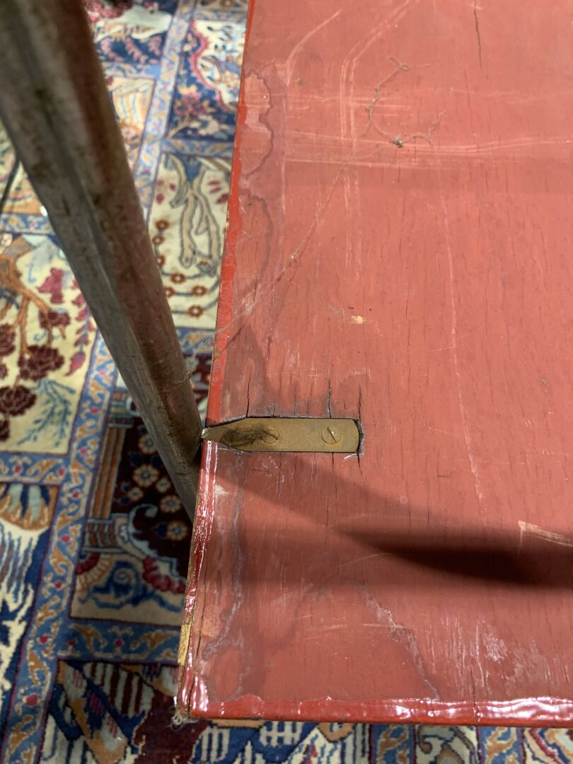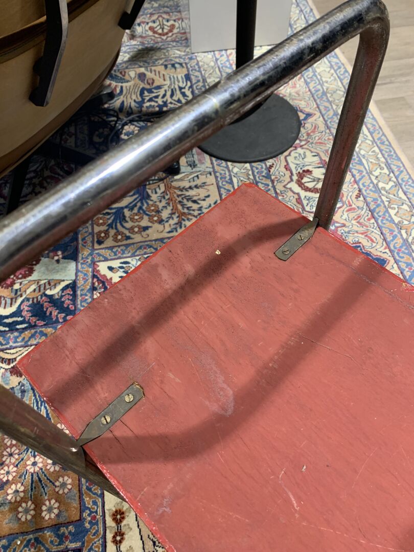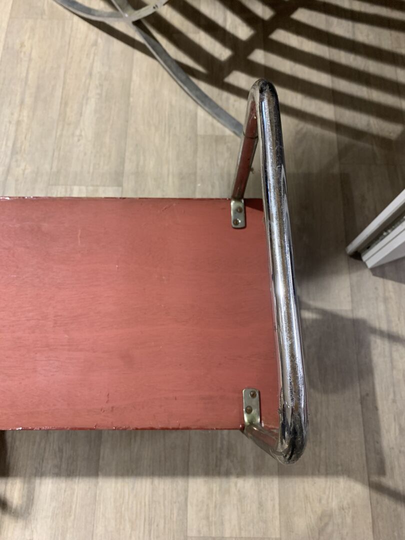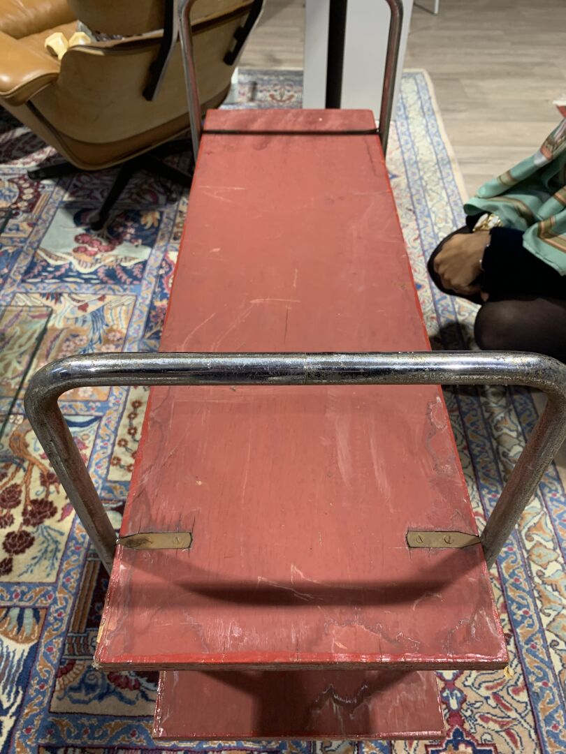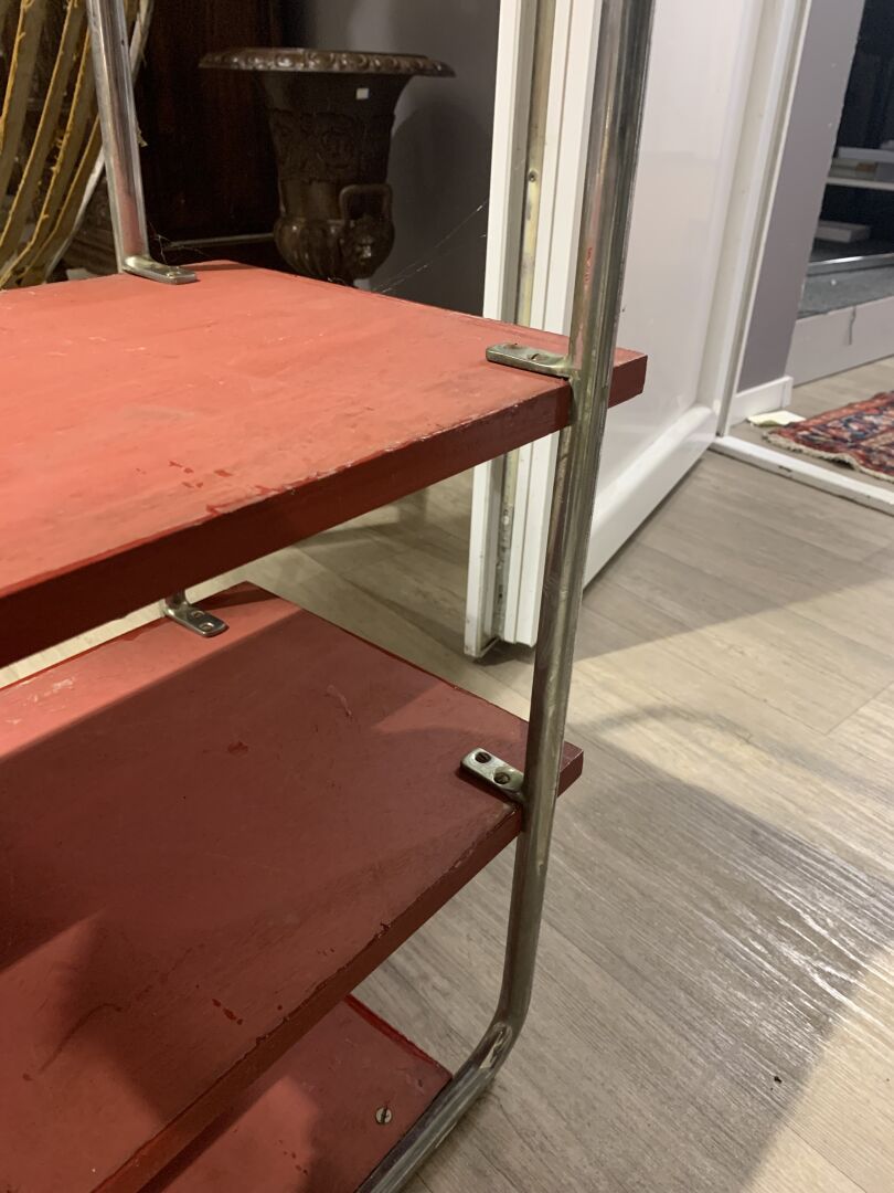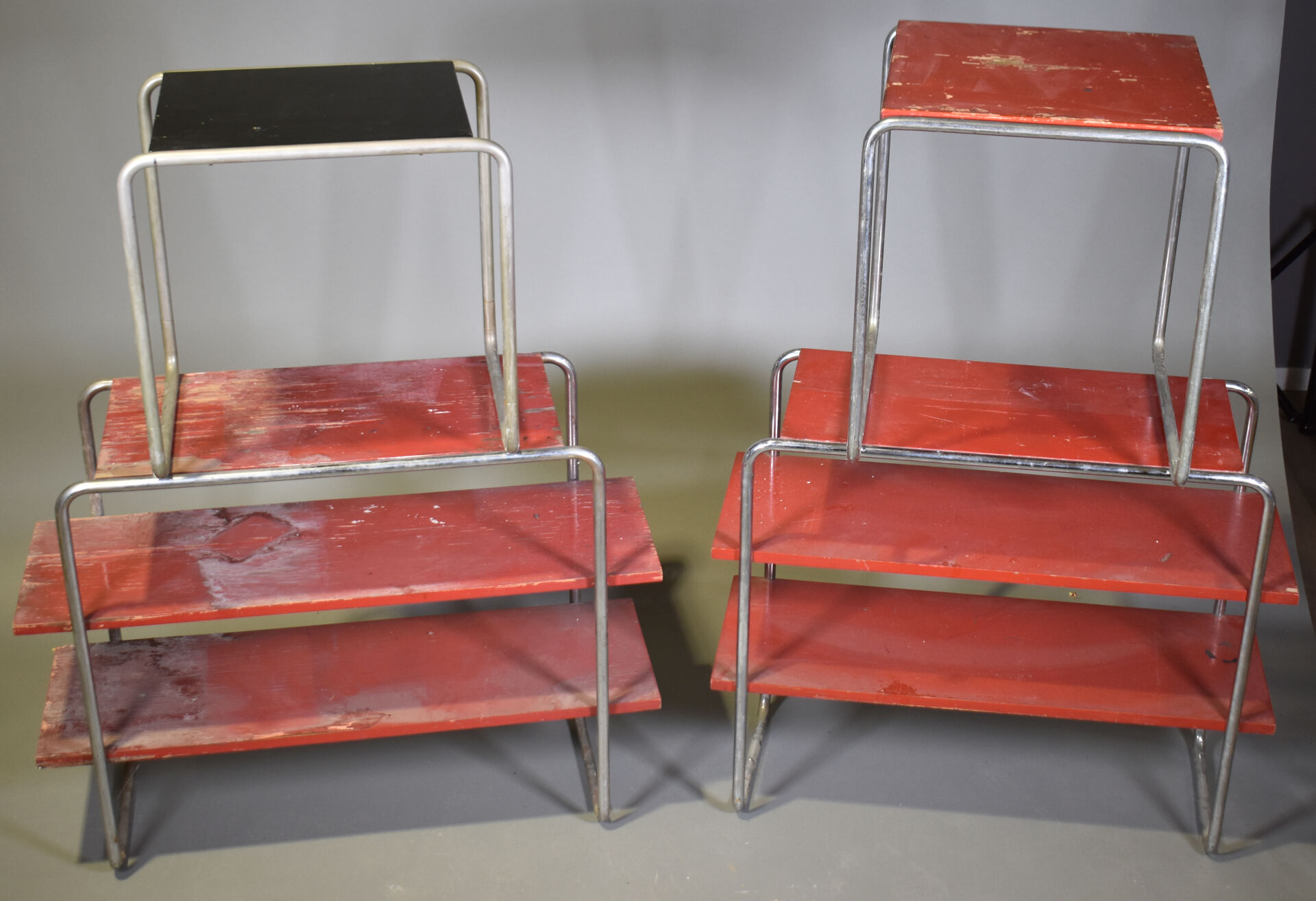 MARCEL BREUER (1902-1981) – Edition THONET. Deux tables d’appoint modèle » B12 » à deux plateaux décalés en bois laqué ou peint rouge et structure en métal tubulaire chromé (éclats, usures, piqures). Marquées avec pastilles THONET. Haut. : 74 cm – Larg. : 90 cm – Prof. : 35 cm. On joint deux autres tables dans le goût de BREUER (usures, éclats). Dim. de la plus grande : Haut. : 55 cm – Larg. : 48 cm – Prof. : 49 cm.