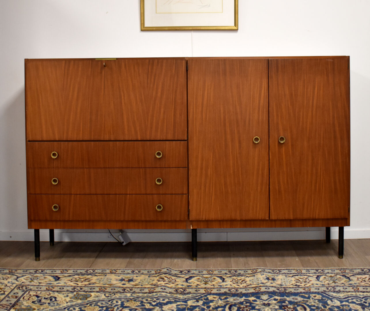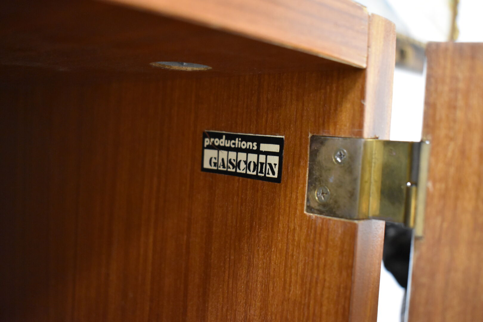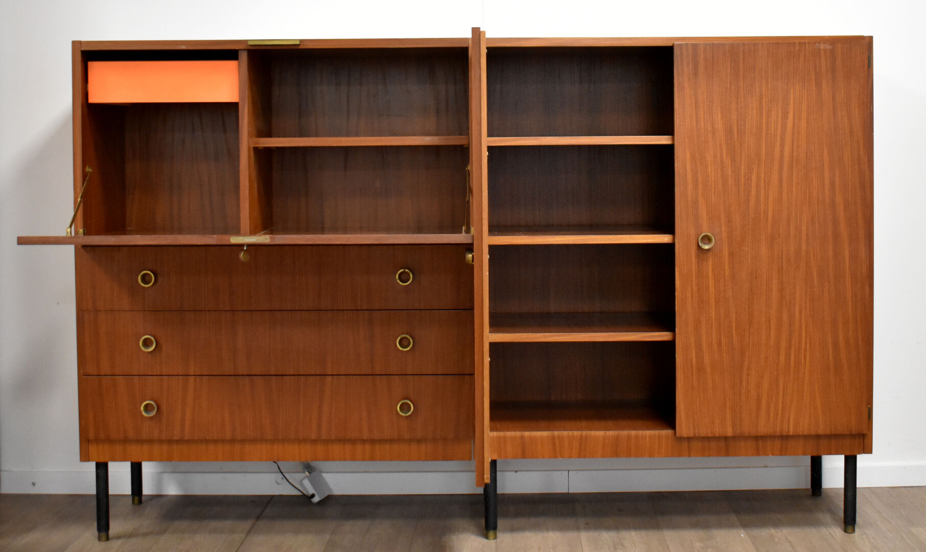 Marcel GASCOIN (1907-1986) – Pilote Expansion. Enfilade en teck (?) ouvrant à deux portes, un abattant et trois tiroirs (usures d’usage, manques). Piétement en métal laqué noir reposant sur des sabots en laiton. Poignées en laiton. Étiquette.Travail des années 1960. Haut. : 120 cm – Larg. : 188 cm – Prof. : 42 cm.