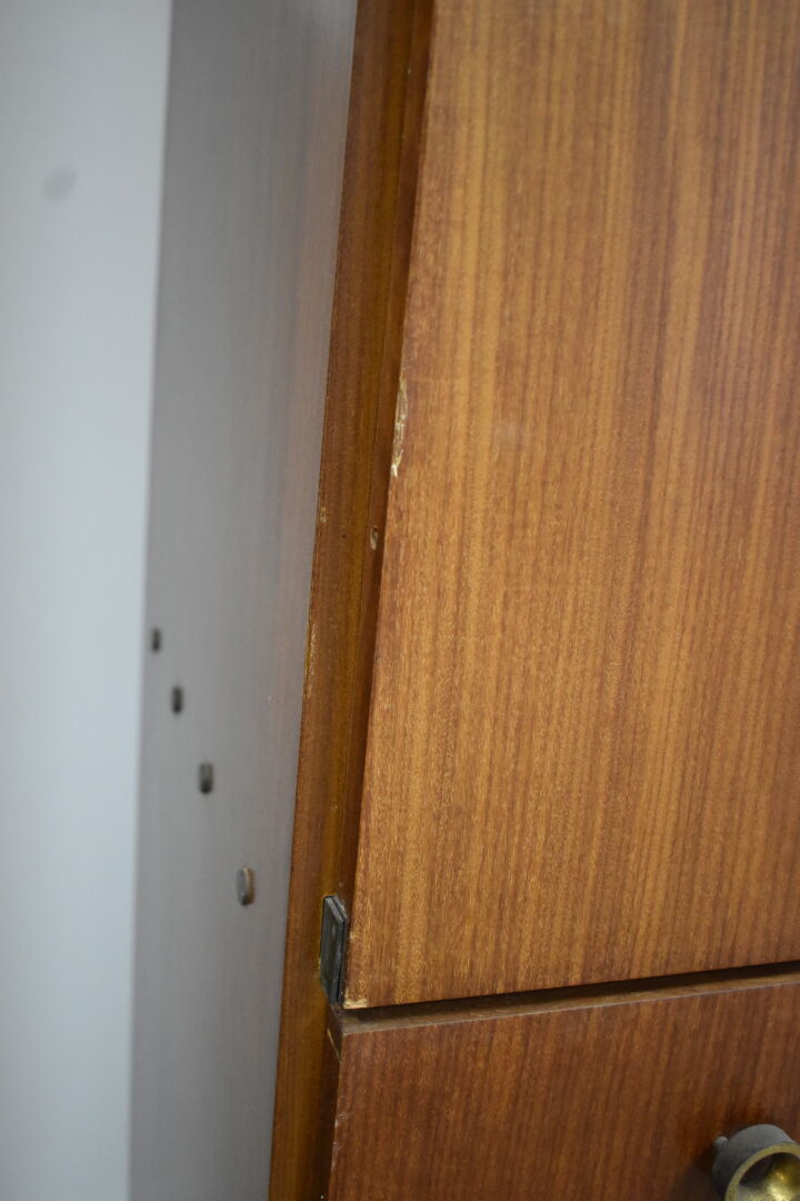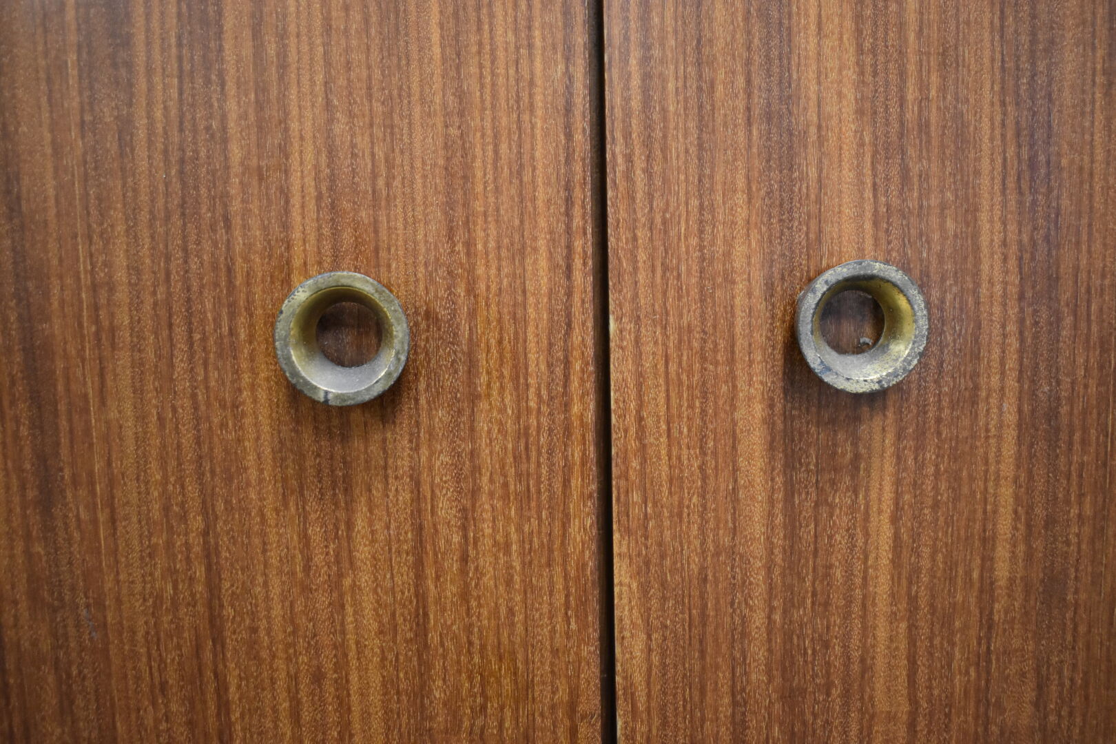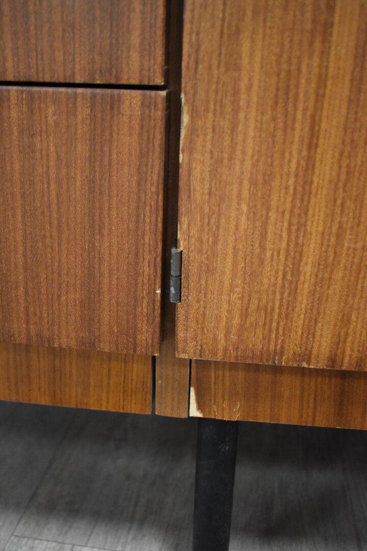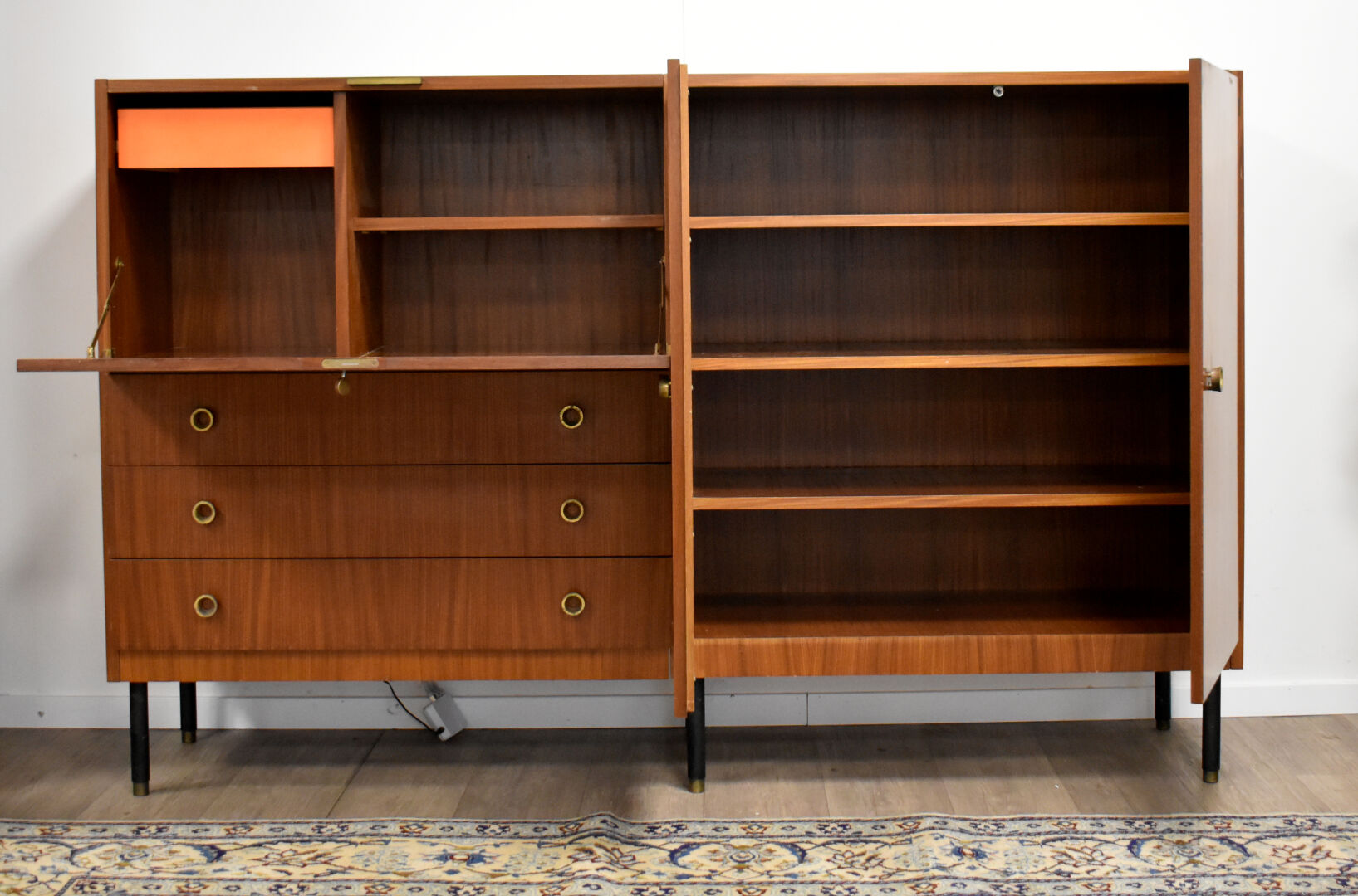 Marcel GASCOIN (1907-1986) – Pilote Expansion. Enfilade en teck (?) ouvrant à deux portes, un abattant et trois tiroirs (usures d’usage, manques). Piétement en métal laqué noir reposant sur des sabots en laiton. Poignées en laiton. Étiquette.Travail des années 1960. Haut. : 120 cm – Larg. : 188 cm – Prof. : 42 cm.
