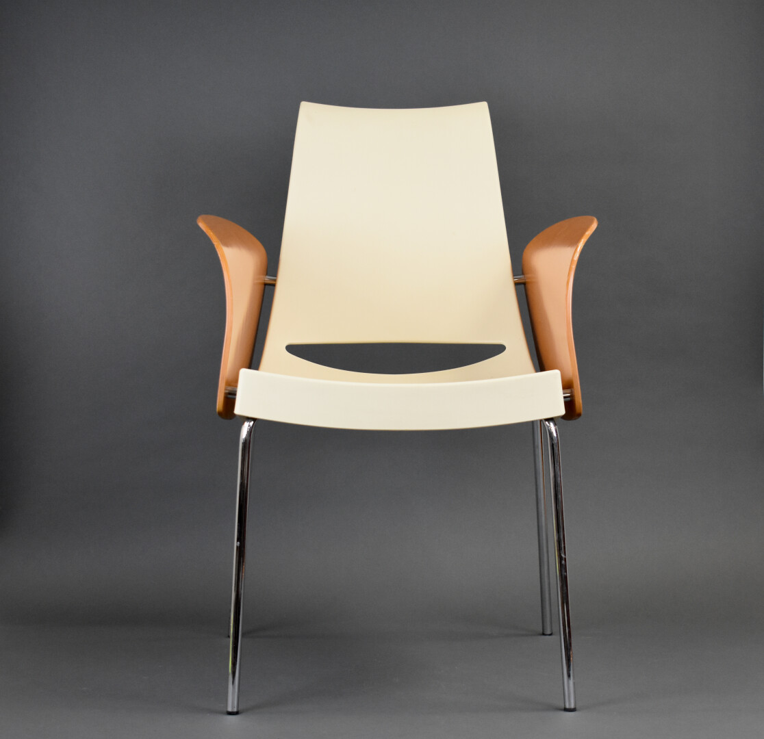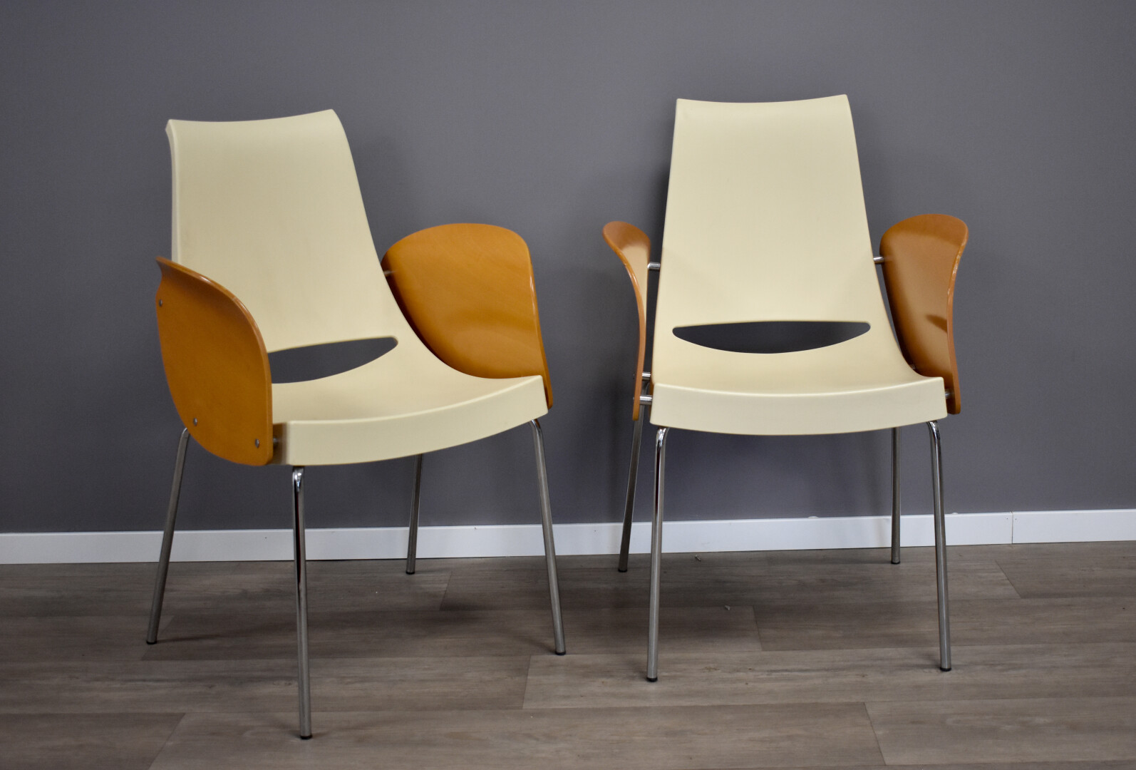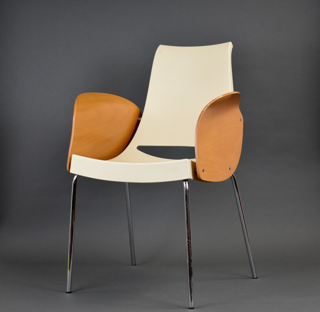 Marco MARAN (Né en 1963), PARRI A&CO éditeur Italie. Paire de fauteuils modèle « Chiacchiera » en plastique moulé, les accotoirs en contreplaqué thermo-courbé et le piétement en métal chromé. Marqués sous la base. Vers 1990/2000. Haut. : 86 cm.