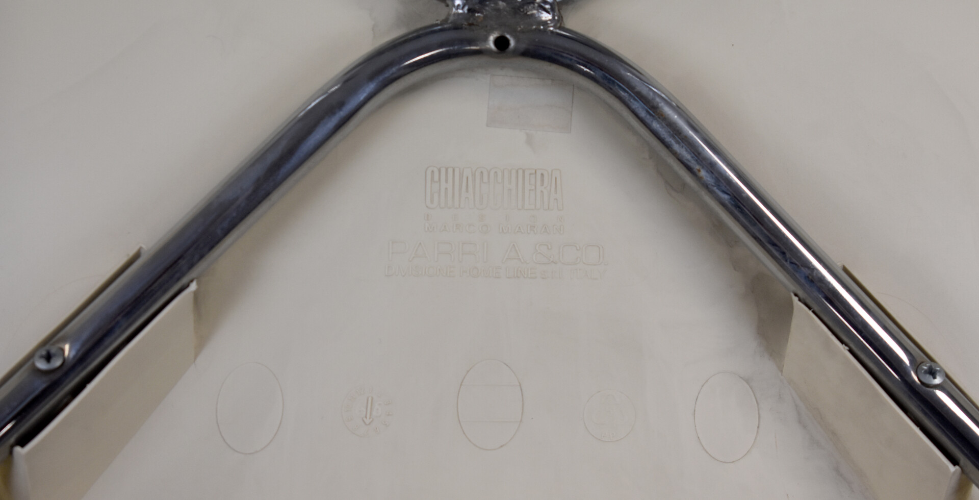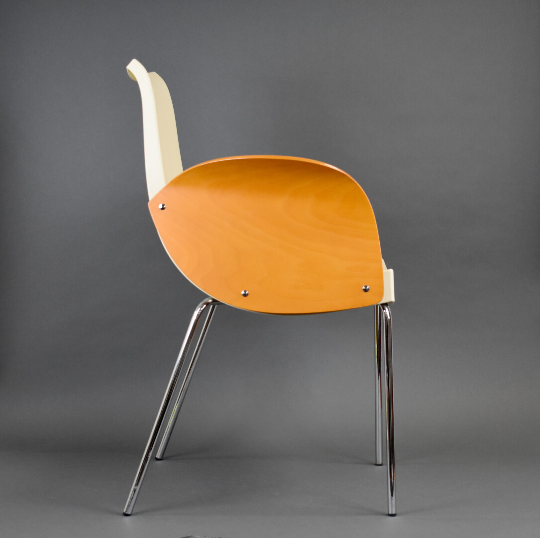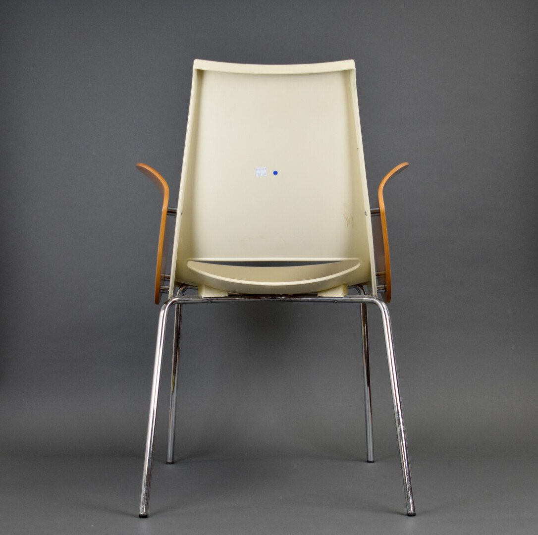 Marco MARAN (Né en 1963), PARRI A&CO éditeur Italie. Paire de fauteuils modèle « Chiacchiera » en plastique moulé, les accotoirs en contreplaqué thermo-courbé et le piétement en métal chromé. Marqués sous la base. Vers 1990/2000. Haut. : 86 cm.