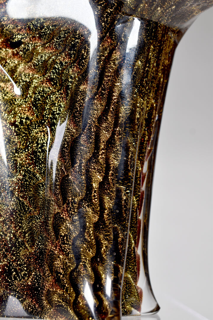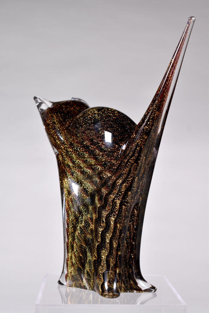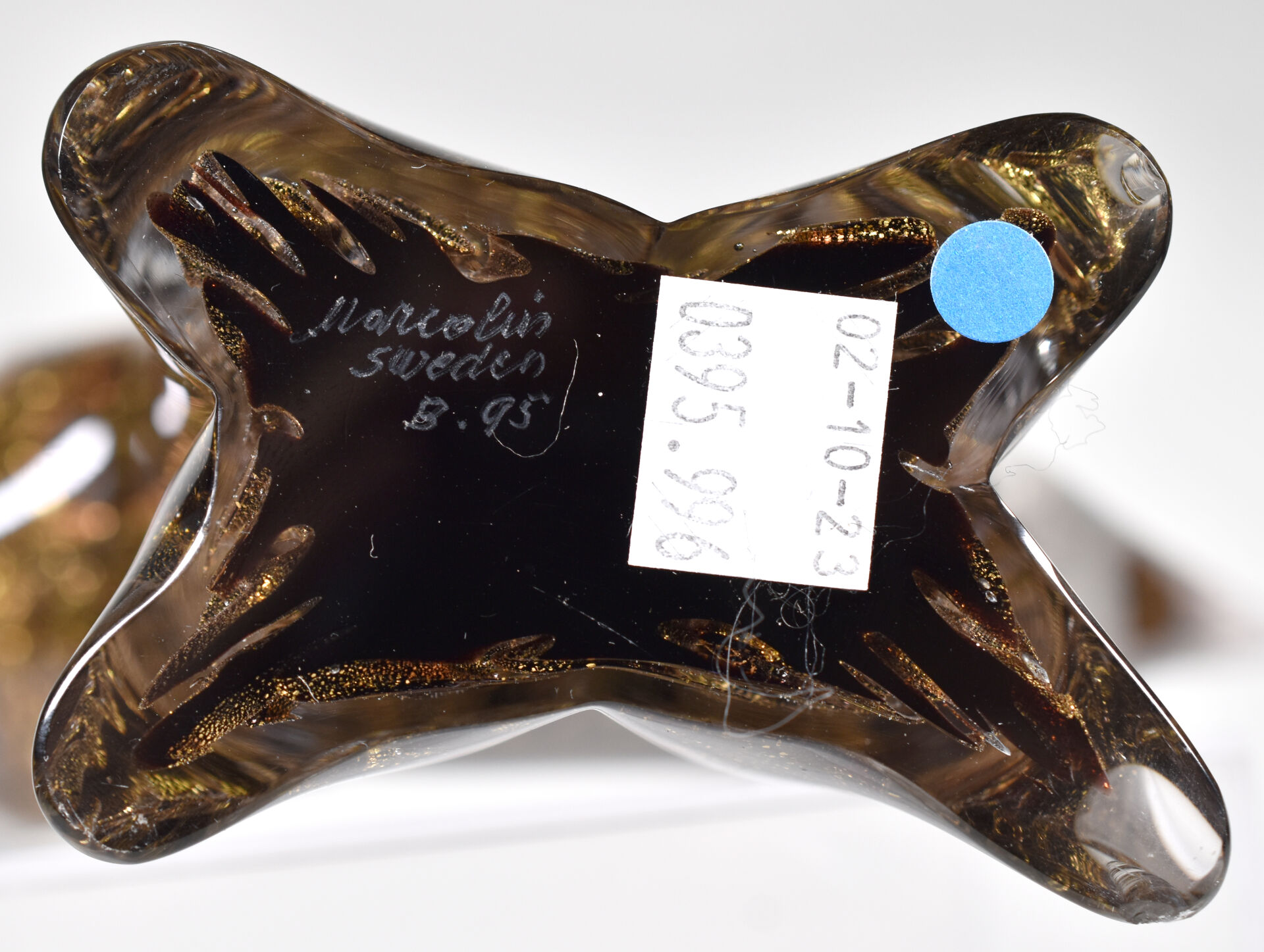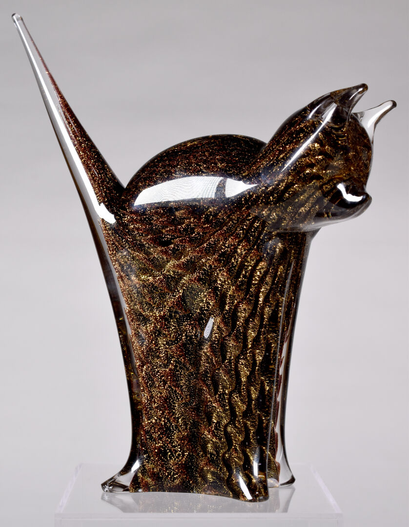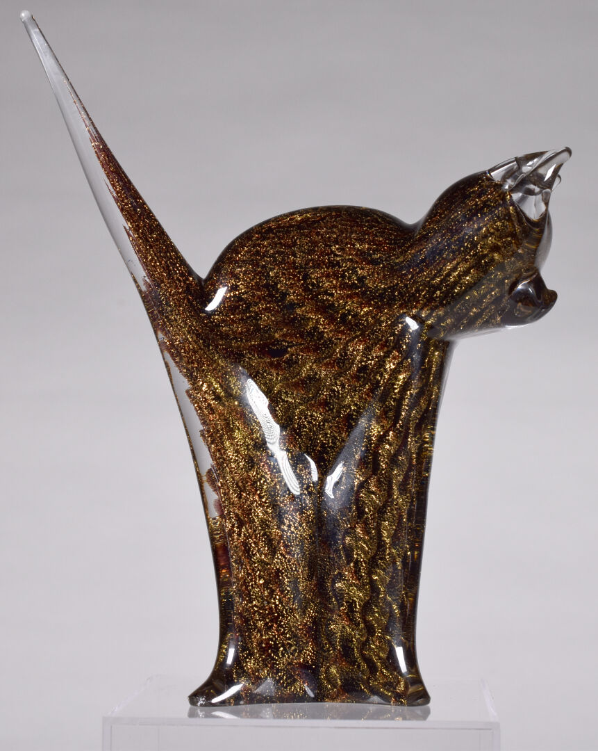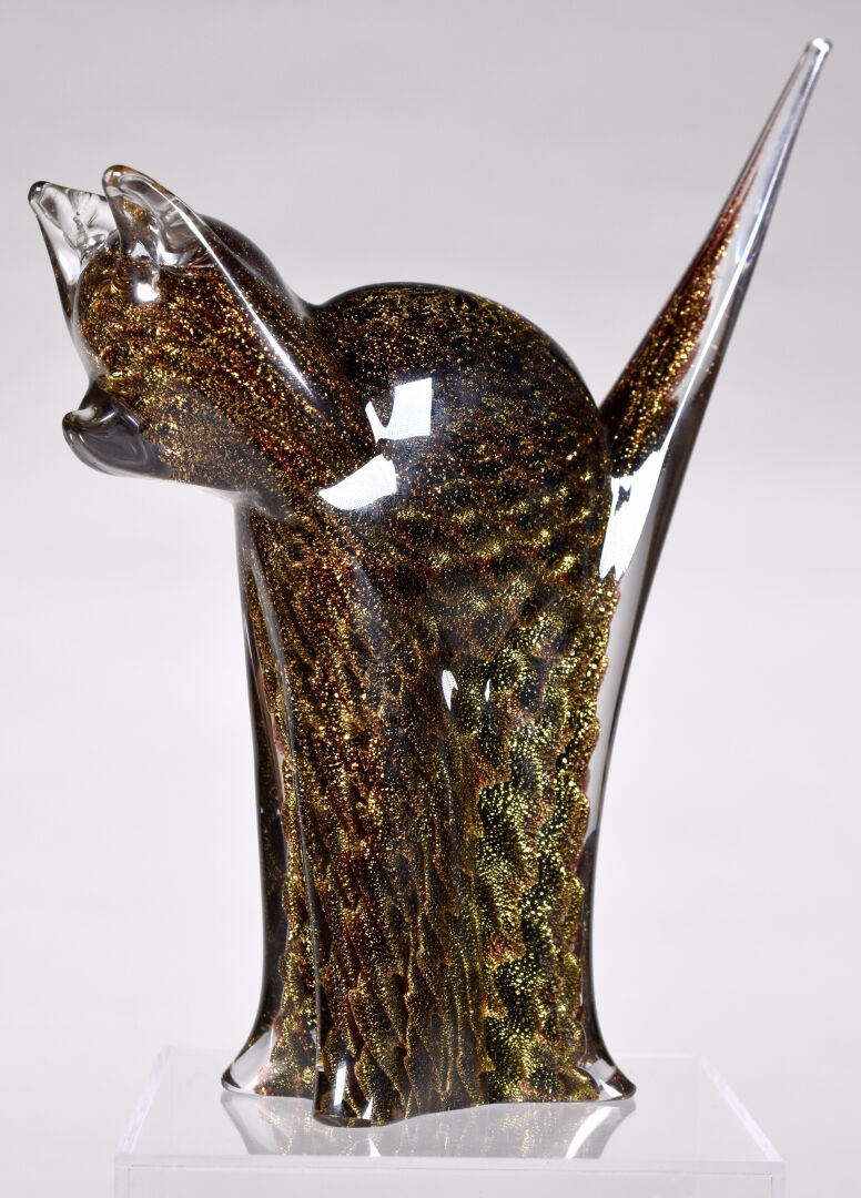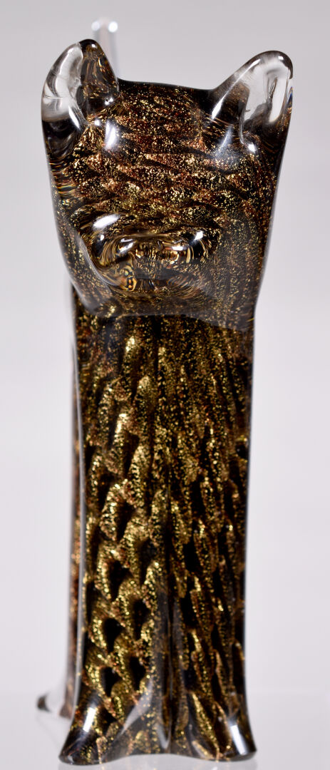 MARCOLIN SWEDEN. Chat en verre clair à rubans de paillons or et brun. Signé au dessous. Haut. : 24 cm.