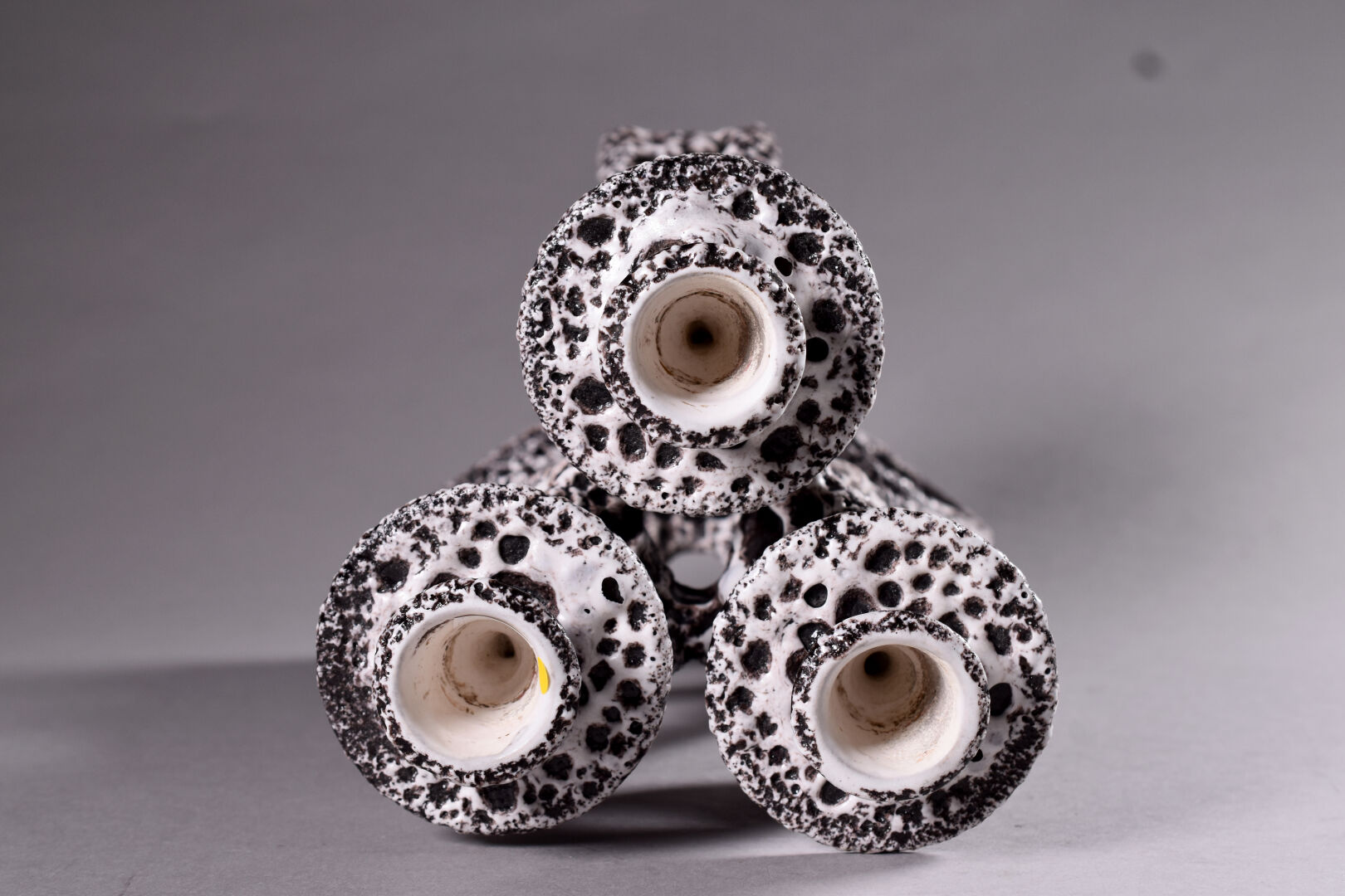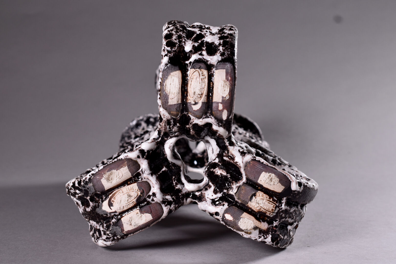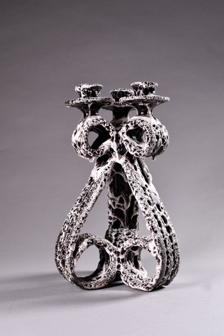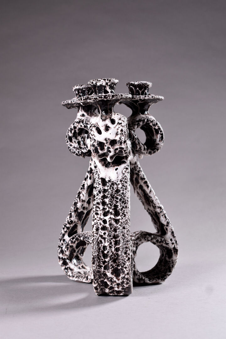 Marius GUIGE (1909-1980) à VALLAURIS. Chandelier en céramique émaillée à concretions en crème sur fond chocolat. Marqué. Haut. : 33 cm.