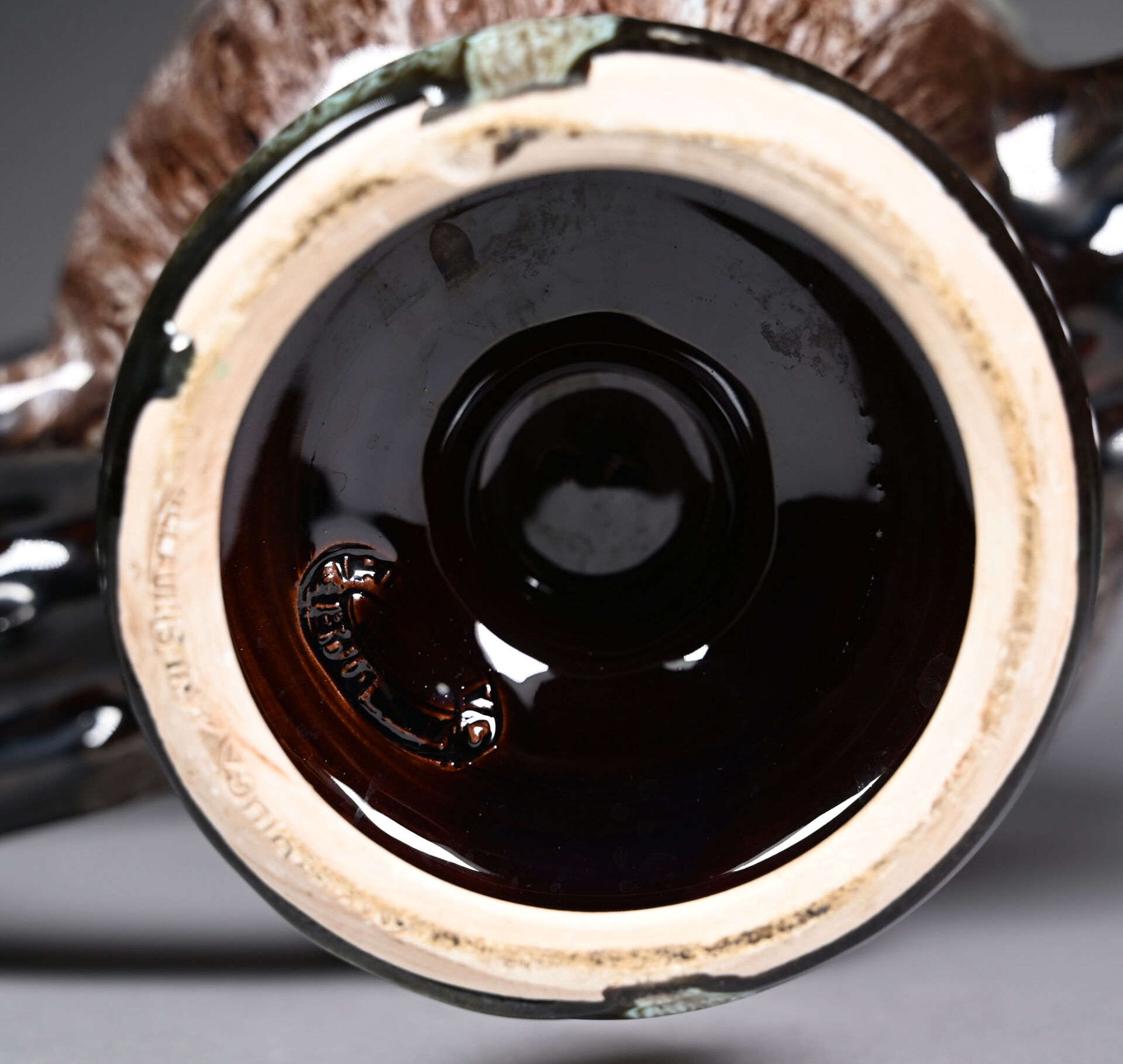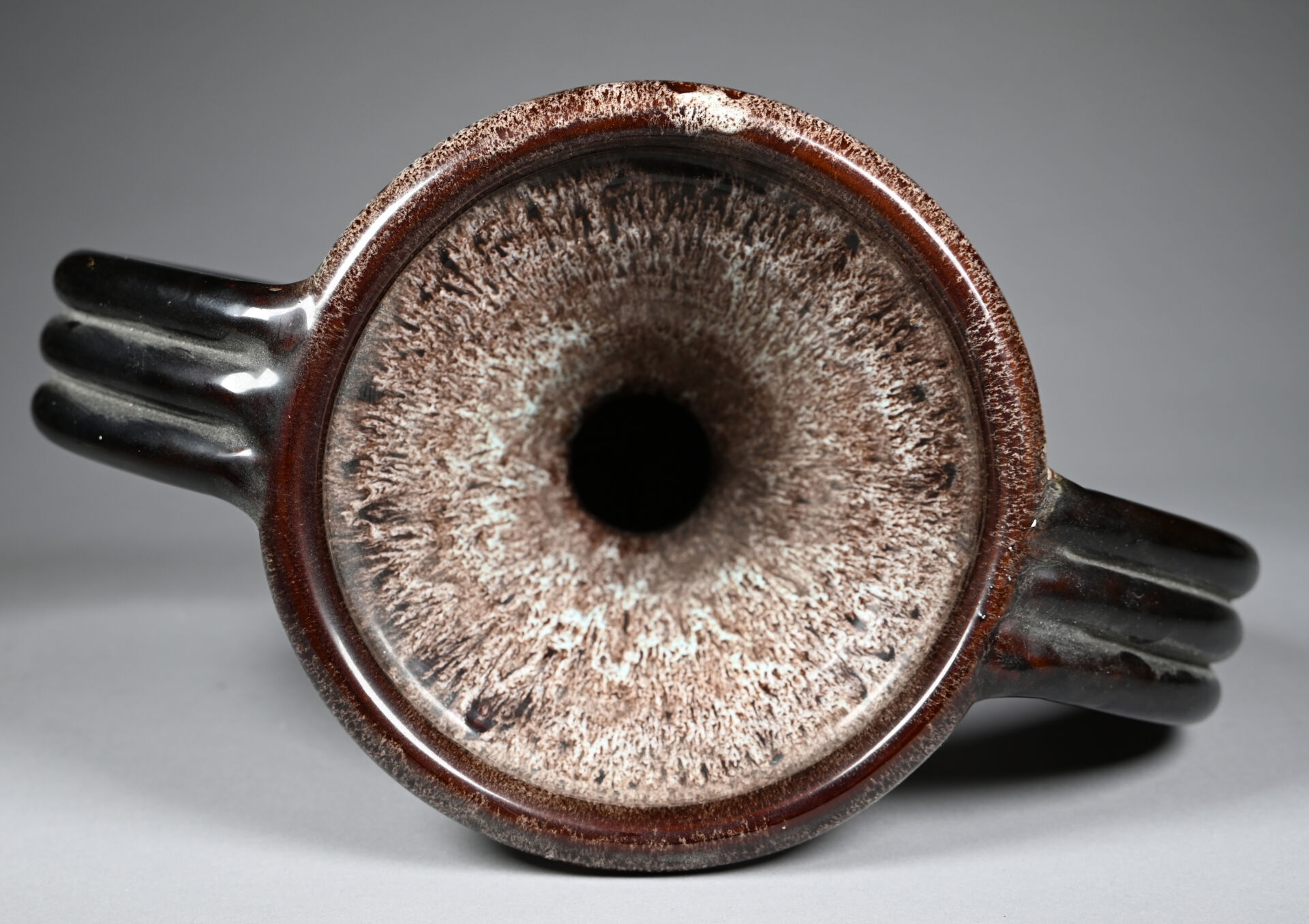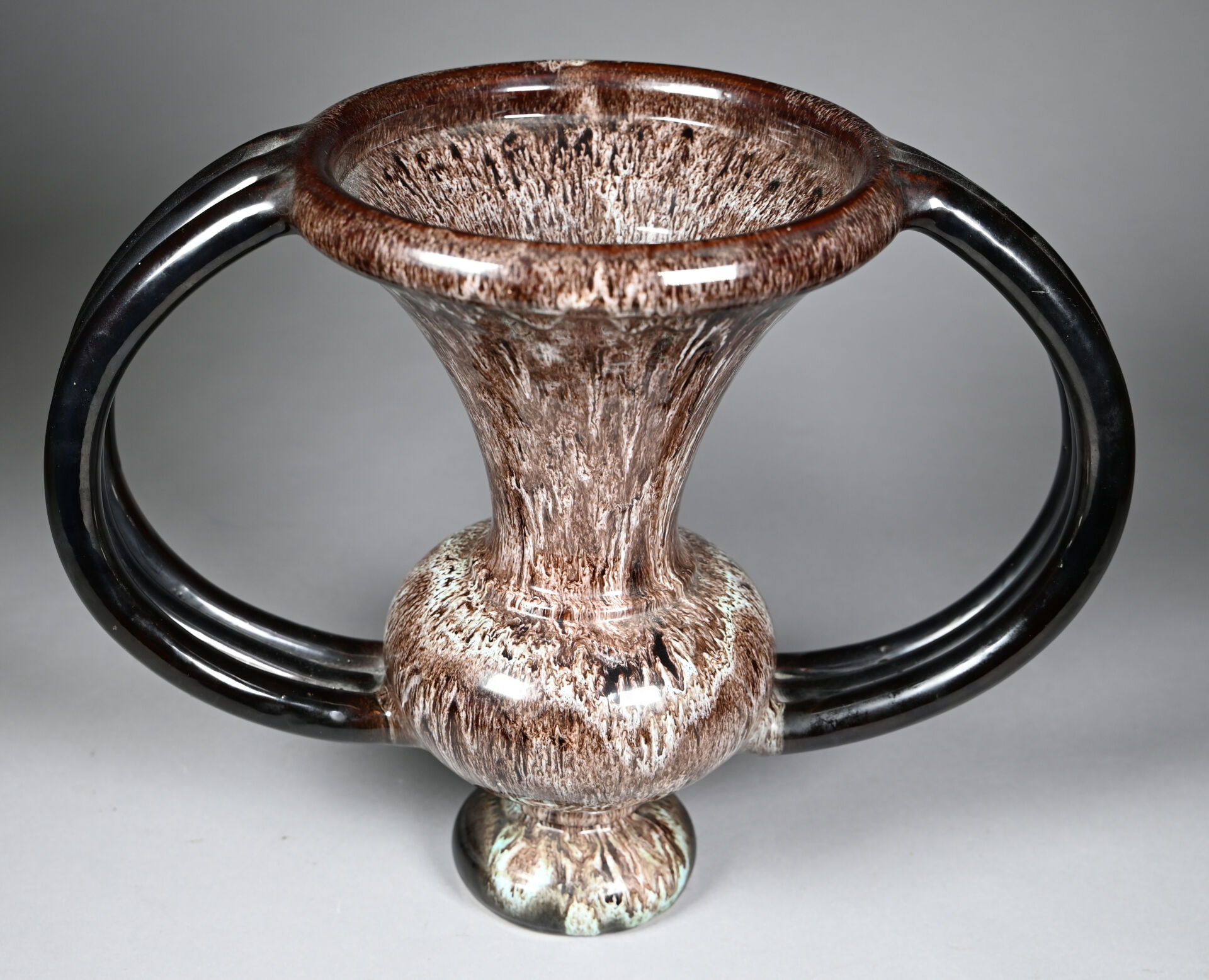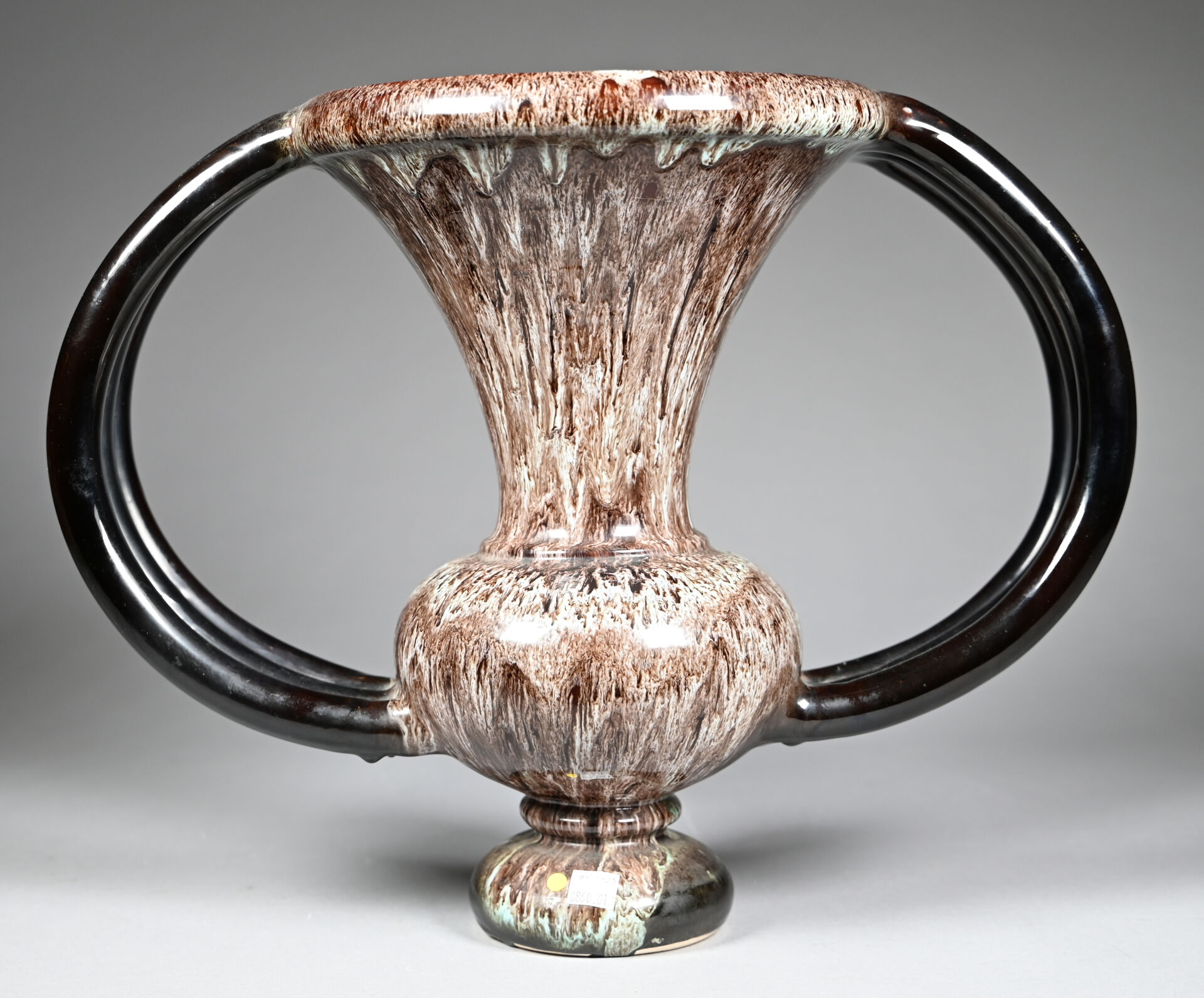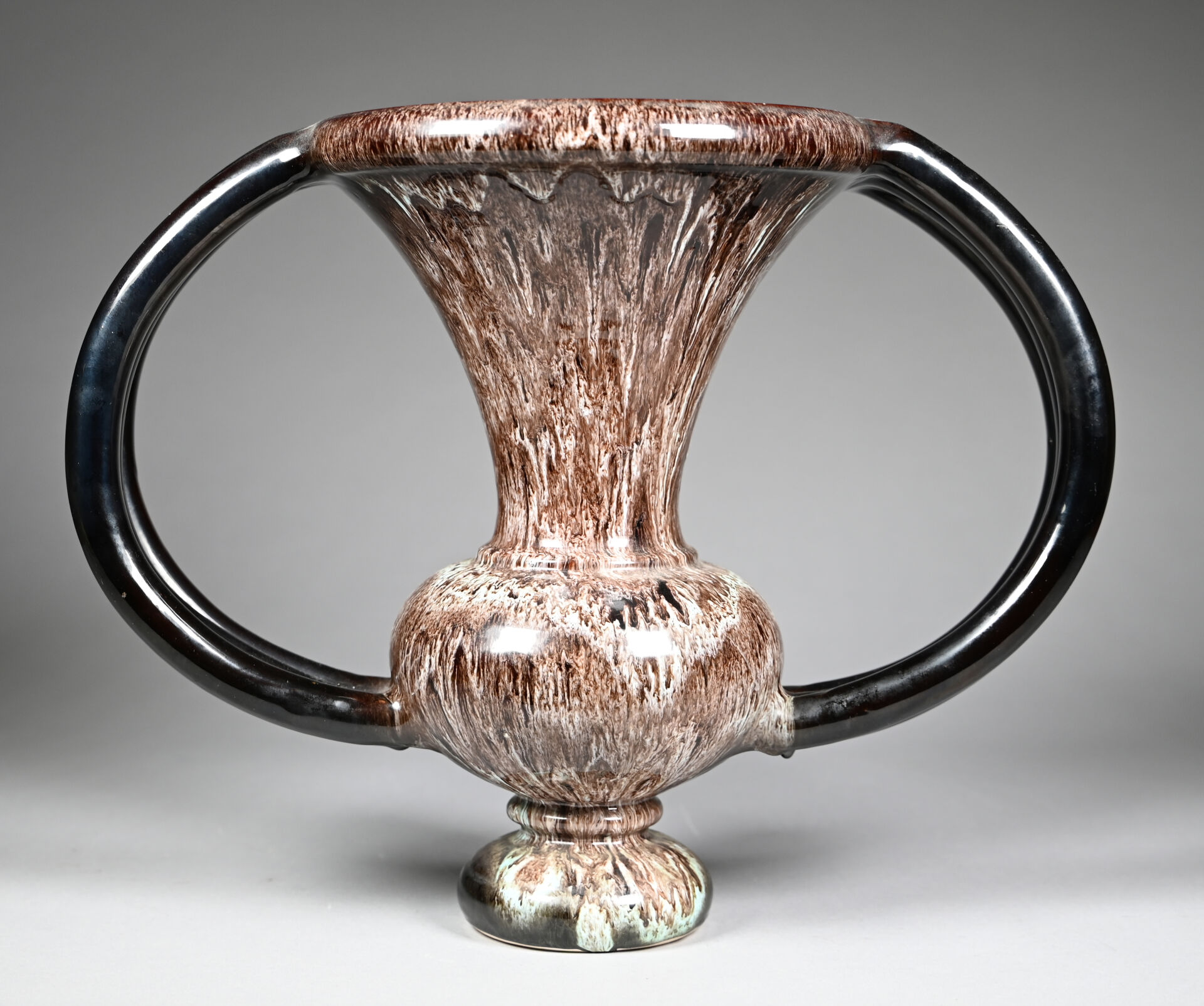 Marius GUIGE (1909 – 1980) à VALLAURIS. Vase à grandes anses en céramique émaillée brun à coulures grise ( un cheveu). Marqué au tampon au dessous. Haut. : 37 cm.