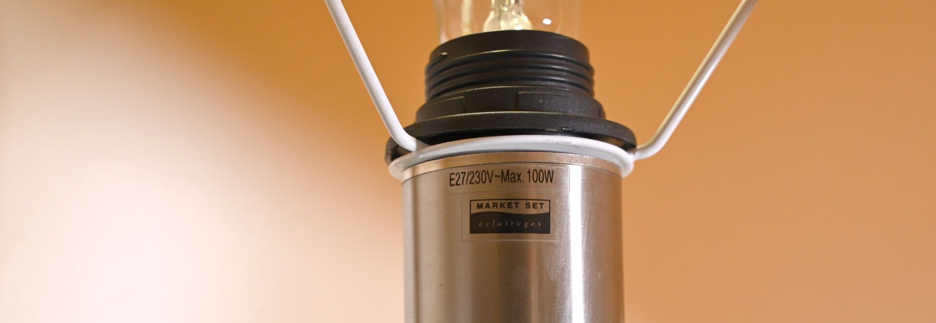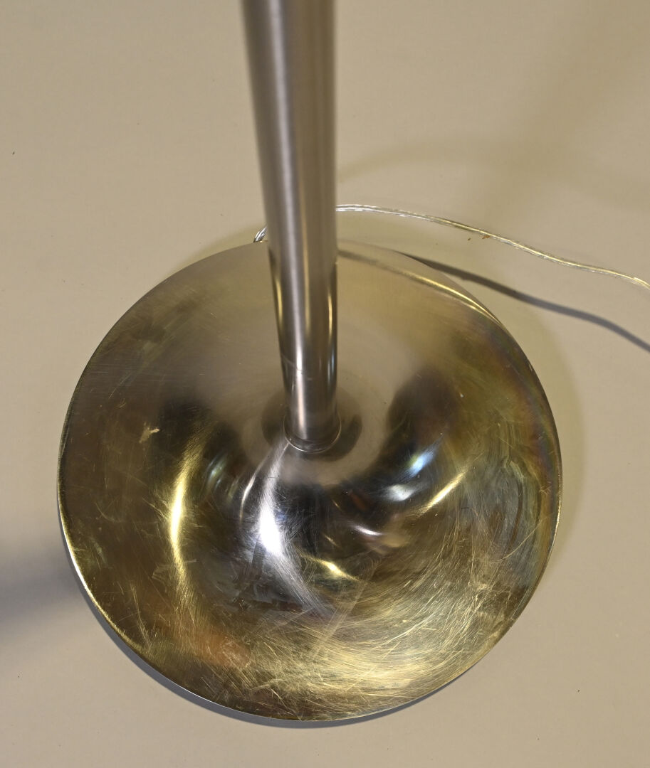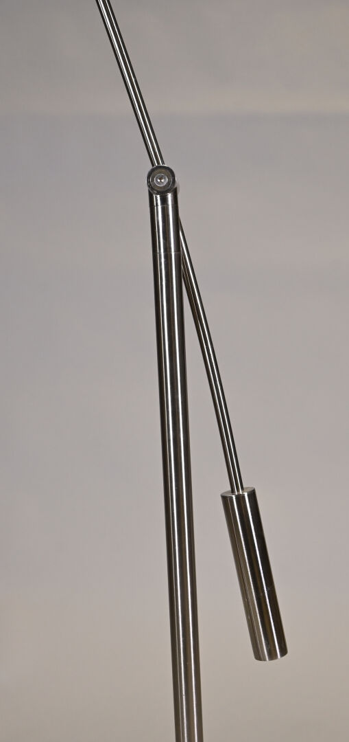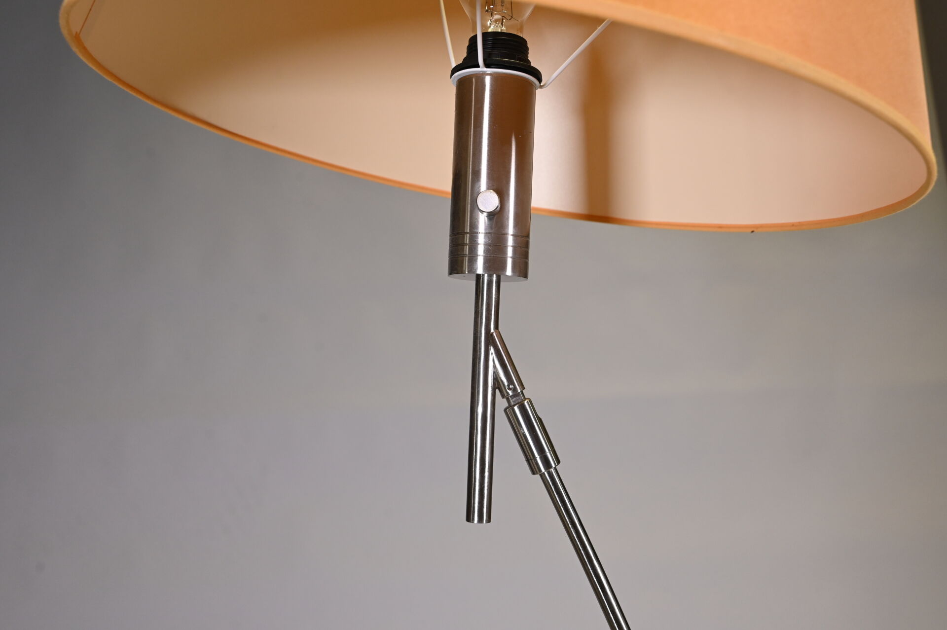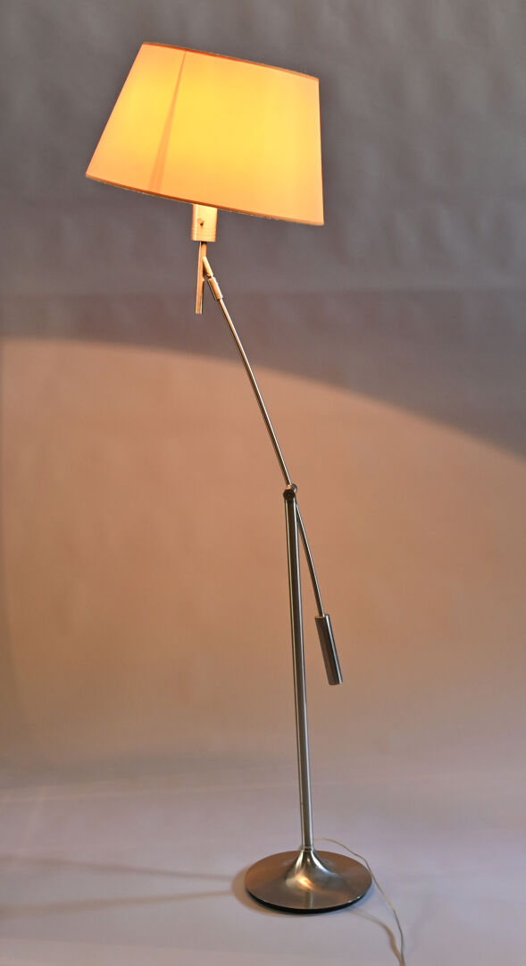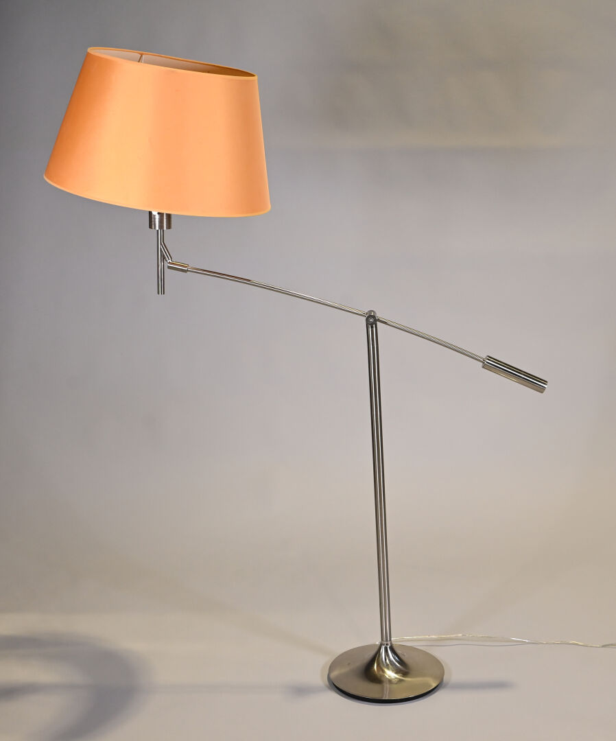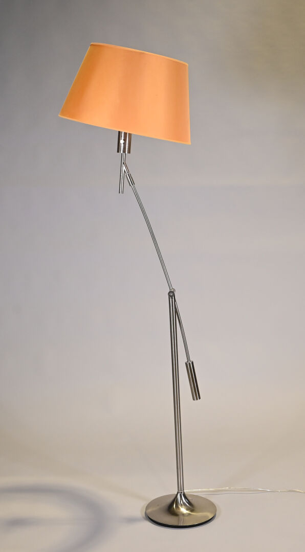 MARKET SET. Lampadaire à un bras bi-articulé en métal brossé. Abat-jour orange. Etiquette. Haut. moyenne : 170 cm.