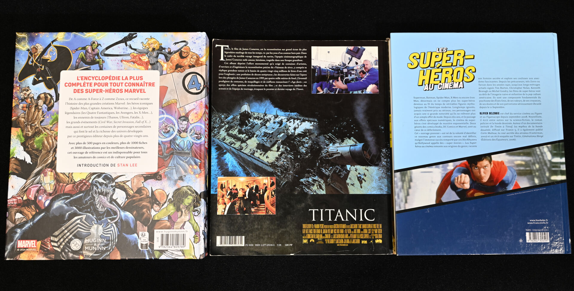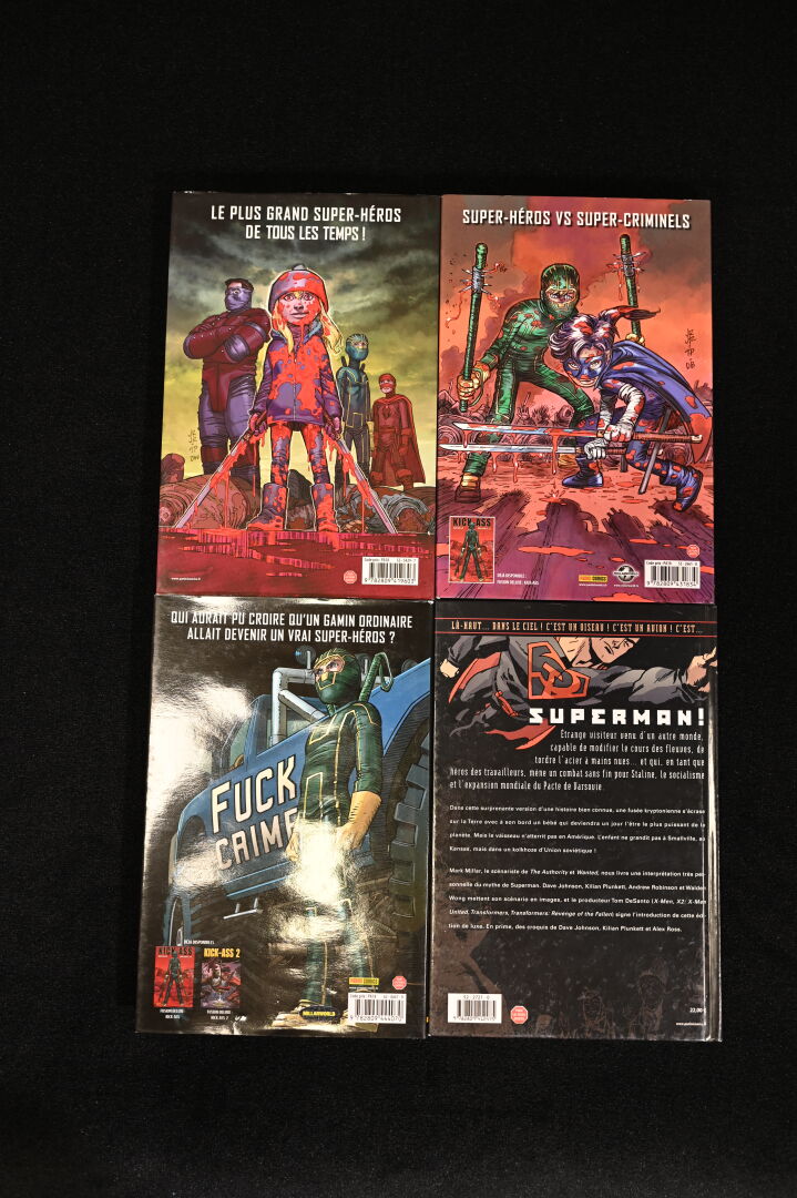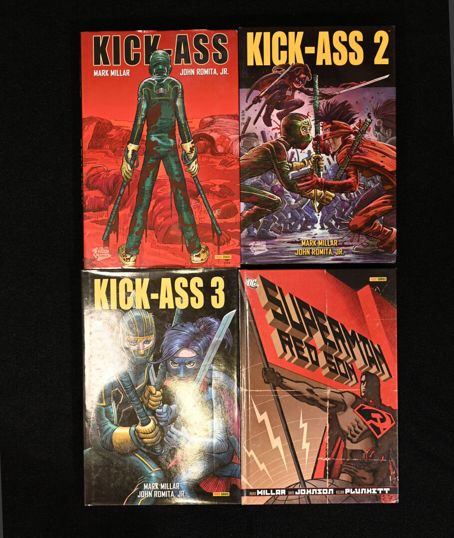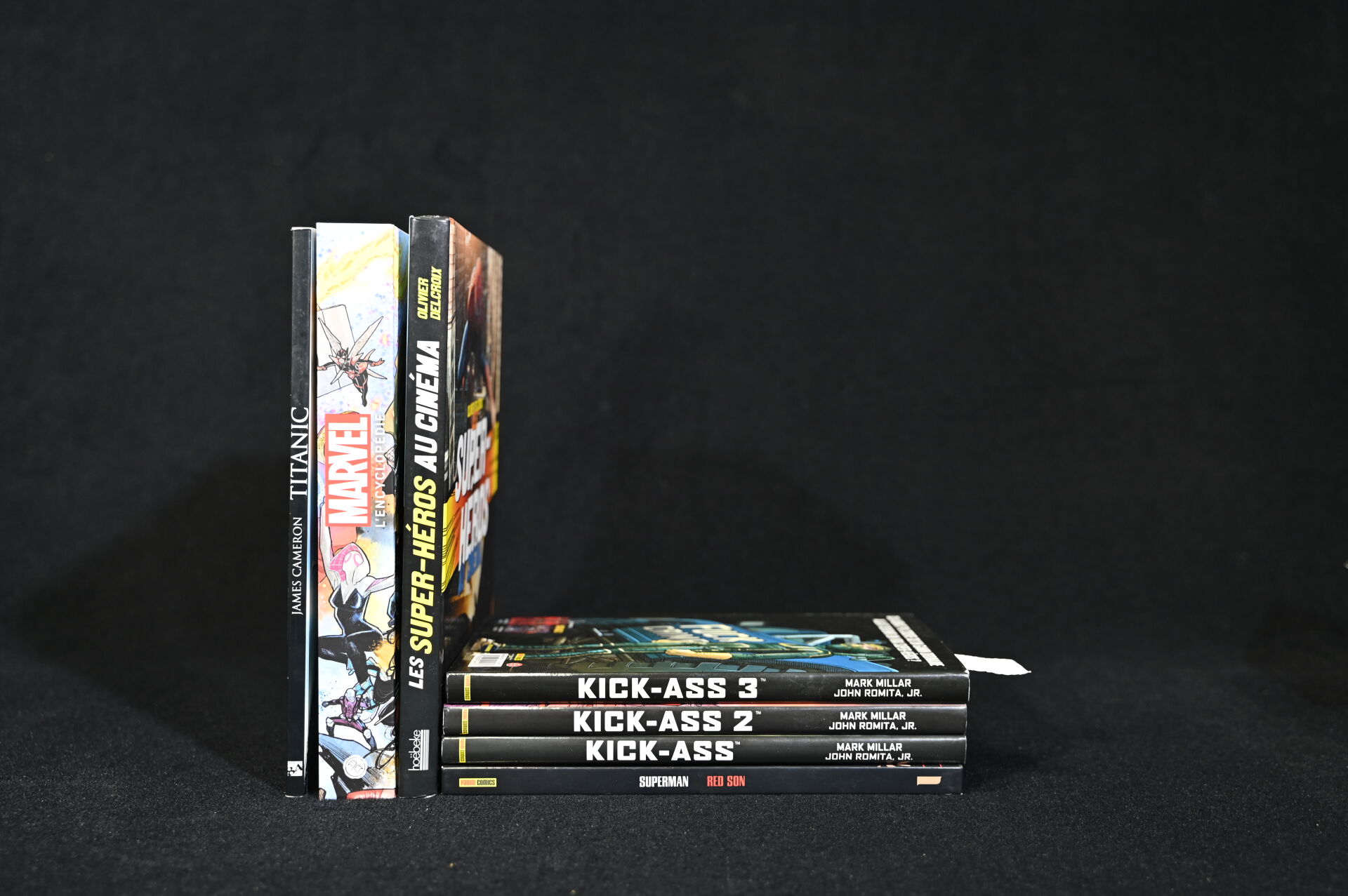 MARVEL et KICK-ASS. Ensemble de 6 ouvrages soit « MARVEL – L’Encyclopédie – Nouvelle Édition » Huginn & Muninn, 2024, « Les Super-Héros au Cinéma » d’Olivier Delcroix, Hoëbeke, 2012, « Superman Red Son » de Millar, Johnson et Plunkett, Panini Comics et trois livres « Kick-Ass » Panini Comics, 2011, 2013 et 2014.