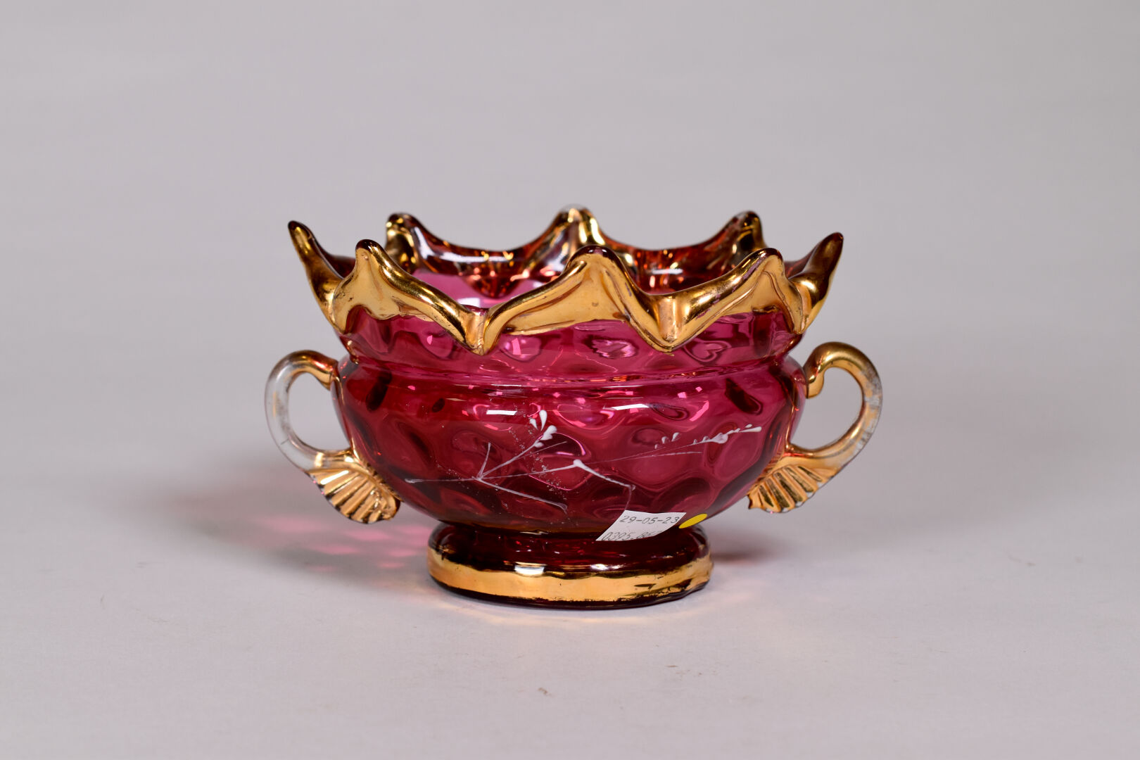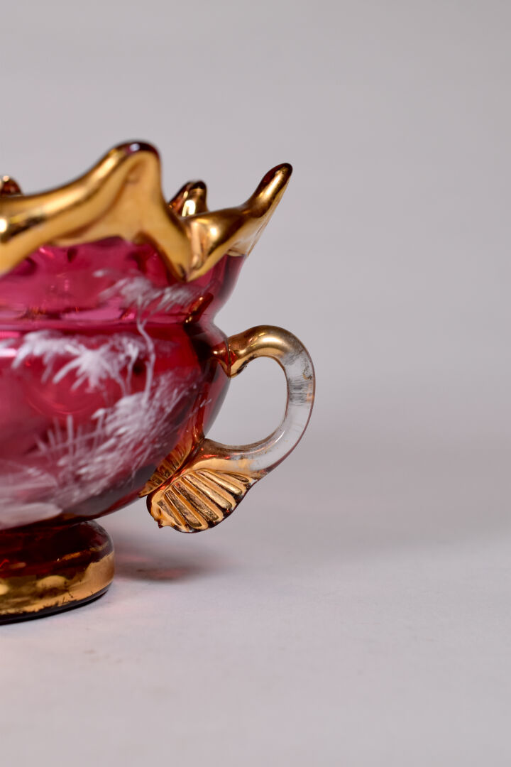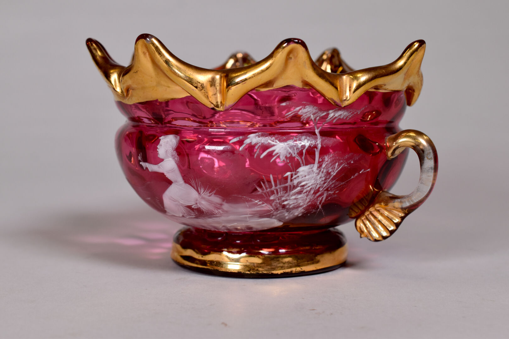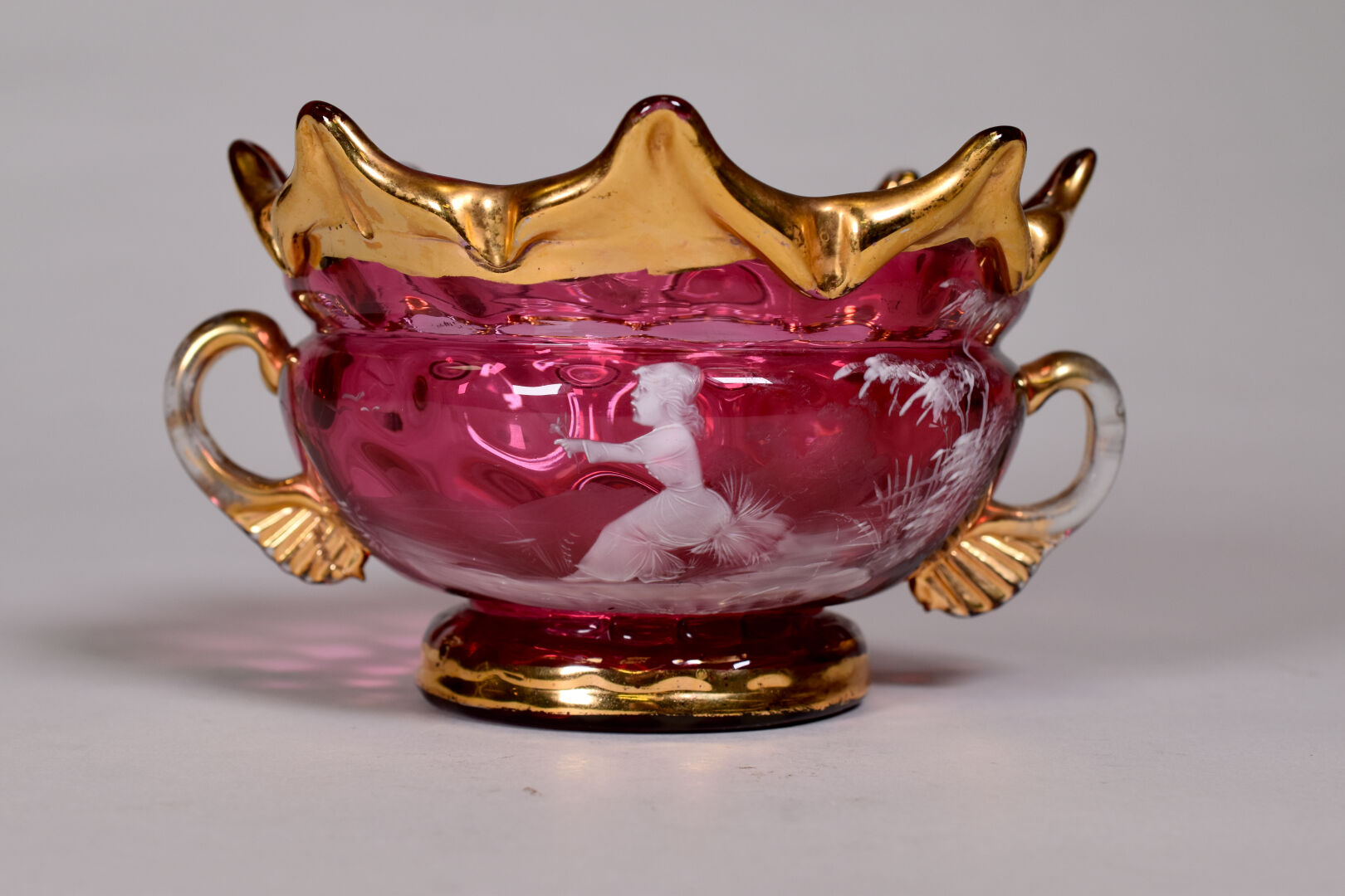 Mary GREGORY. Coupe sur piedouche en verre rose à décor émaillé en blanc d’une jeune fille tenant un bouquet, le col à pointe et les anses en dorure. Haut. : 10,5 cm.
