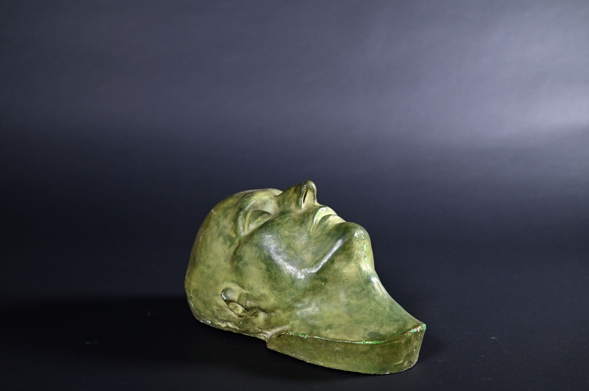 Masque mortuaire de Napoélon Ier en plâtre peint vert (égrenures et restaurations ). Haut. : 20 cm – Long. : 30 cm.