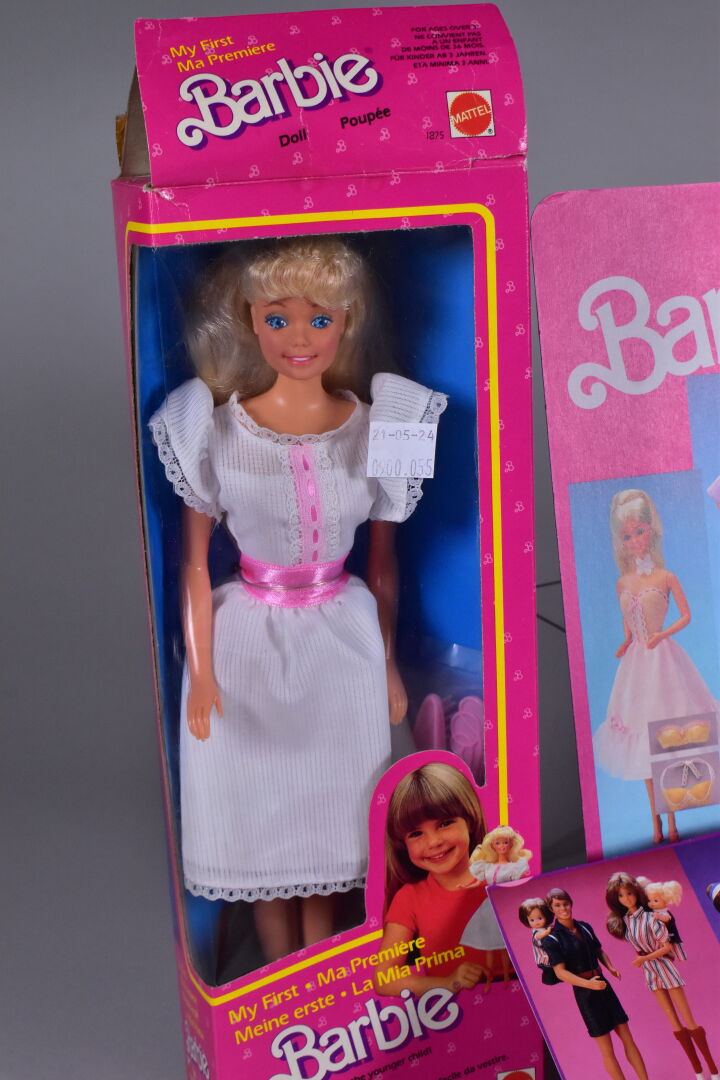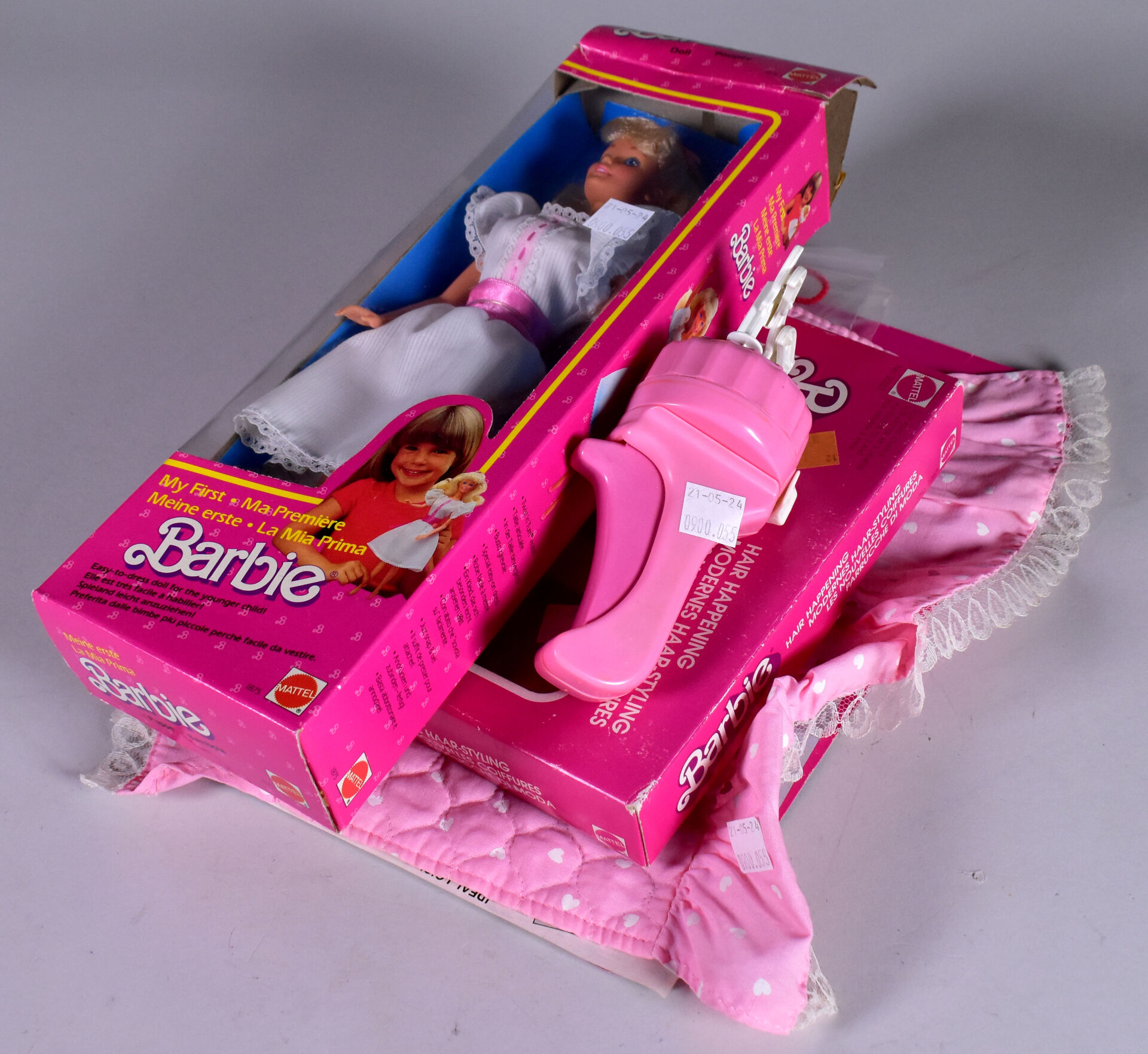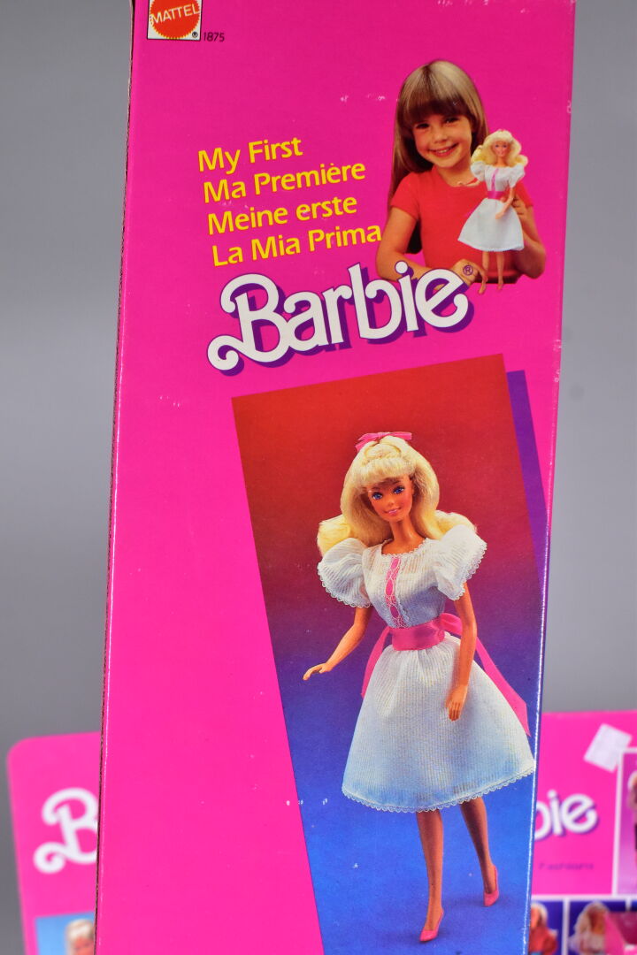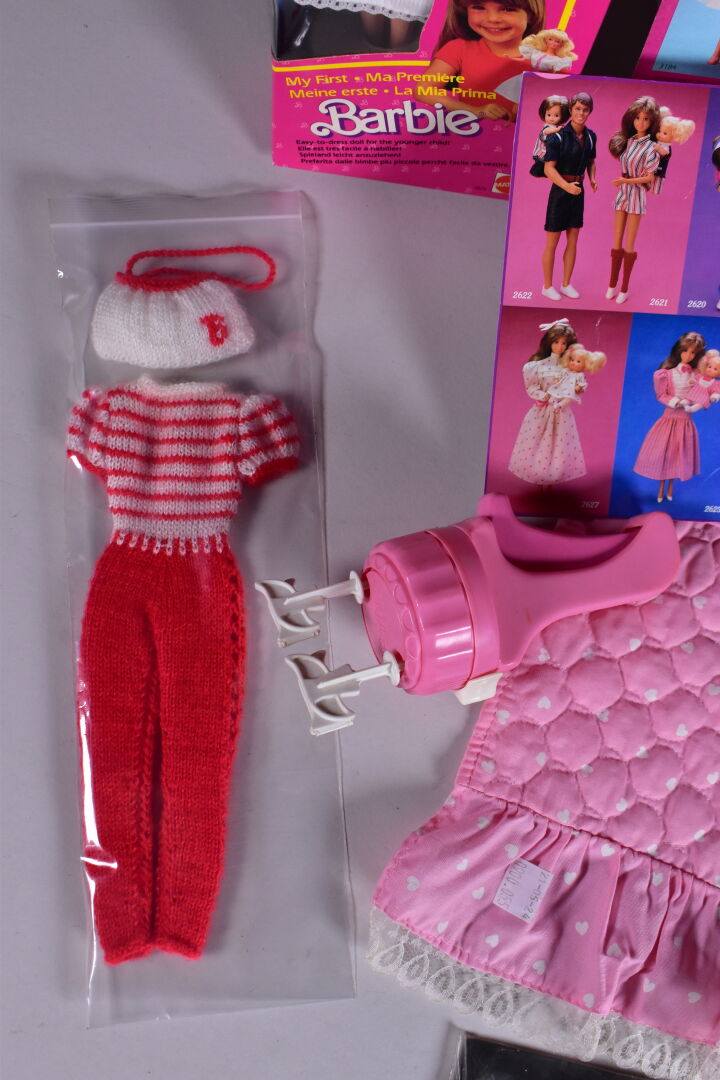 Mattel Barbie 1978/80 lot de 2 blisters cartonnage en état d’usage Barbie ma première réf 1875 et Hair Happening ref 2267 on y joint un petit lot de vêtements, dessus de lit etc…