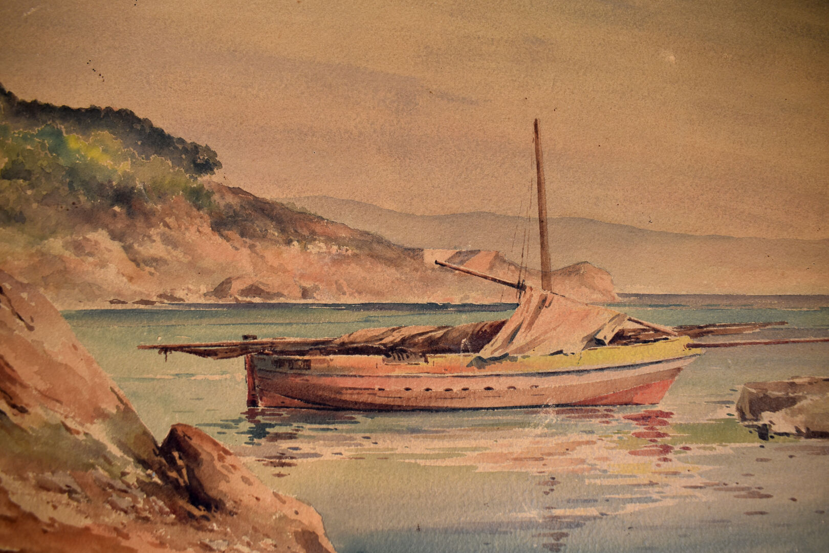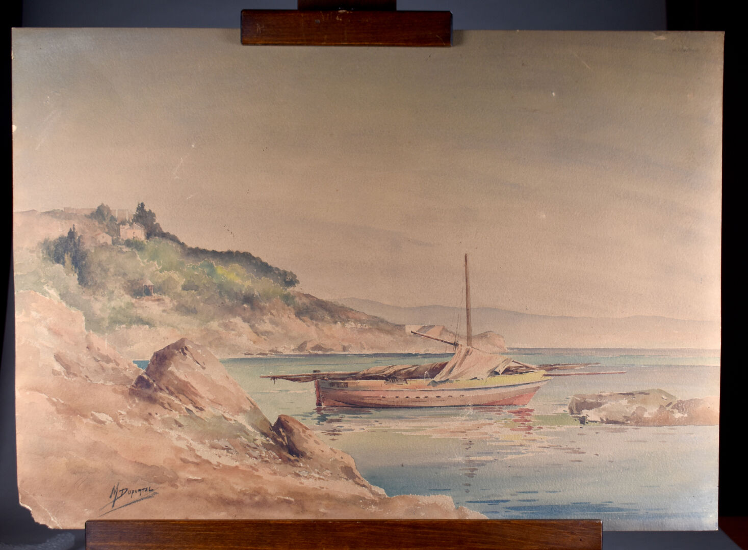 Maurice DUPORTAL (1857 – 1925). Bateau au mouillage. Aquarelle sur papier cartonné signée en bas à gauche. Quelques usures et une déchirure. 48 x 67,5 cm.