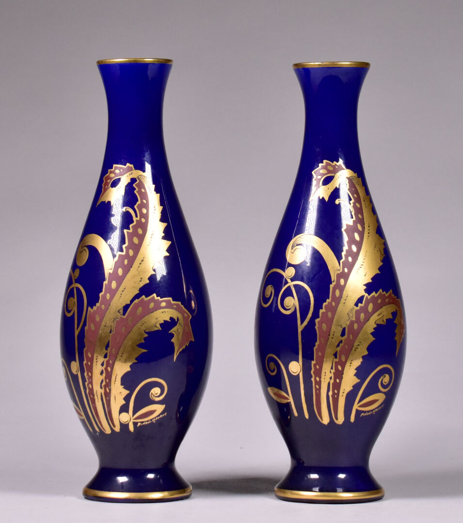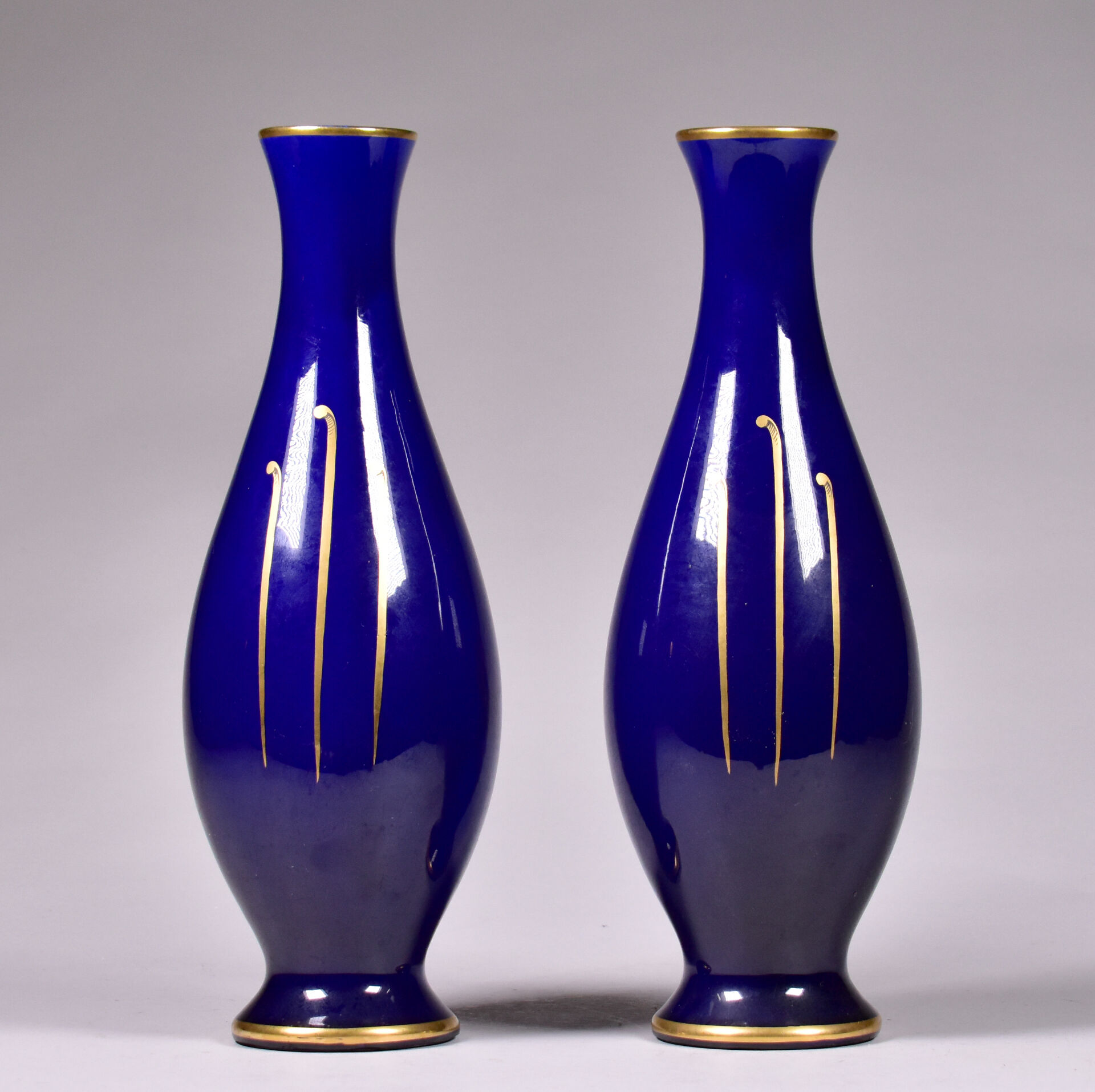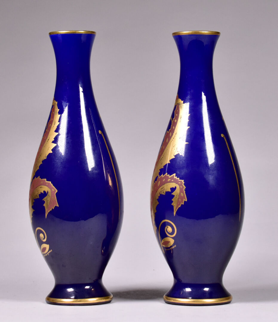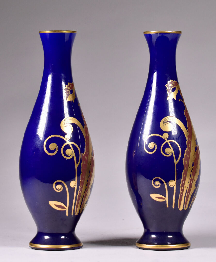 Maurice PINON à Tours. Paire de vases balustre en porcelaine émaillée à décor végétal en or et ocre sur fonds bleu. Signés dans le décor. Haut. : 29,5 cm.
