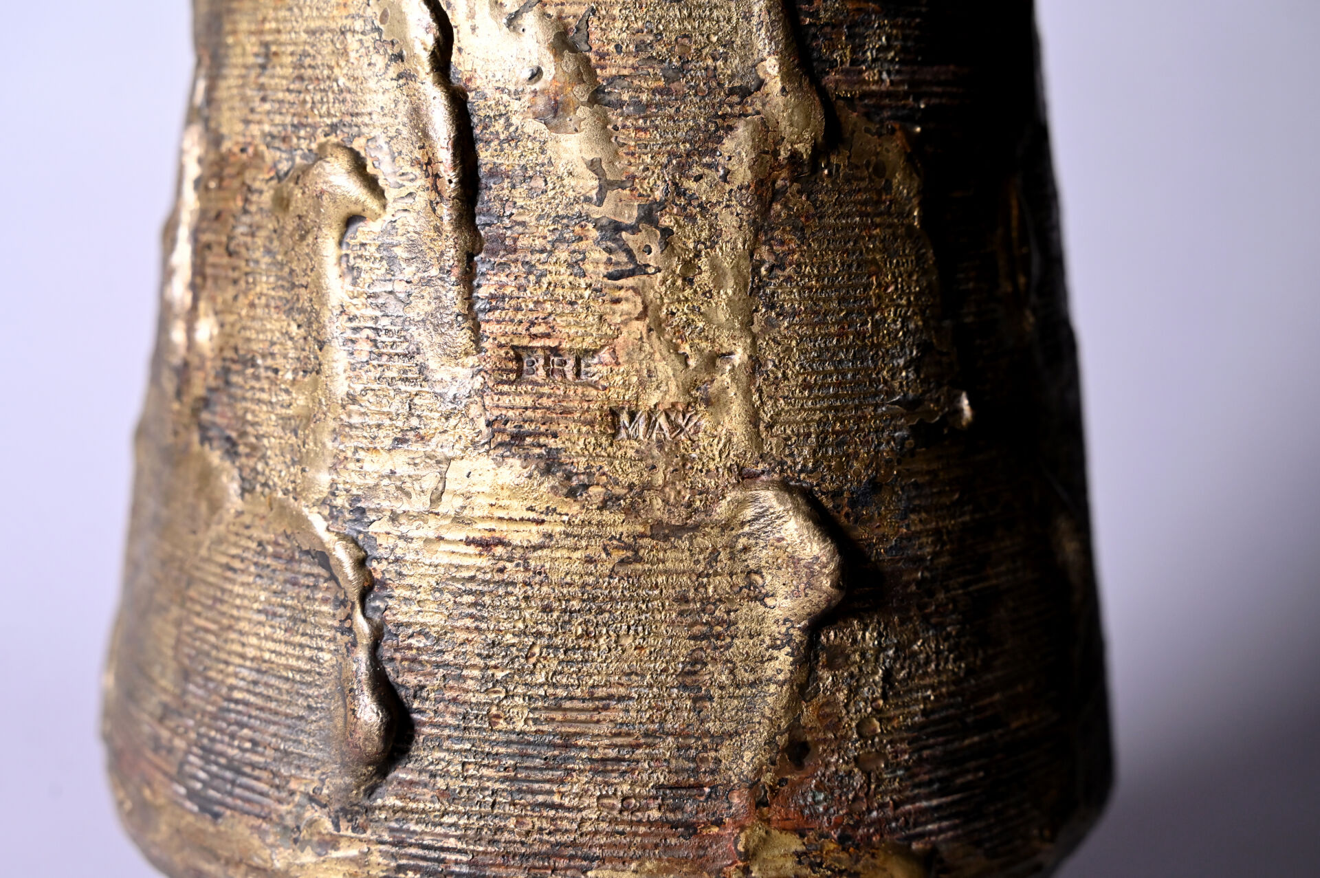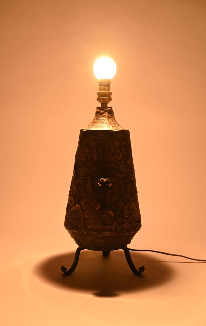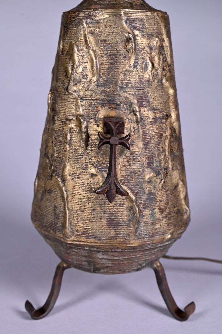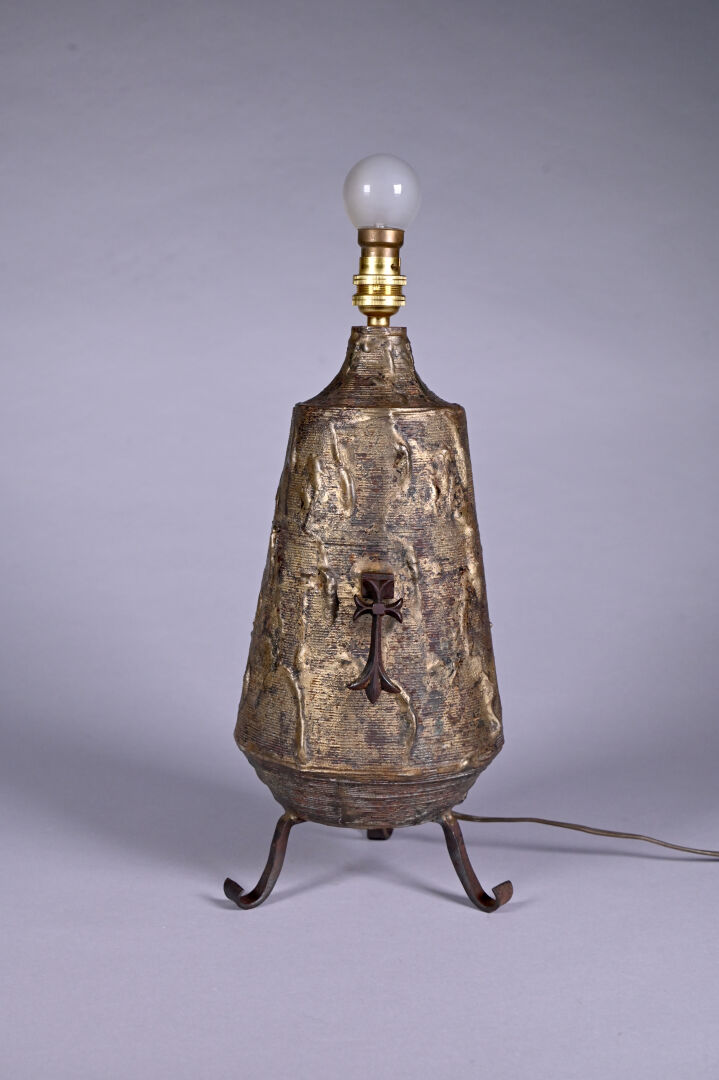 Max BRE (XXe siècle). Lampe à poser en métal doré et piétement tripode. Signée. Haut. : 37,5 cm (hors ampoule).