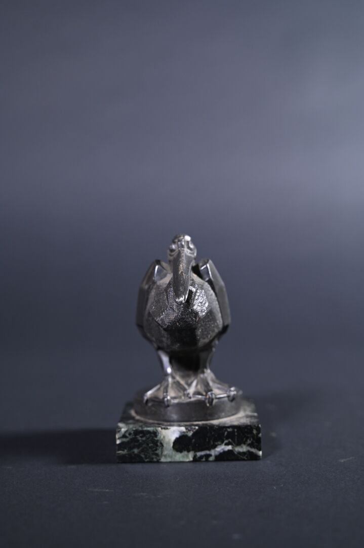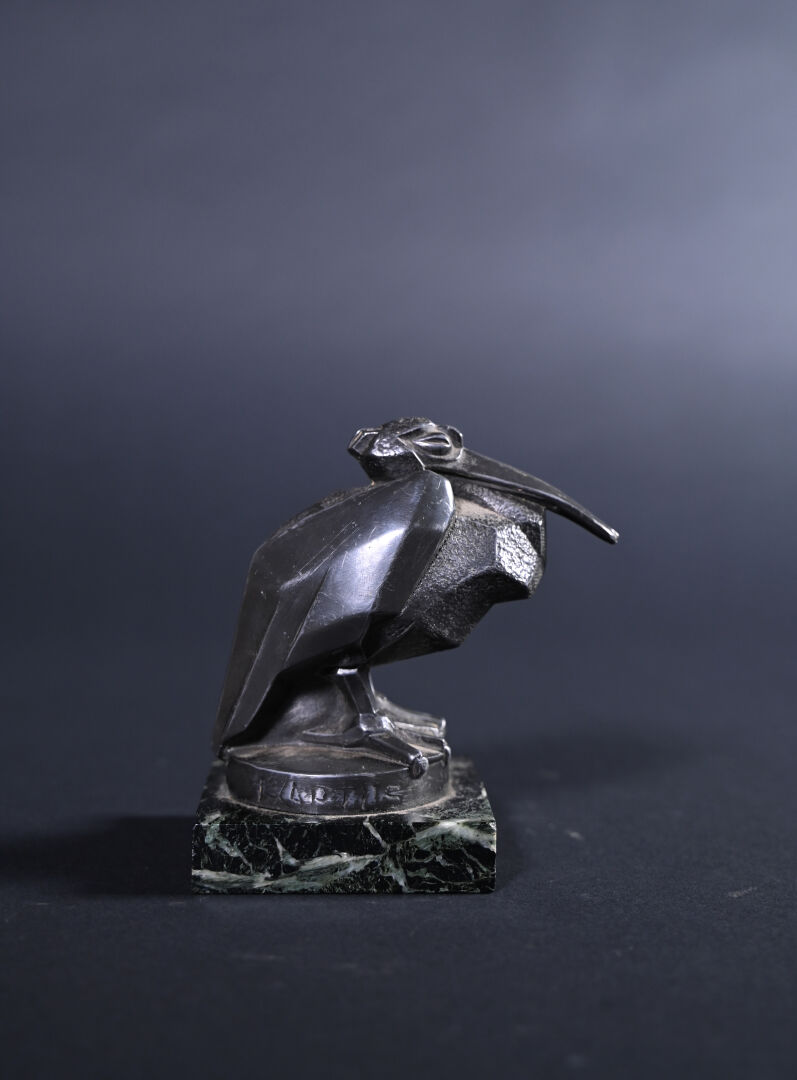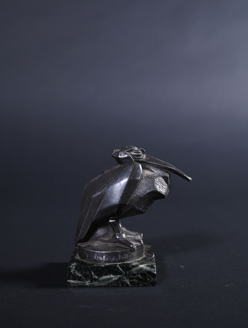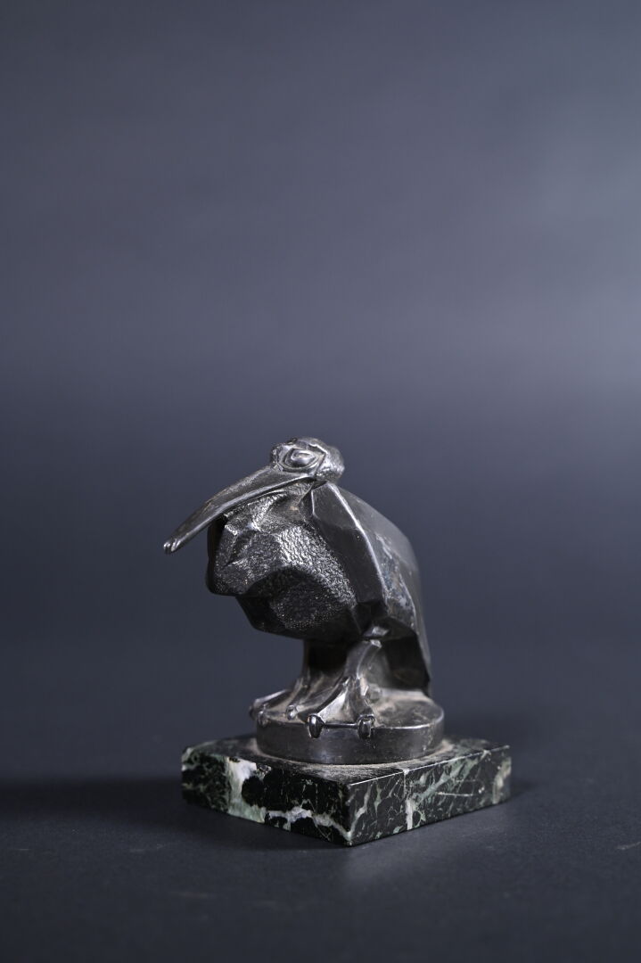 Max LE VERRIER (1891-1973) dit ARTUS. Mascotte automobile en métal à patine argentée représentant un pélican (usures à la patine). Signé sur la terrasse. Montée sur un socle en marbre vert de mer., signée sur la terrasse, montée sur un bouchon de radiateur. Haut. : 13 cm.