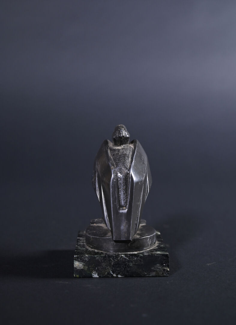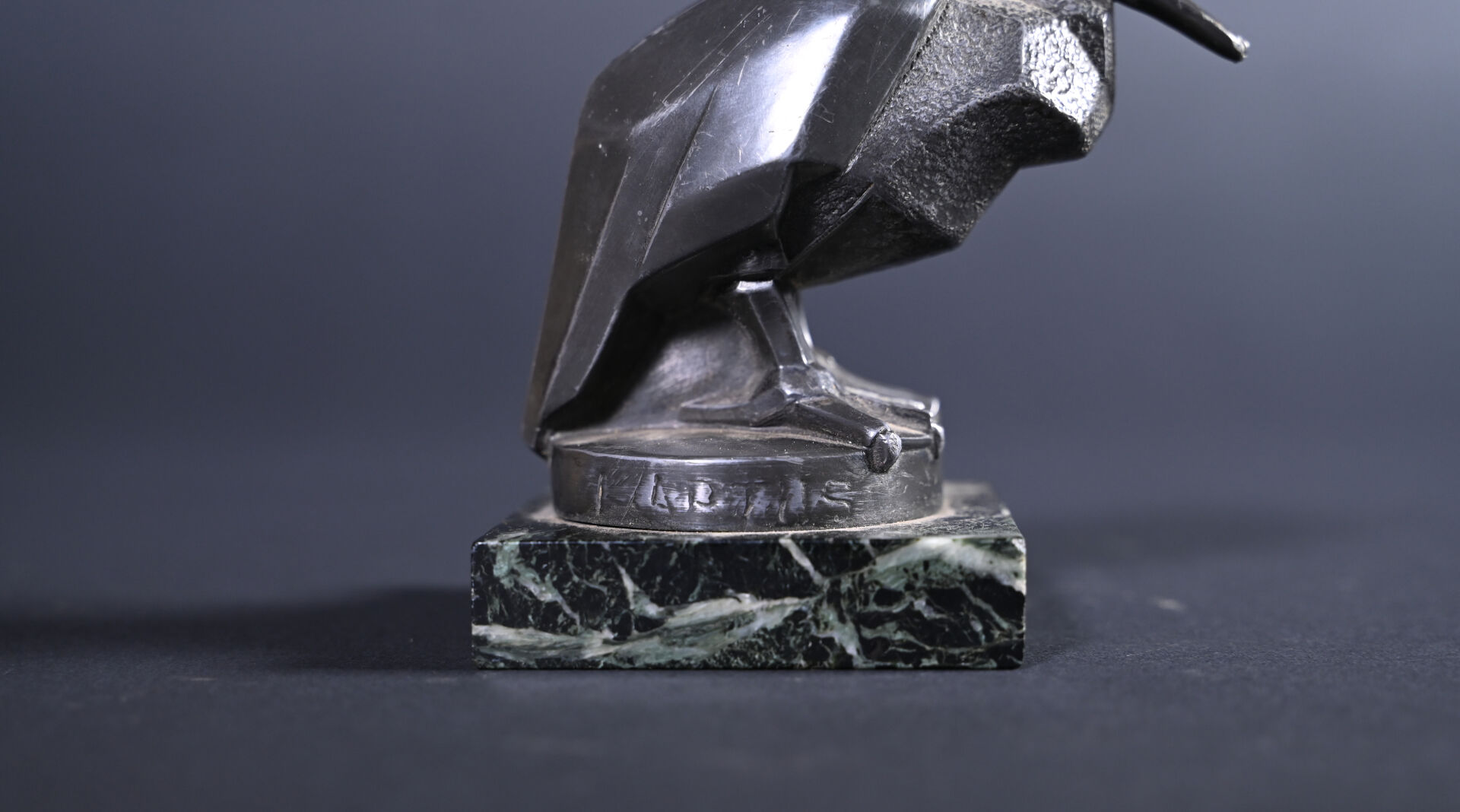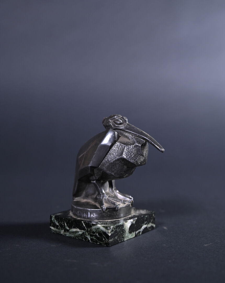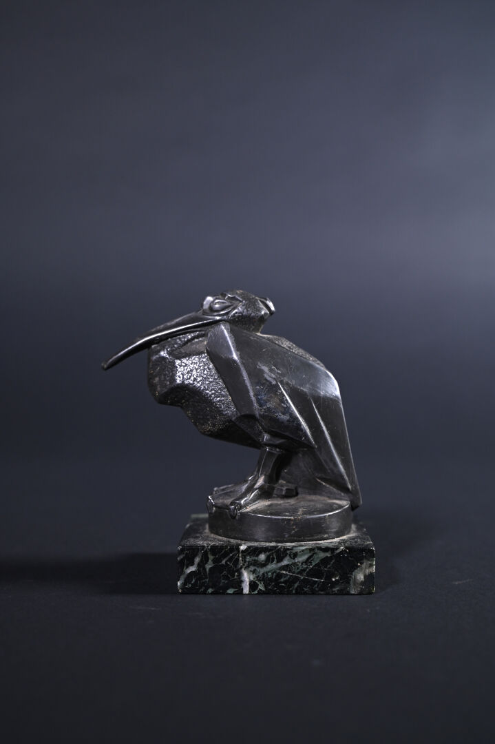 Max LE VERRIER (1891-1973) dit ARTUS. Mascotte automobile en métal à patine argentée représentant un pélican (usures à la patine). Signé sur la terrasse. Montée sur un socle en marbre vert de mer., signée sur la terrasse, montée sur un bouchon de radiateur. Haut. : 13 cm.