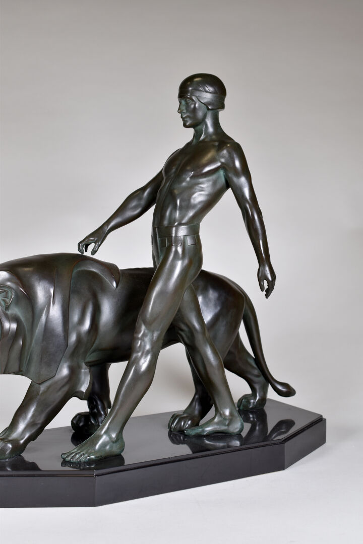 Max LE VERRIER (1891-1973). « Le Belluaire ». Sculpture en régule patiné brun vert. Socle en marbre noir. Signée sur la terrasse. Haut. : 57 cm – Larg. : 58 cm – Prof. : 22,5 cm.