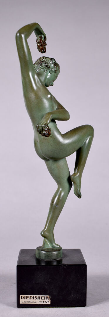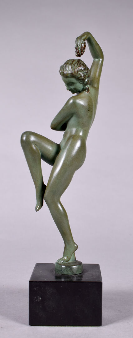 Max LE VERRIER (1891-1973) Sujet en régule à patine verte La femme à la grappe de raisins. Signé à la base. Socle de pierre noire. Haut. : 28 cm.