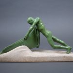 MAX LE VERRIER. « Vers le Large ». Figure en régule repatinée verte et pierre sculptée. Marquée sur la barque. Travail Art déco. Haut. : 21 cm – Larg. : 38,3 cm – Prof. : 11 cm.
