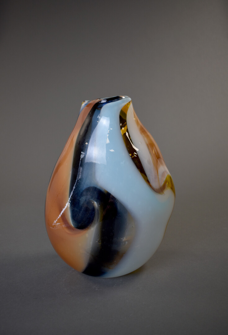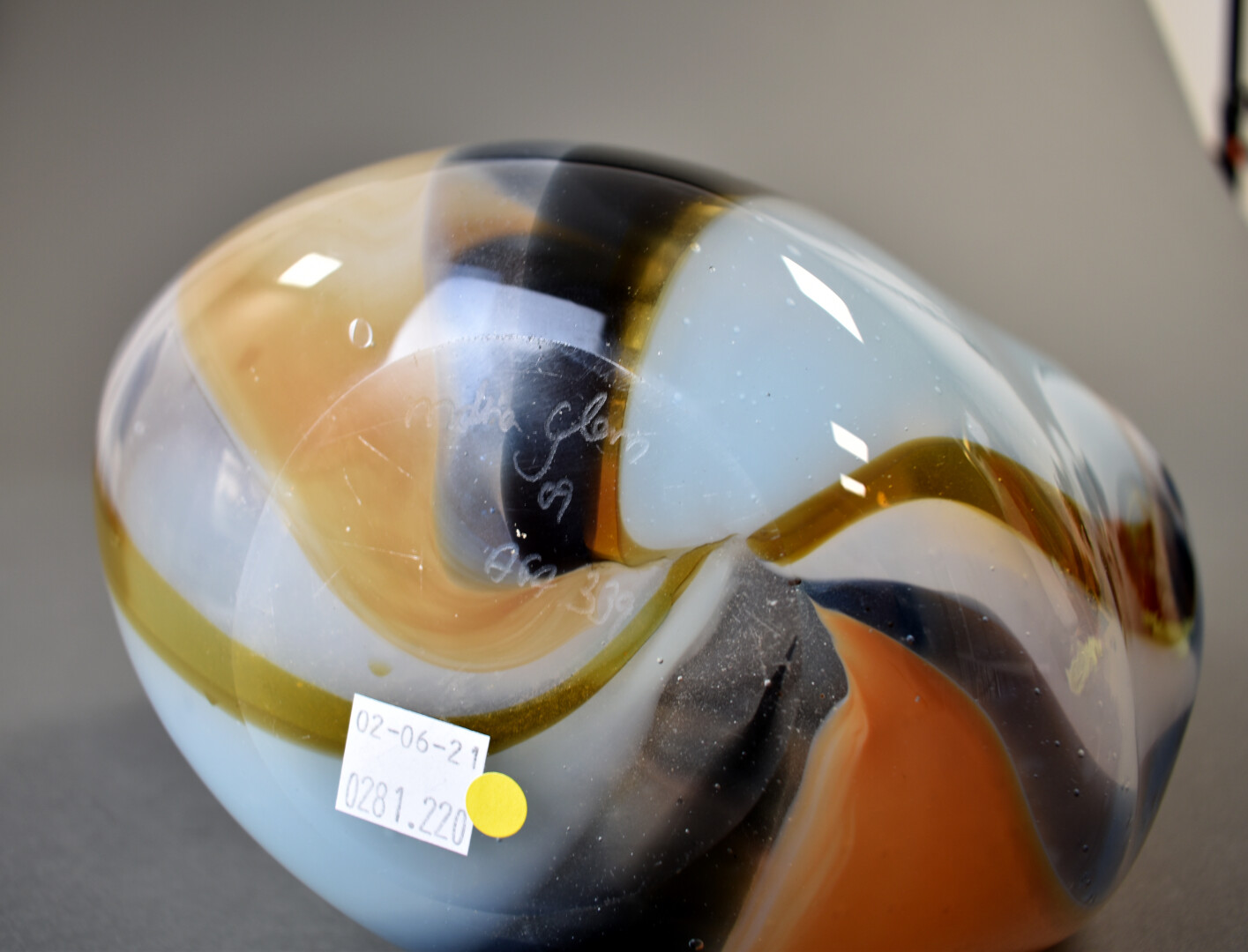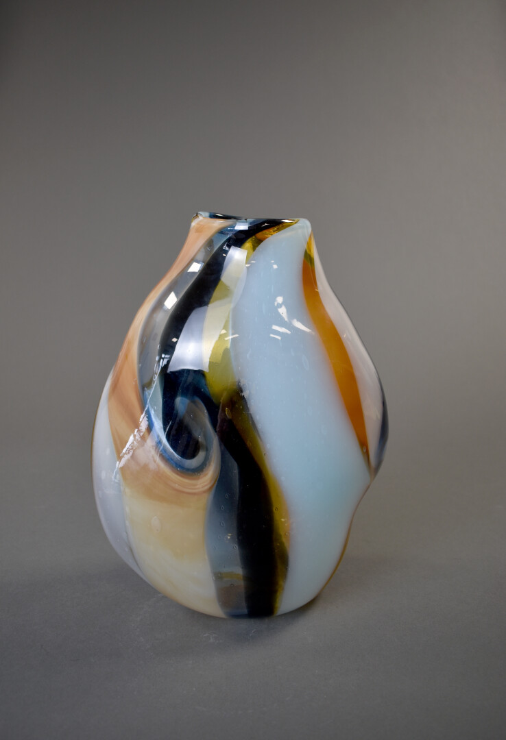 MDINA – Malte. Vase de forme libre en verre à ruban ocre, brun et crème sur fond légèrement bullé. Haut. : 31 cm.