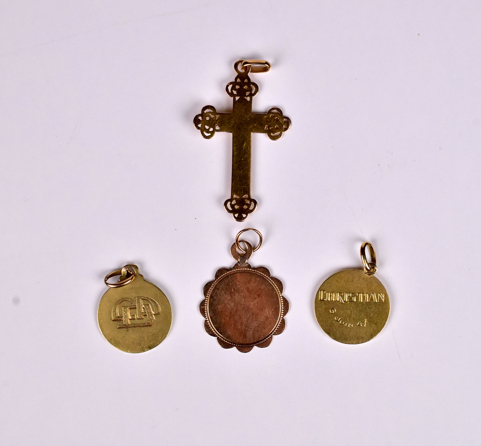 Médaille à la vierge en or jaune 18K 750/1000e . Diam. : 3 cm. Non gravée. Légers chocs. Poids. : 3,6 g.