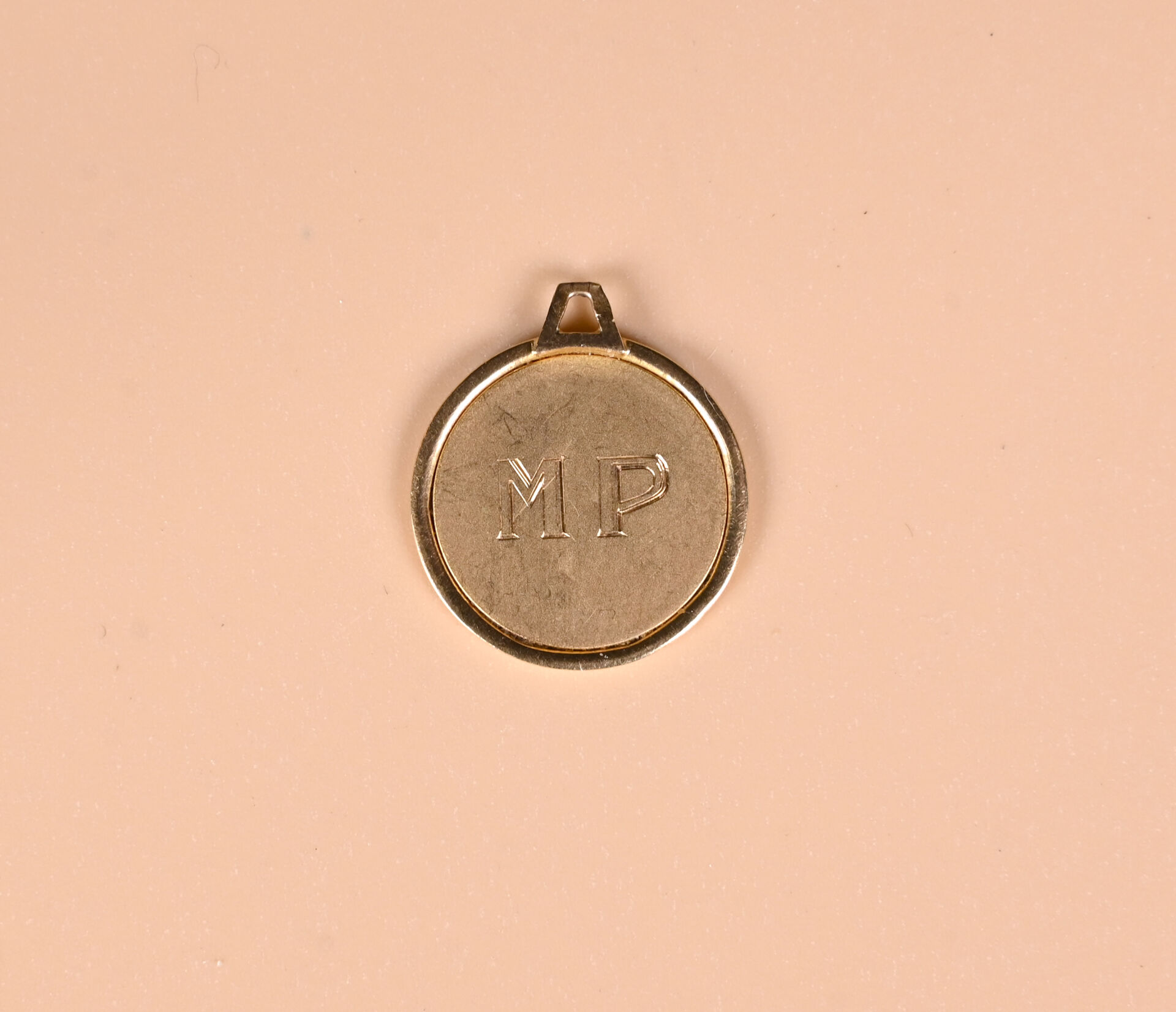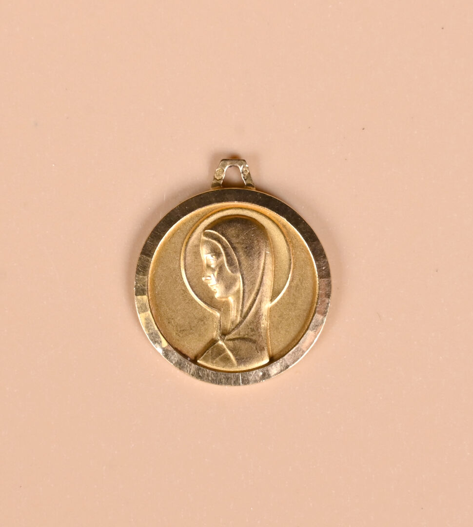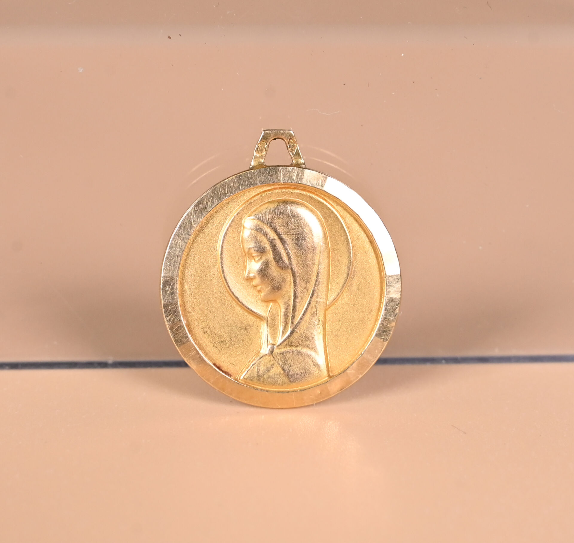 Médaille à la vierge en or jaune 18K 750/1000e, gravée M.P. Poids. : 1,21 g.