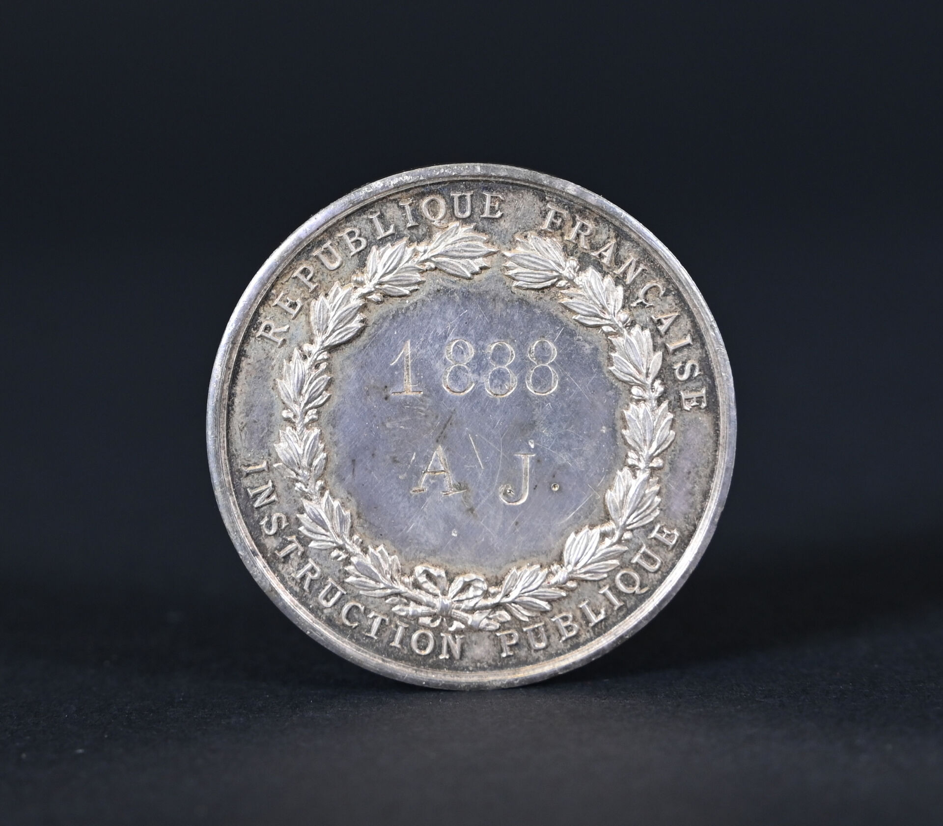 Médaille commémorative en argent « Instruction publique 1888 A.J ». Poids : 32,5g. Avec son écrin