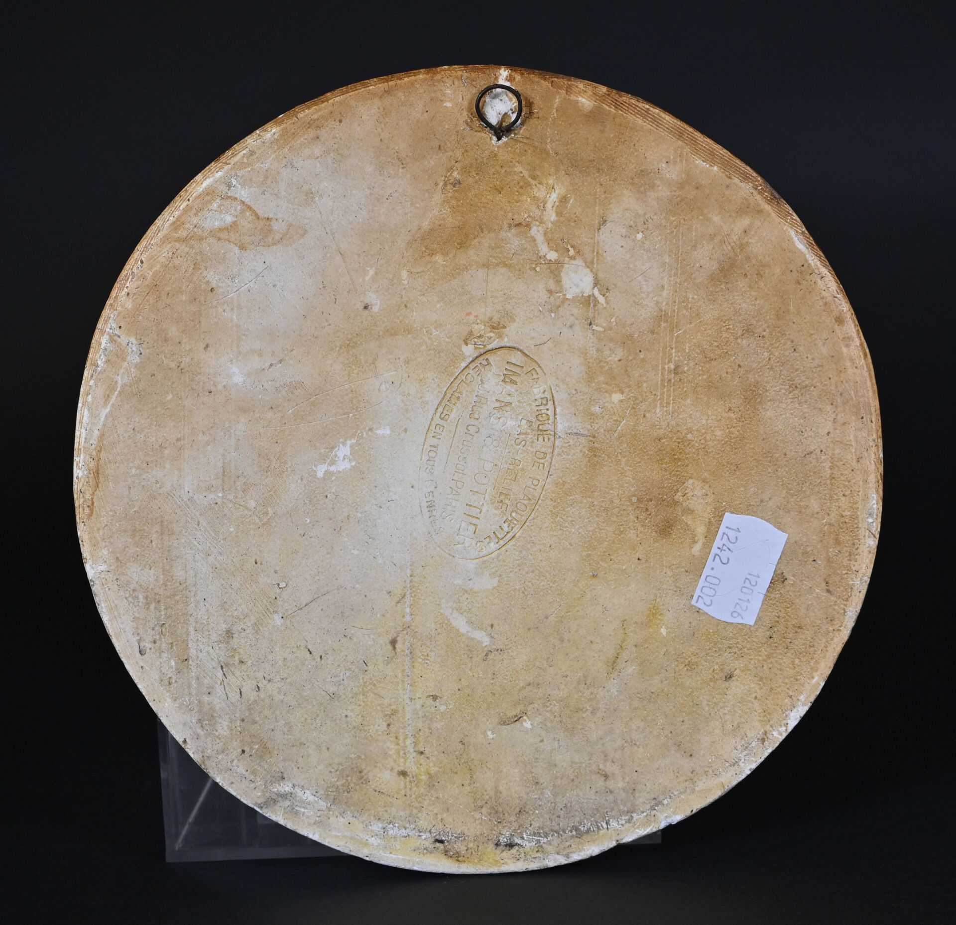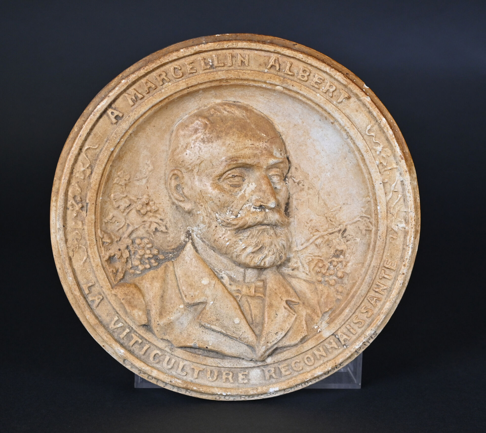 Médaillon en plâtre en bas relief représentant Marcelin ALBERT. Au dos, cachet IMANS 8 POTTIER – 16 Rue Crussot Paris. Marqué. Diam. : 19.5 cm.