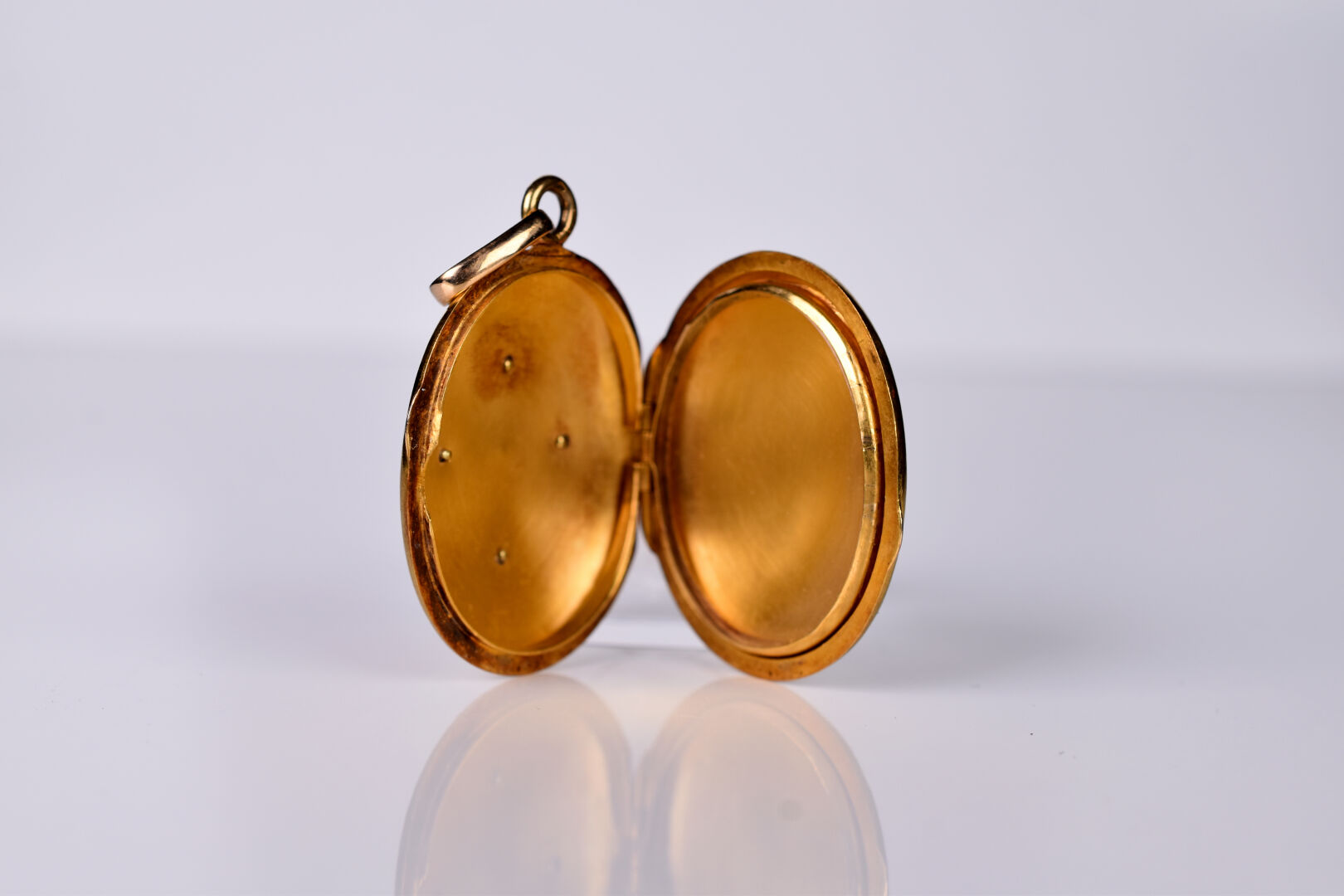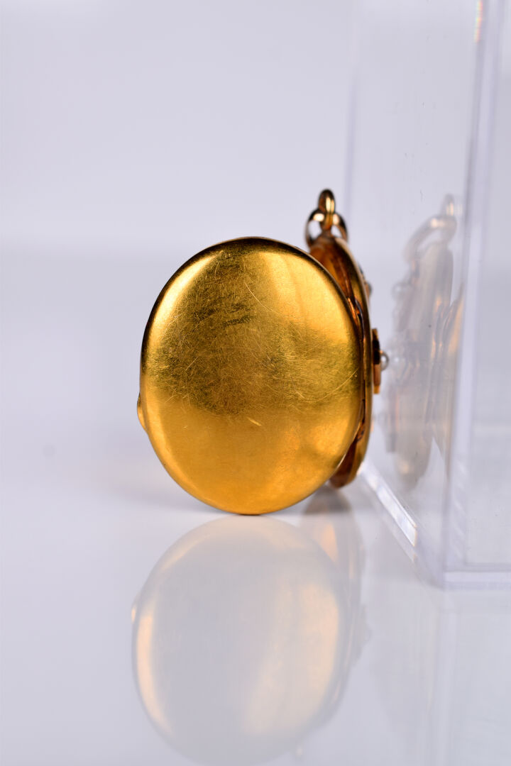 Médaillon porte photo en or jaune 18K 750/1000e orné d’une croix à décor appliqué de petites semence de perles et émail noir (avec un verre à l’intérieur). Haut. : 4,5cm. Poids brut. : 14 g.