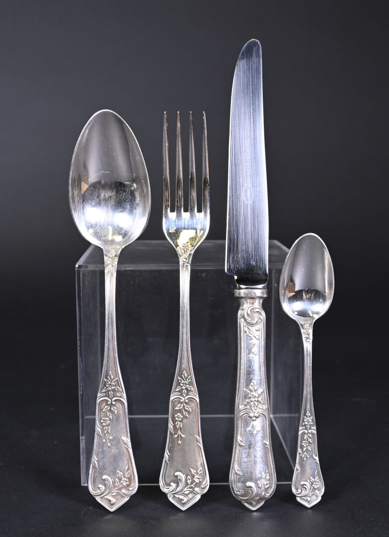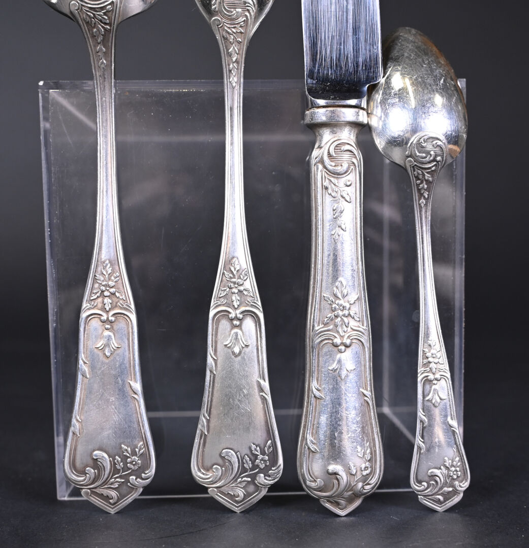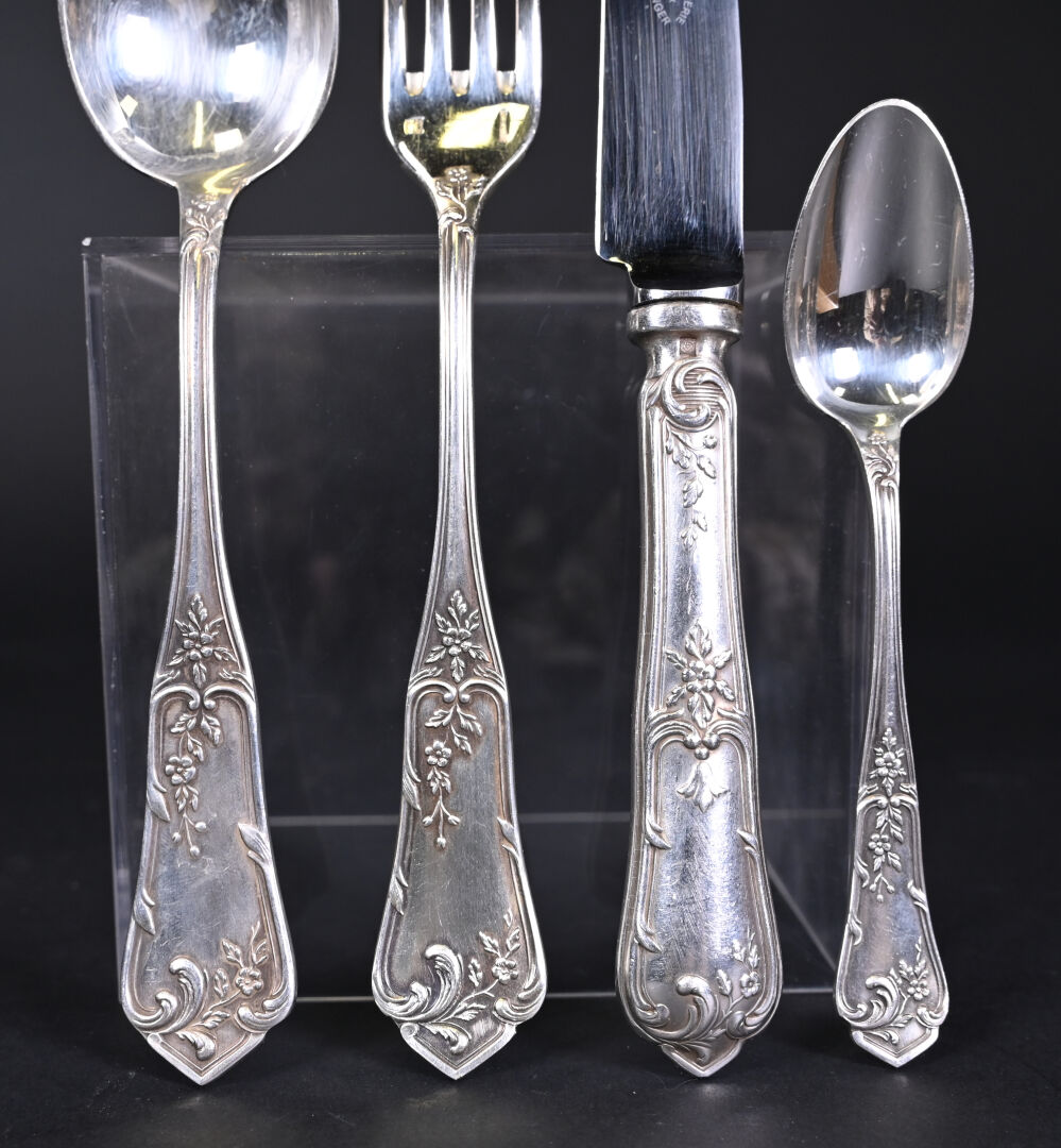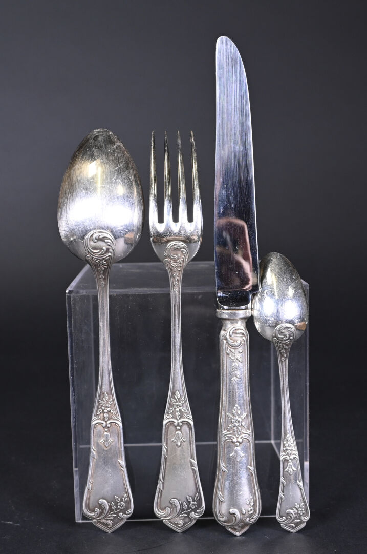 Ménagère 12 couverts en métal argenté (fourchettes + couteaux + Cuillères + cuillères à café et louche) à décor rocaille. Orfèvre BOULENGER. Ecrin.