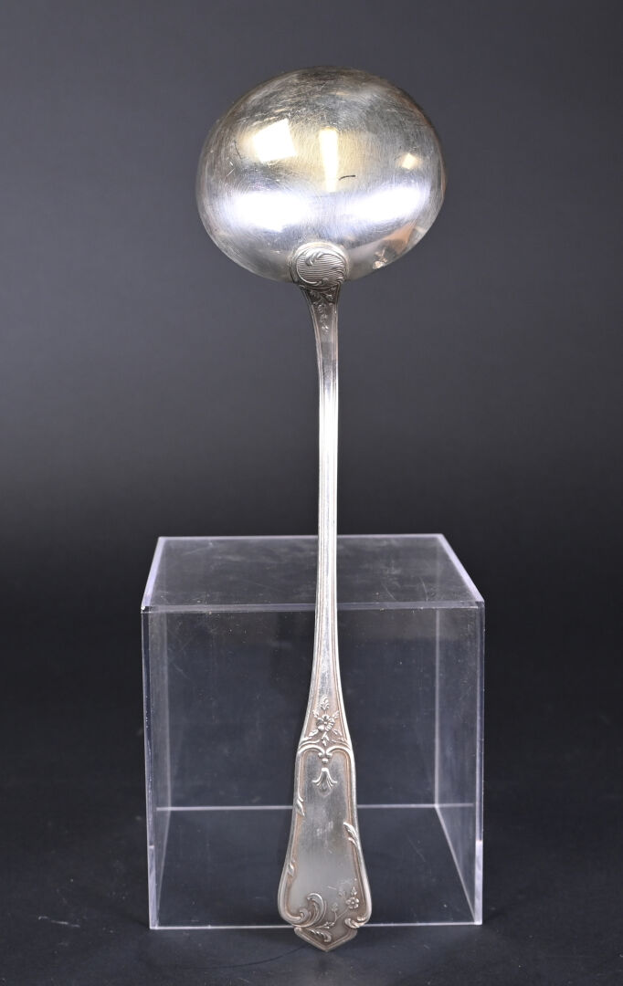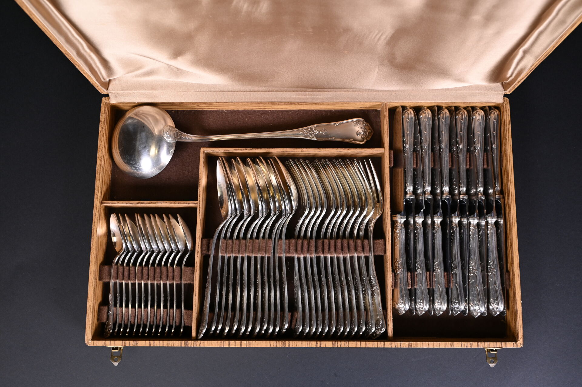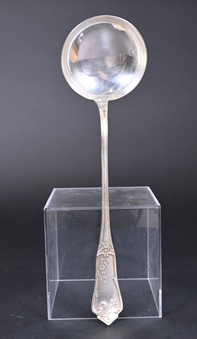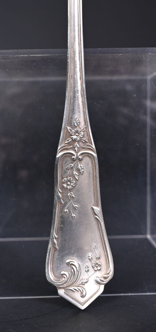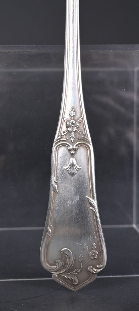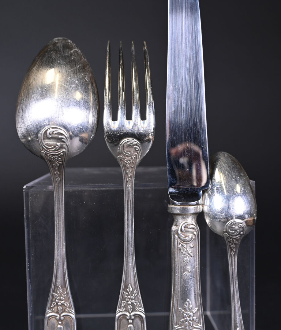 Ménagère 12 couverts en métal argenté (fourchettes + couteaux + Cuillères + cuillères à café et louche) à décor rocaille. Orfèvre BOULENGER. Ecrin.