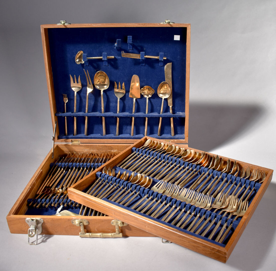 Ménagère en métal doré comprenant 140 pièces dont couteaux à fromage, fourchettes à gâteau, cuillères à glace, pièces de service etc. Coffret (usures). Vers 1930/1940.