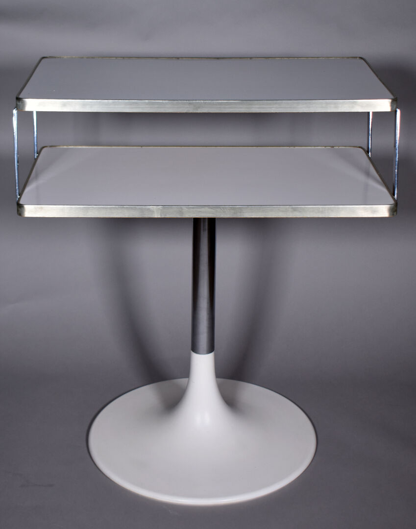 Meuble d’appoint en aggloméré laqué crème, à deux plateaux ceints de métal gris, piètement tulipe en pvc blanc. Dans le gout de Saarinen. Haut. : 80 cm – Larg. : 72 cm – Prof. : 46 cm.