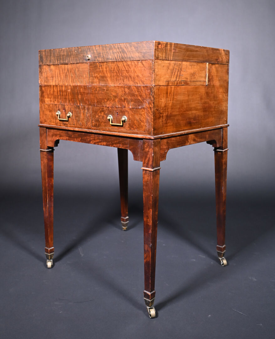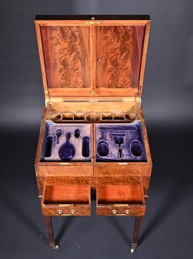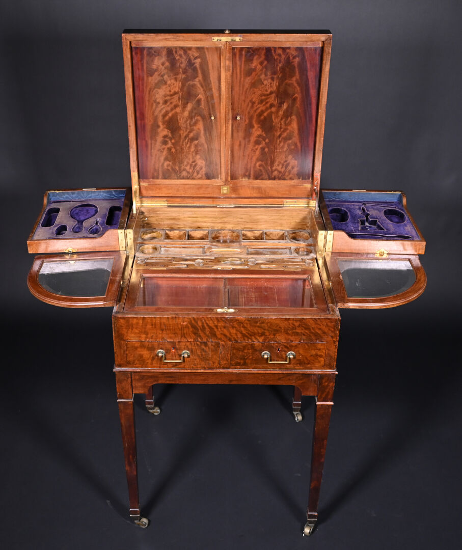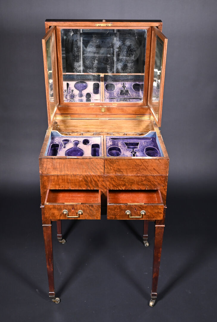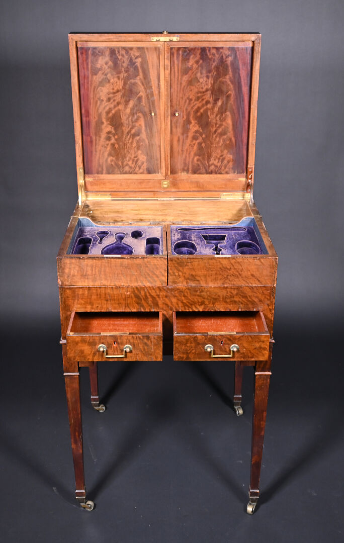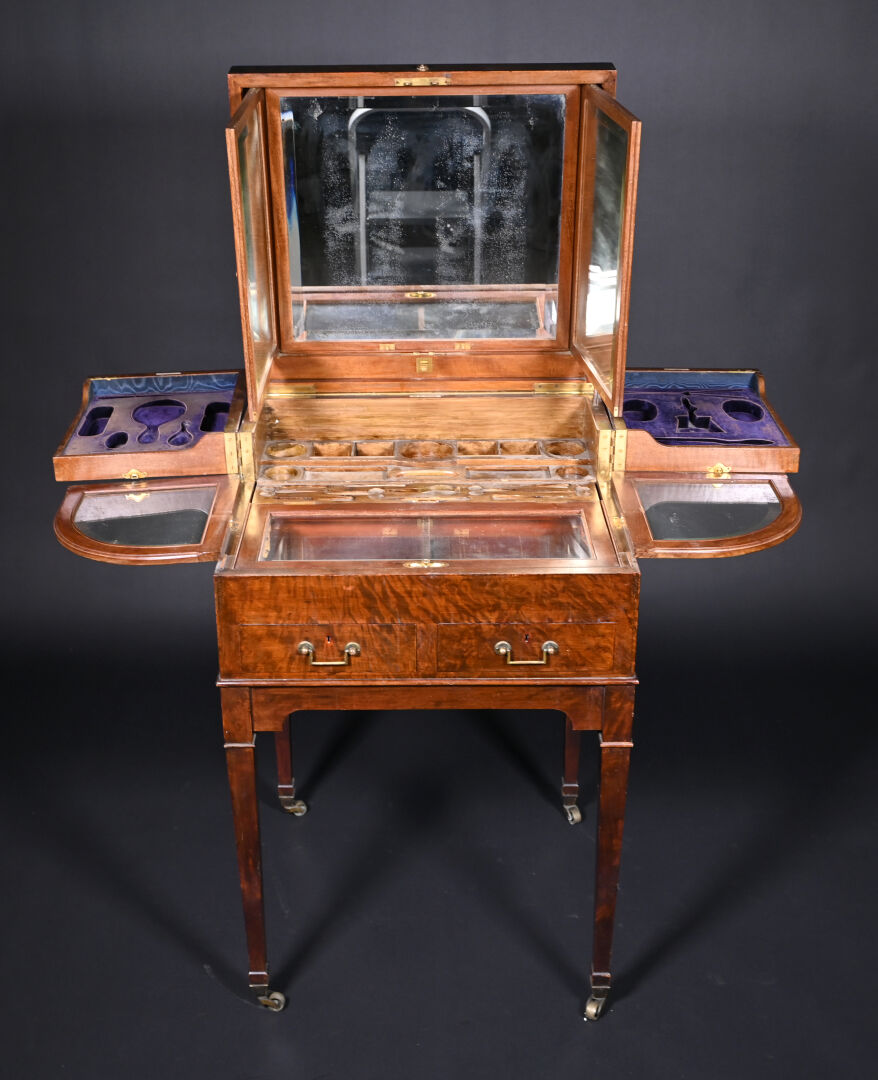 Meuble de toilette en acajou et placage d’acajou mouluré, le plateau brisé découvre un miroir tripartite et un intérieur aménagé à quatre plateaux pivotants, la ceinture ouvre par deux tiroirs, pieds en gaine munis de roulettes (usures d’usage, frottements, légers manques).